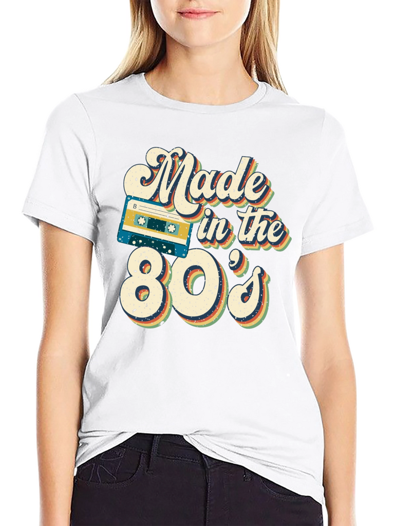 Rock a rad look with this vintage-inspired 'Made in the 80's' t-shirt! The design features a retro cassette tape graphic alongside stylized text, exuding classic 80s vibes. The black t-shirt makes the fun design pop. Perfect for everyday wear, parties, or as a nostalgic gift for anyone who loves the iconic 80s era. Get ready to turn heads and spark conversations with this unique and eye-catching t-shirt!