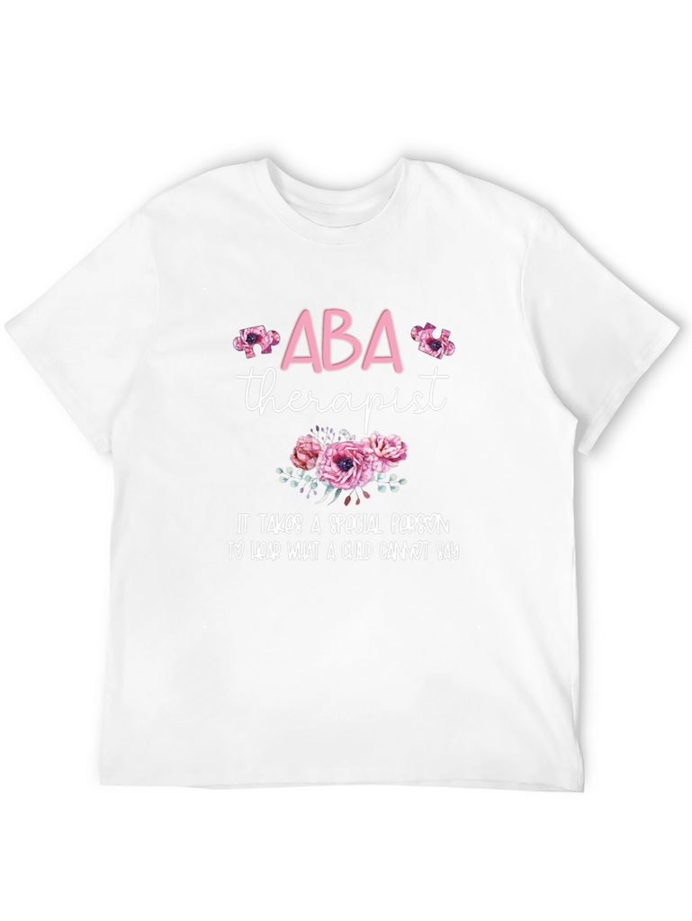 Show your support for ABA therapists with this stylish black t-shirt. The design features "ABA" in pink floral letters, followed by "therapist" in a delicate script font. Below is a beautiful floral arrangement and the heartwarming quote "It takes a special person to hear what a child cannot say." Made from comfortable material, this tee is perfect for everyday wear, whether you're an ABA therapist yourself, a supporter, or simply appreciate meaningful designs. A great way to express your care and dedication!
