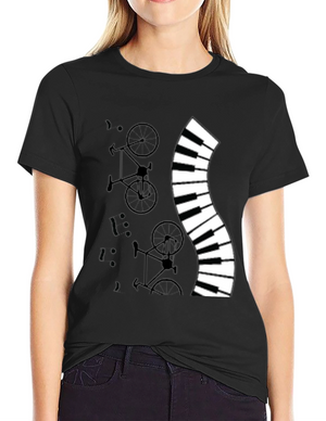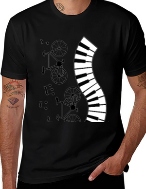 Mens Black T-Shirt with Piano and Bicycle Design