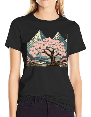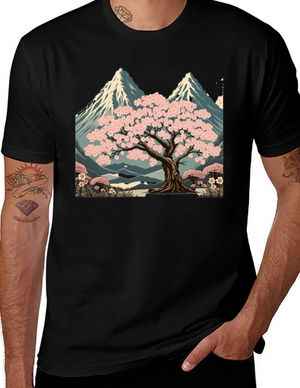 Sakura Tree & Mountain Graphic Black T-Shirt