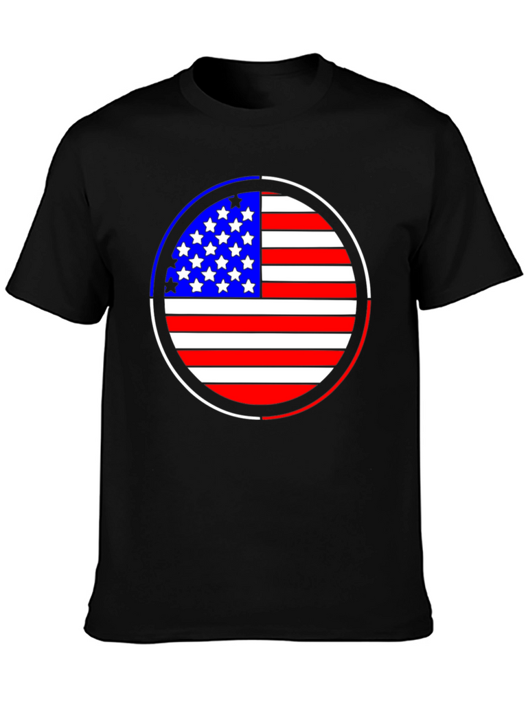 Show your patriotic side with this eye-catching American flag graphic tee. This stylish black t-shirt features a bold circular design incorporating the iconic stars and stripes of the US flag. The contrasting white and red accents add a touch of modern flair. Made from a comfortable, breathable fabric, this tee is perfect for everyday wear, casual outings, or celebrating national holidays. Whether you're attending a barbecue, showing your support at a rally, or simply expressing your American pride, this t-shirt is sure to make a statement. A must-have addition to any wardrobe!