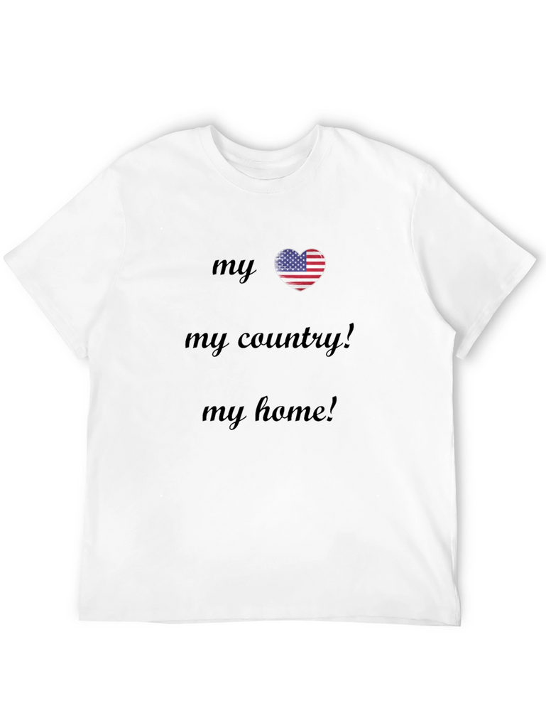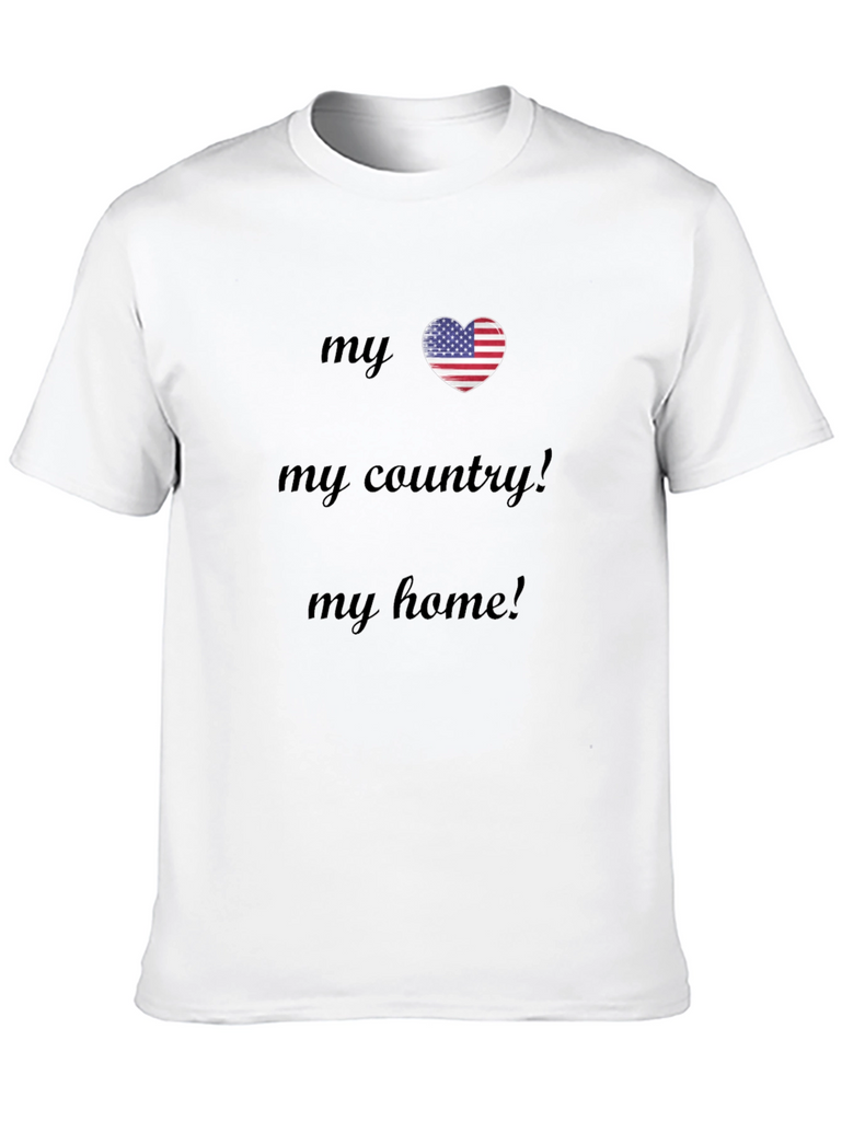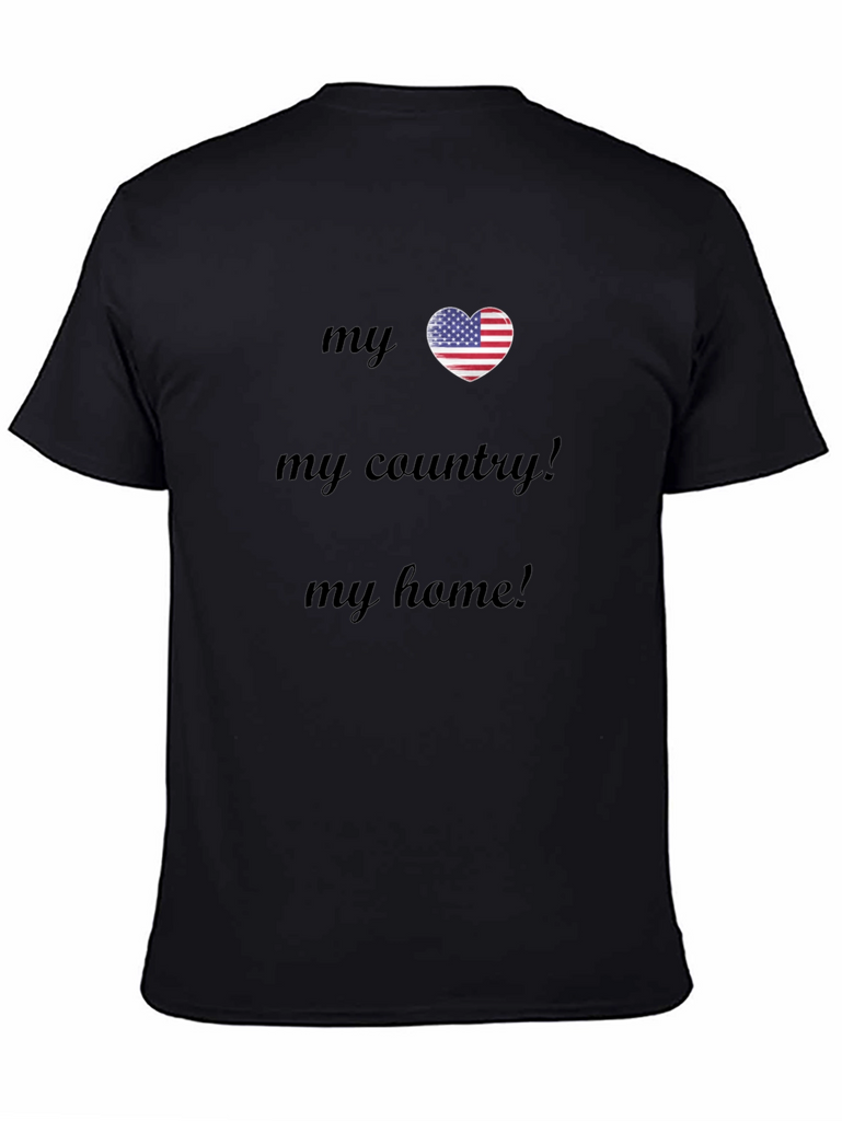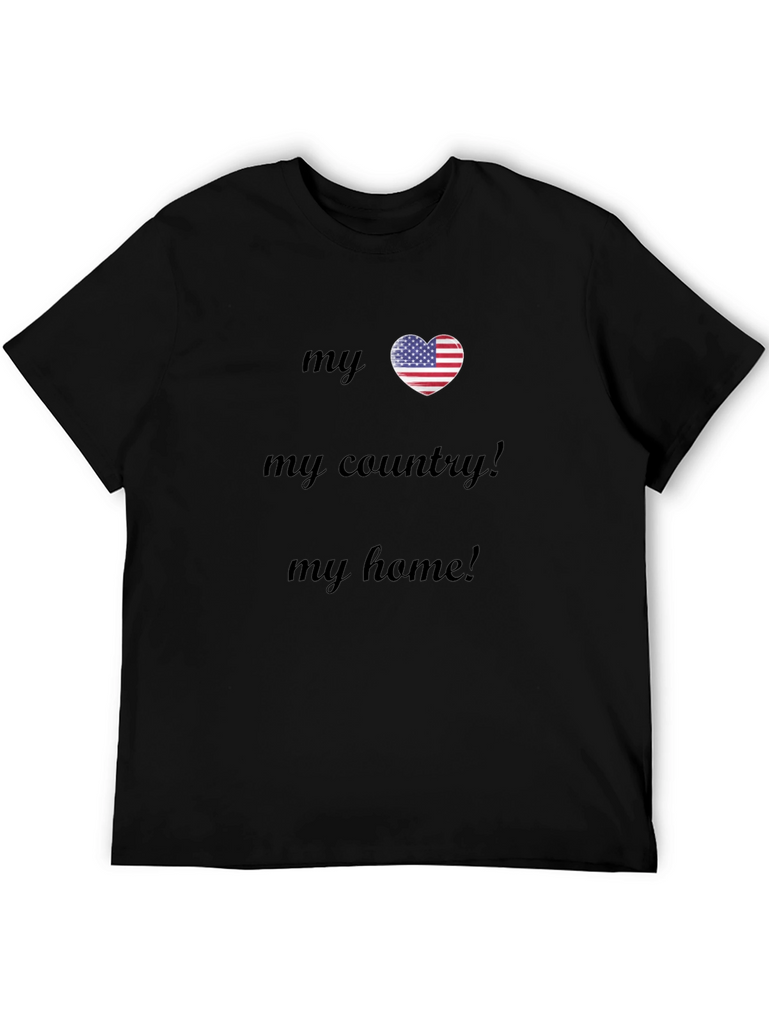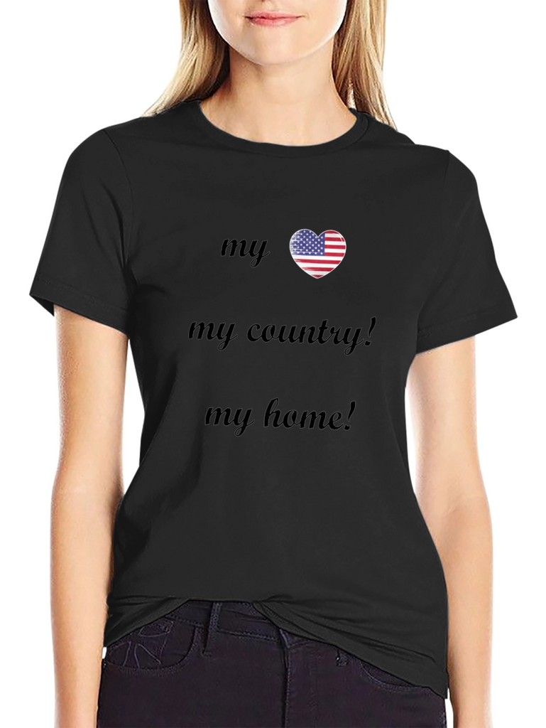Show off your love for the USA with this stylish black t-shirt. Featuring a heart-shaped American flag design, it's perfect for celebrating national holidays, expressing your patriotism, or simply adding a unique touch to your everyday wardrobe. The t-shirt showcases the phrase "my country! my home!" in a subtle and elegant font, making it a meaningful and fashionable piece. Made from a comfortable, lightweight material, this shirt offers a great fit and is ideal for casual wear. Get yours today and wear your pride!