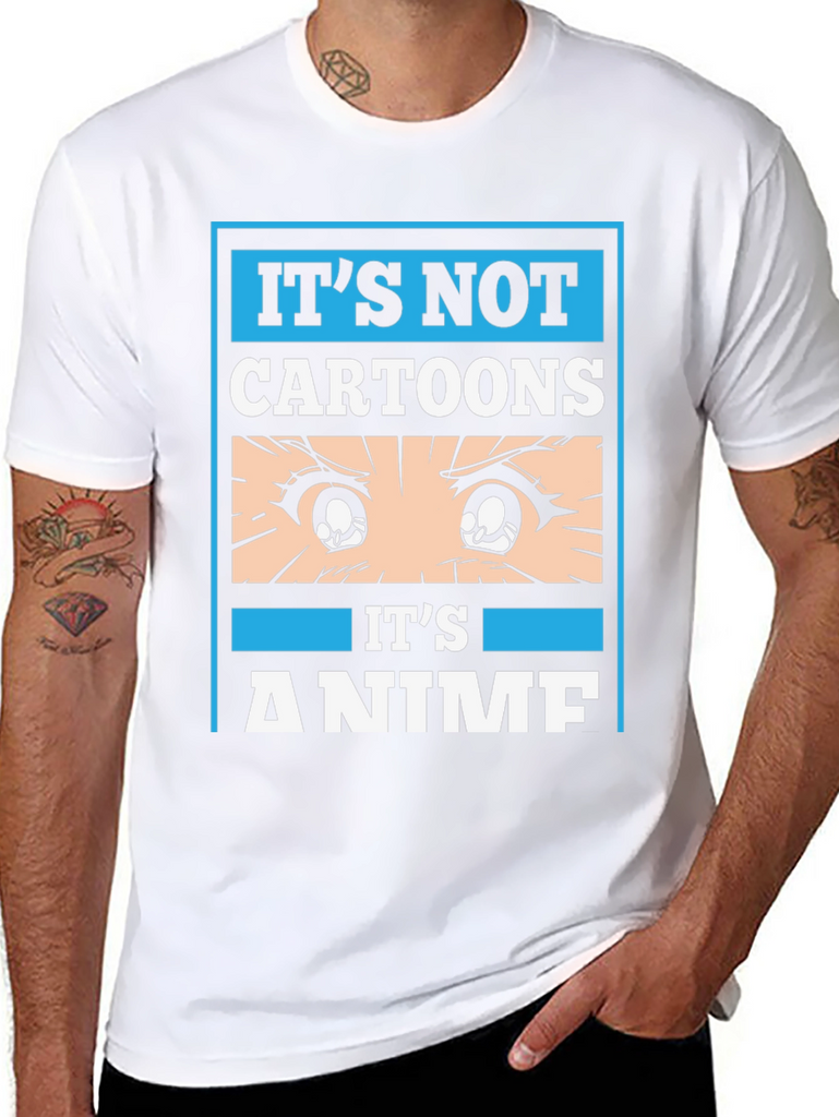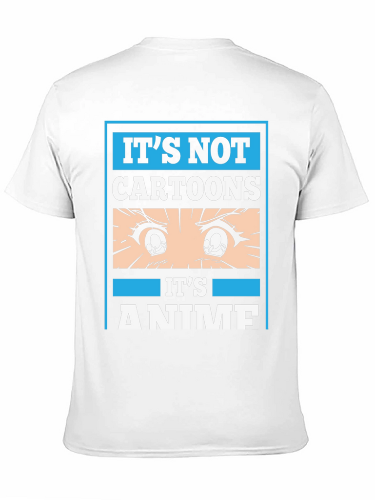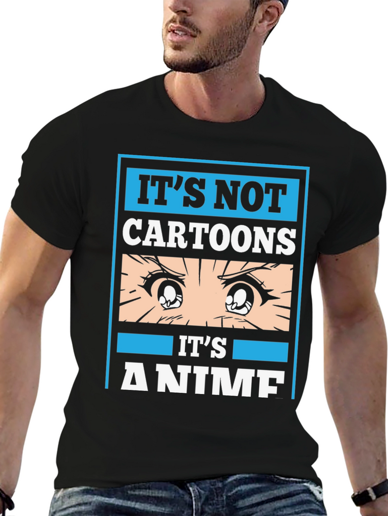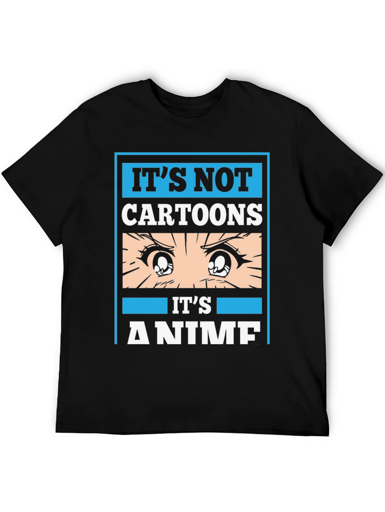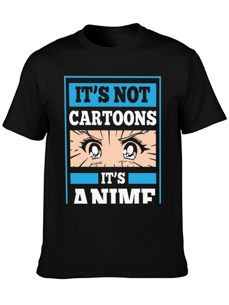 Show your love for anime with this stylish black t-shirt. The design features a vibrant graphic with the bold statement "It's Not Cartoons, It's Anime," complemented by expressive anime eyes. The text is printed in a crisp white against a striking blue background, making the message pop. Made from a comfortable, breathable fabric, this tee is perfect for casual wear, anime conventions, or simply expressing your passion for Japanese animation. A must-have addition to any anime fan's wardrobe. This t-shirt makes a statement!