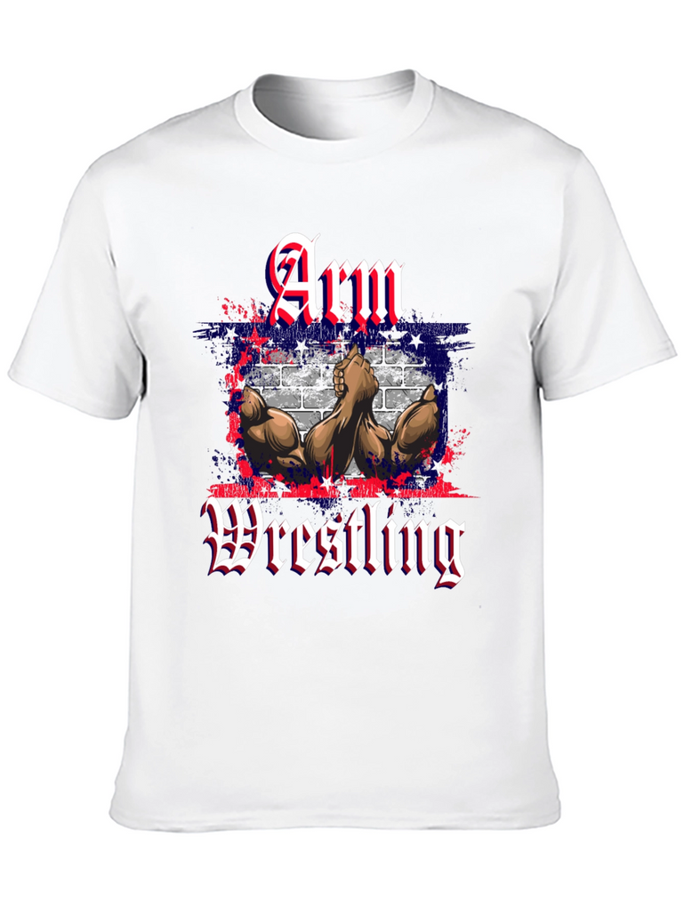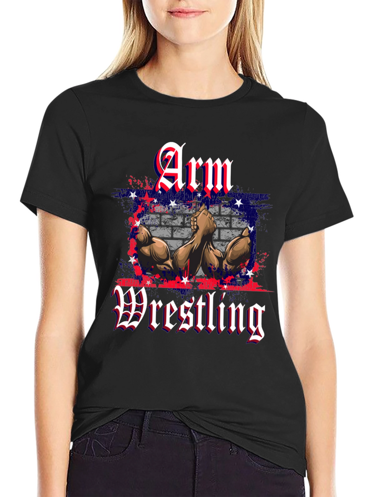 Show off your love for arm wrestling with this eye-catching black t-shirt. The design features bold "Arm Wrestling" text in a gothic font, overlaid on a stylized image of muscular arms in a wrestling pose, set against a backdrop of what appears to be an American flag-inspired brick wall design with red, white, and blue accents. This t-shirt is perfect for casual wear, gym sessions, or showing your passion for the sport. Made from comfortable materials, this shirt is a must-have for any arm wrestling enthusiast.