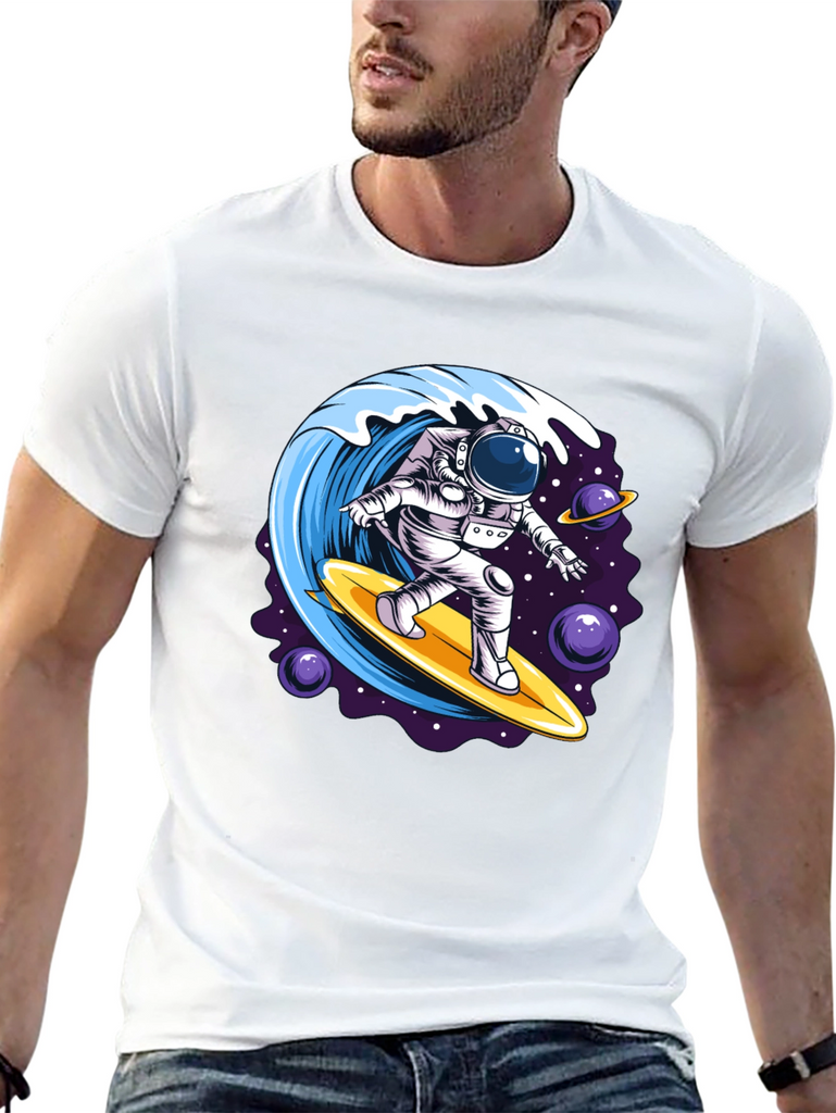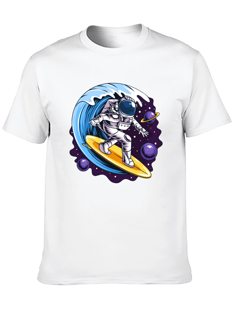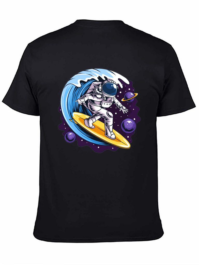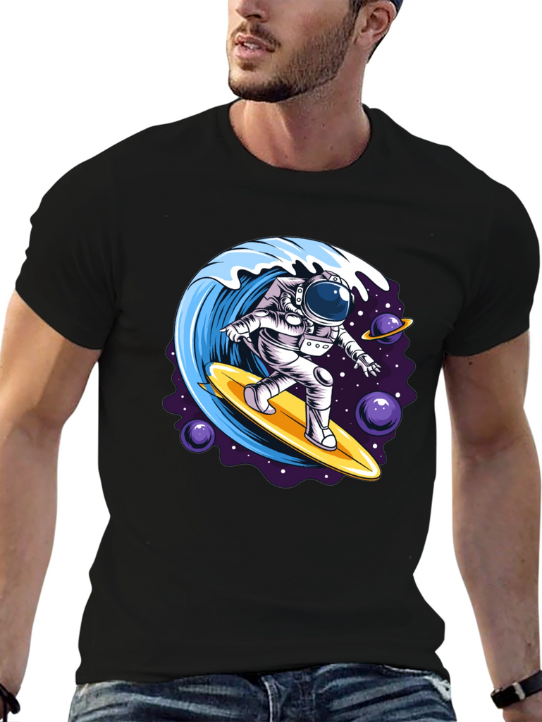Ride the cosmic wave with this eye-catching graphic t-shirt! Featuring a bold design of an astronaut shredding on a surfboard against a backdrop of swirling space and celestial bodies, this tee is sure to turn heads. The black color provides a sleek canvas for the vibrant graphic, making it a standout piece in any wardrobe. Made from what appears to be a soft and comfortable fabric, this shirt is perfect for casual wear, making a statement, or even as a unique gift for the space enthusiast in your life. Show off your adventurous spirit and love for all things cosmic with this stellar t-shirt!