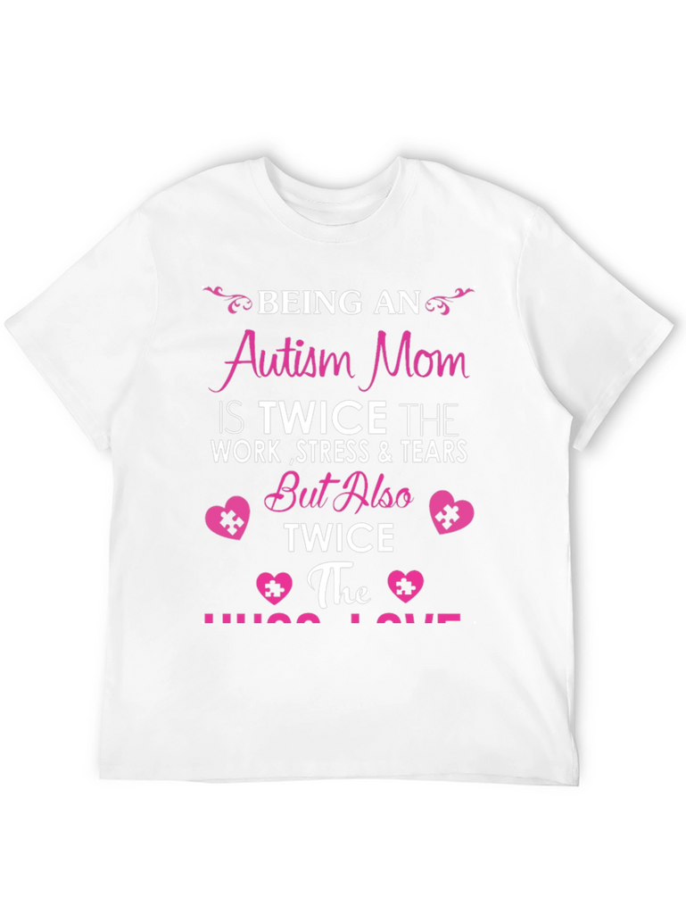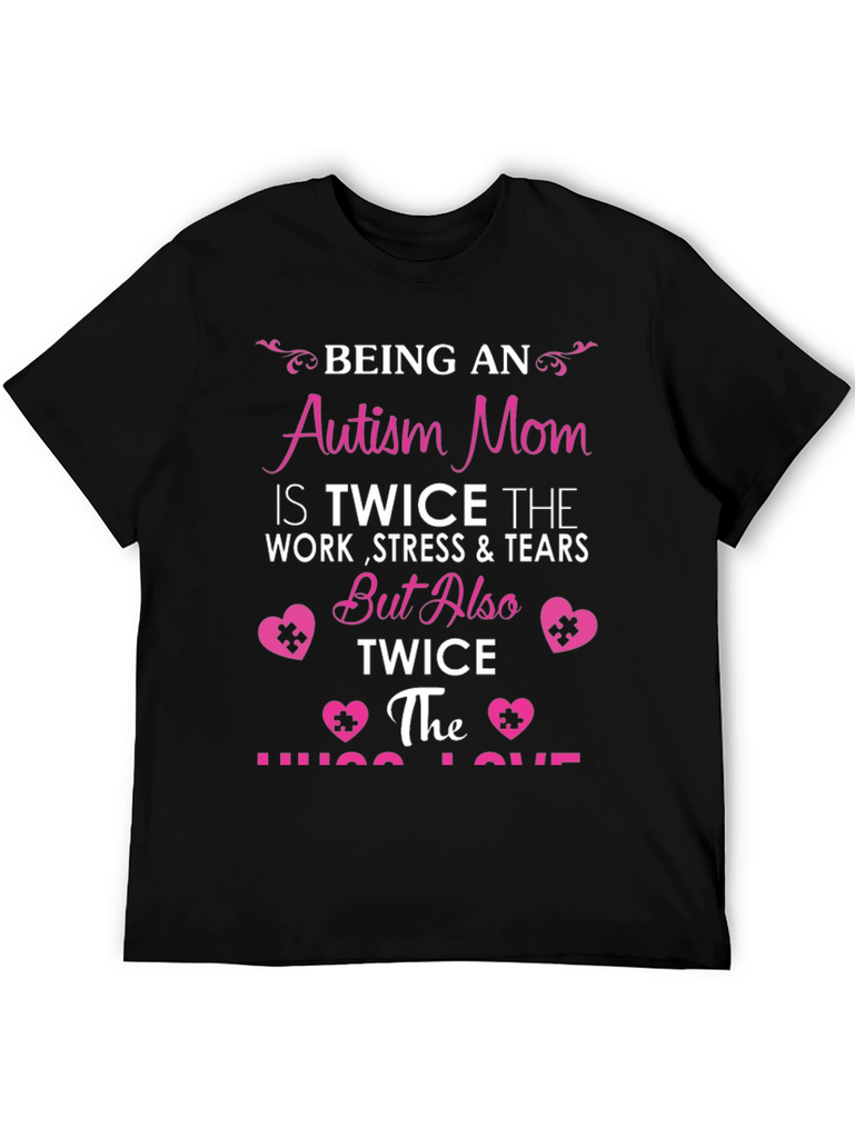 Show your support and love with this meaningful 'Autism Mom' t-shirt. The design features a bold pink font that reads "Being an Autism Mom is Twice the Work, Stress & Tears But Also Twice the Hugs & Love." It is adorned with heart shaped puzzle pieces. This comfortable tee is perfect for autism awareness events, casual wear, or as a heartfelt gift for a special mom. Wear your heart on your sleeve (or rather, on your chest!) and spread awareness with this stylish and supportive t-shirt. This T-shirt is predominantly black. Get yours today and make a statement!