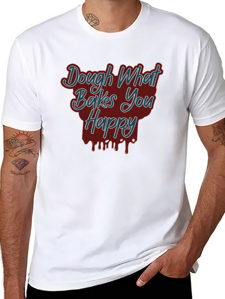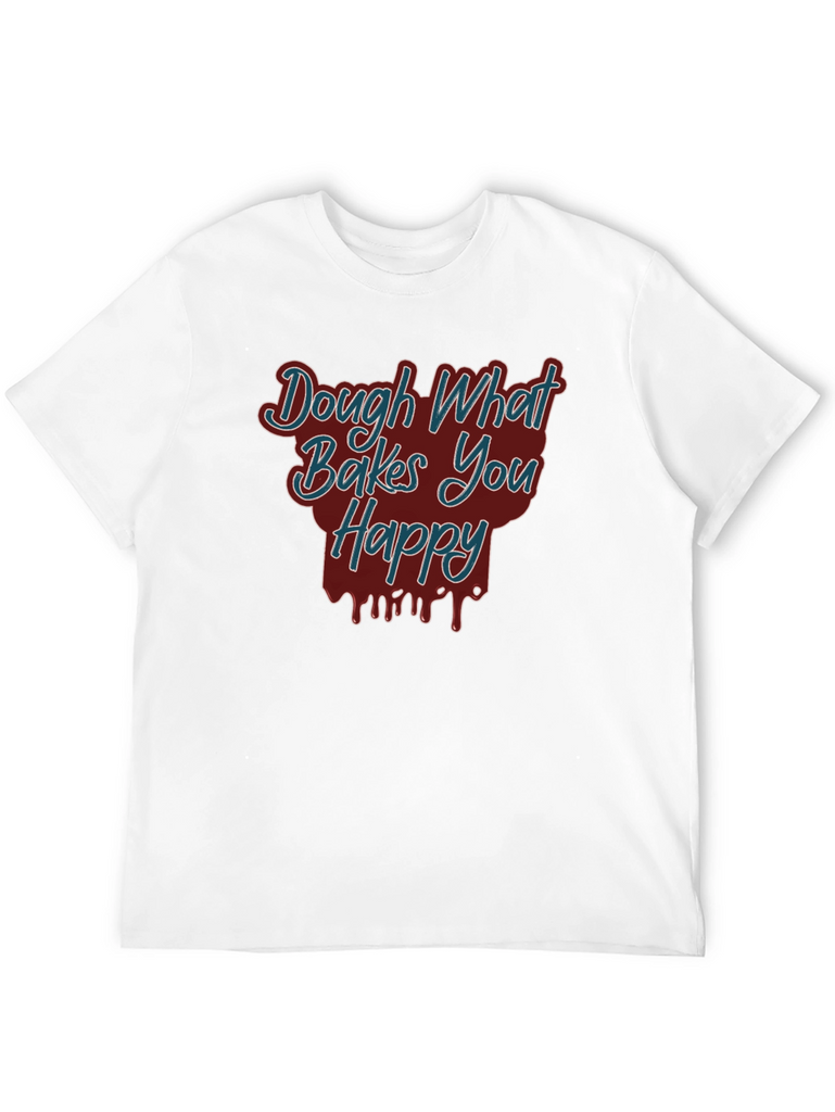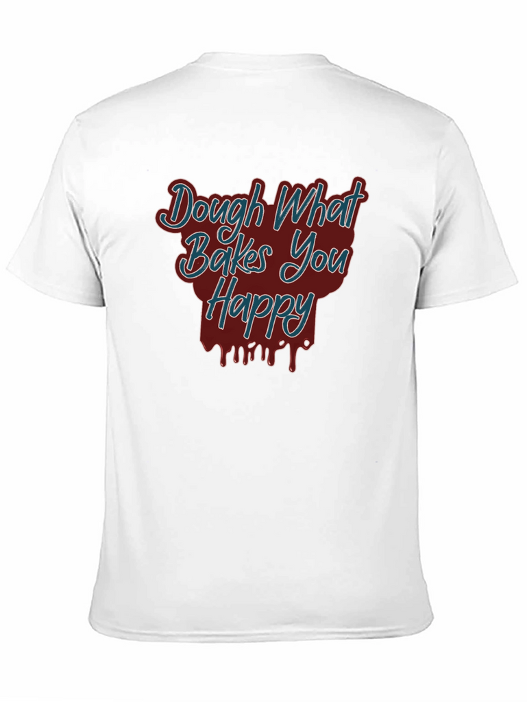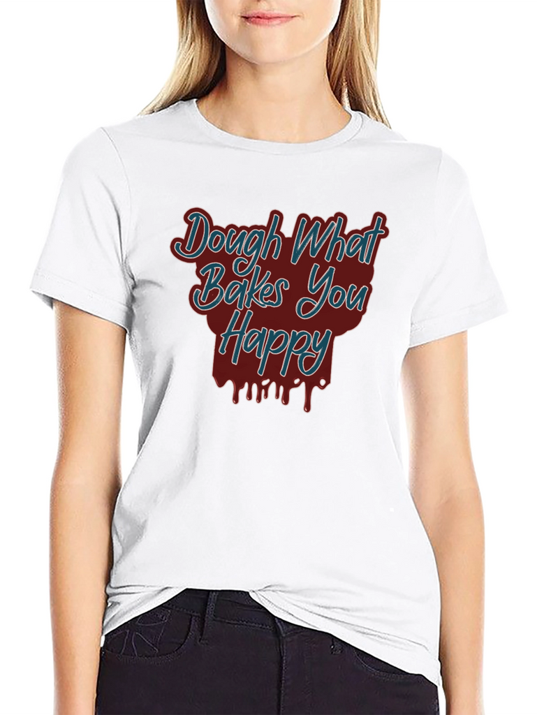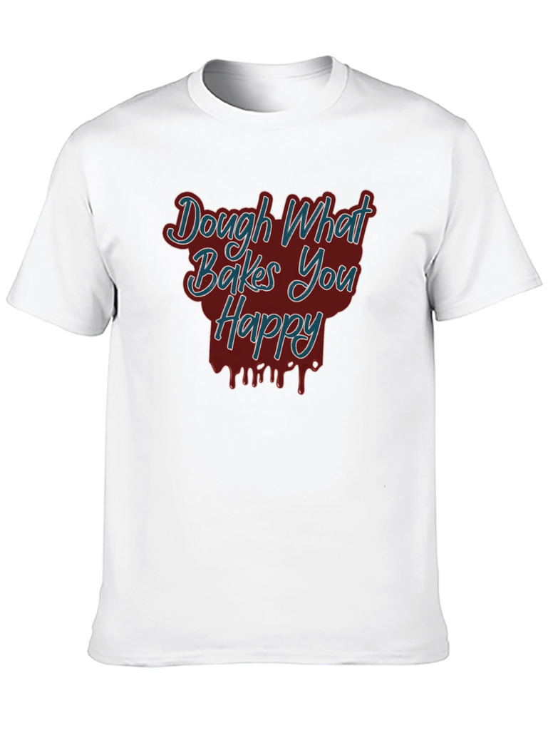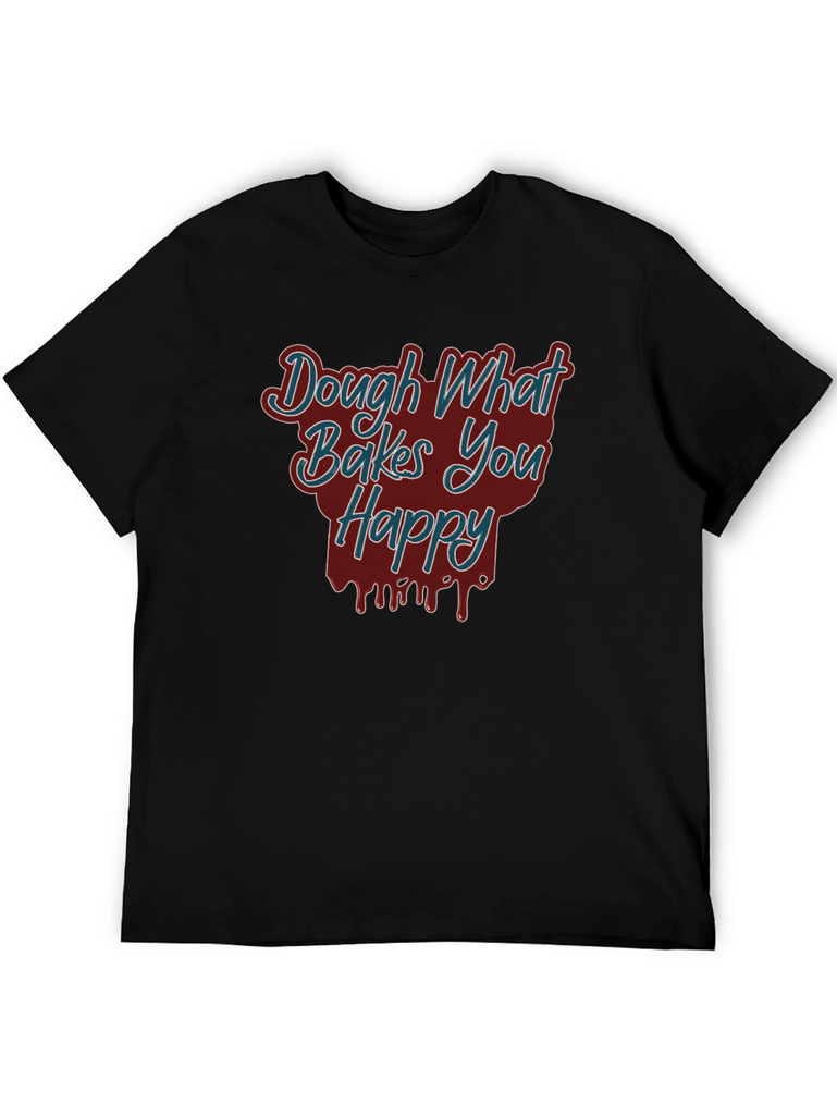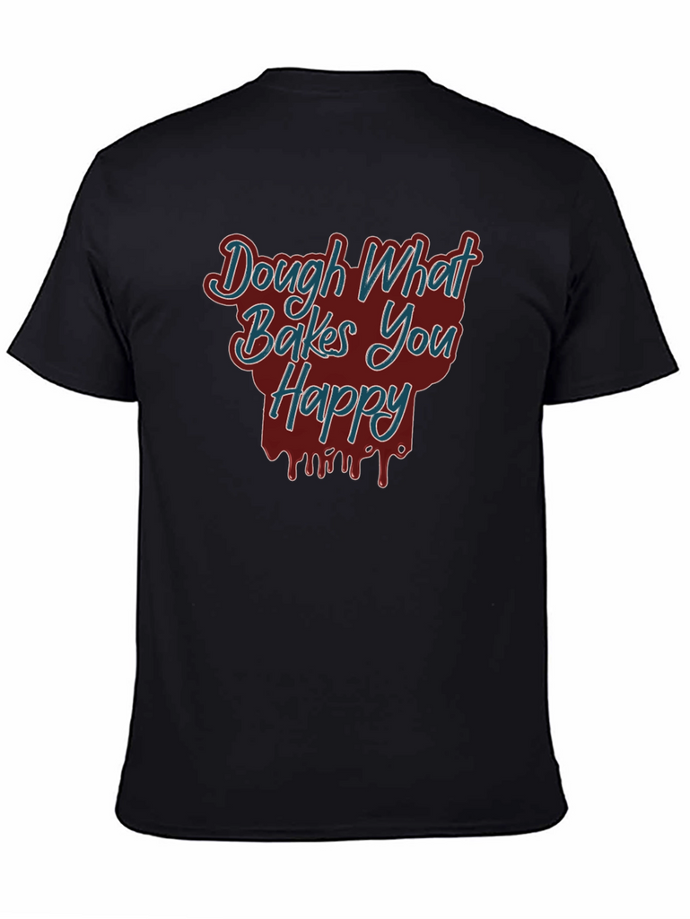 Indulge your passion for baking with this unique black t-shirt! Featuring the whimsical phrase "Dough What Bakes You Happy", this tee combines comfort and style effortlessly. The playful design is printed in a captivating blue with maroon outline, creating a visually appealing statement piece. Made from a soft and breathable fabric, this shirt ensures all-day comfort whether you're whipping up treats in the kitchen or running errands around town. Ideal for bakers, food enthusiasts, or anyone who appreciates a touch of humor in their wardrobe. Express your love for baking with this must-have tee!