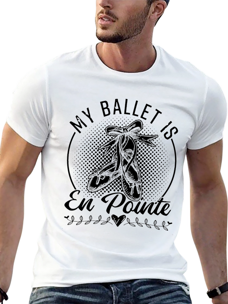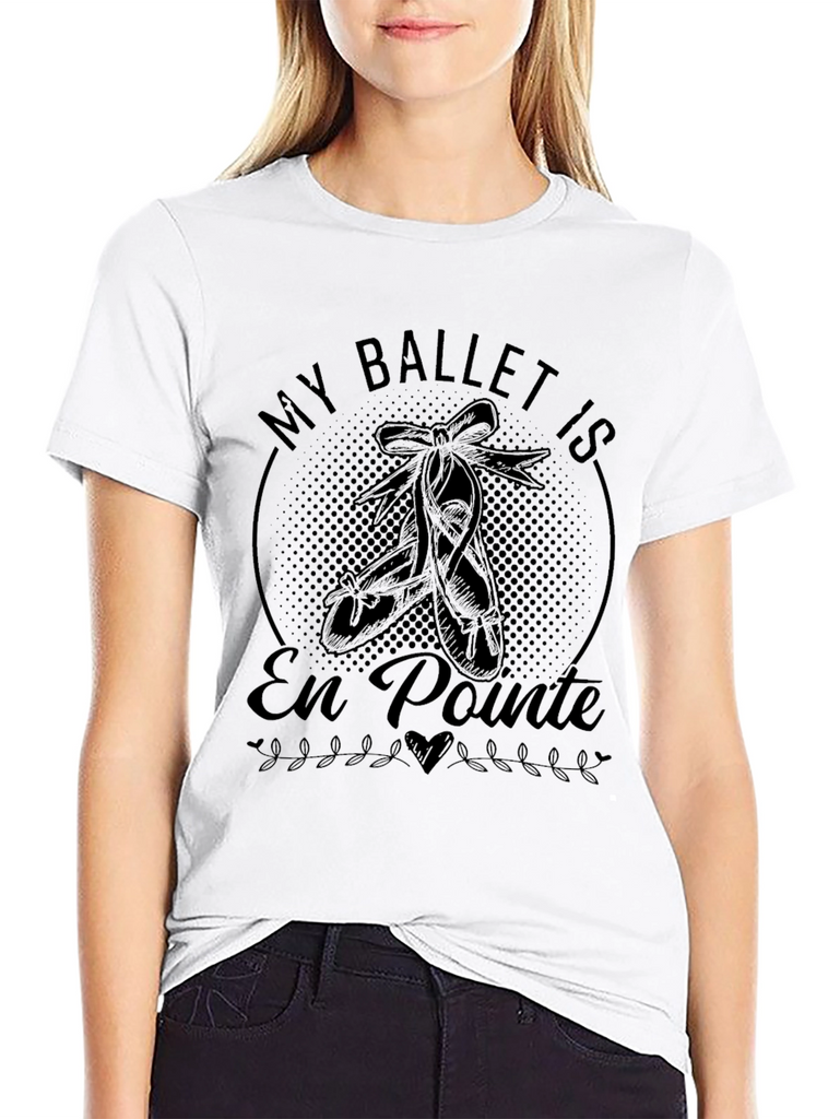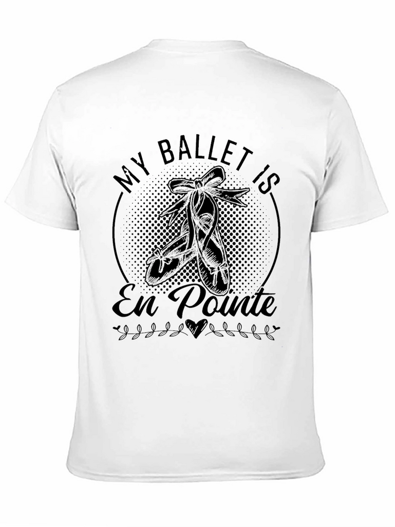 Show your love for ballet with this stylish graphic tee. Made from a soft, comfortable fabric, this black t-shirt features a unique design with ballet slippers and the phrase "My Ballet is En Pointe." The design is printed in a subtle black tone-on-tone style, creating a fashionable and eye-catching look. Perfect for dancers, ballet enthusiasts, or anyone who appreciates elegant design. Wear it to dance class, rehearsals, or as a casual statement piece. Express your passion for ballet with this trendy and comfortable tee!