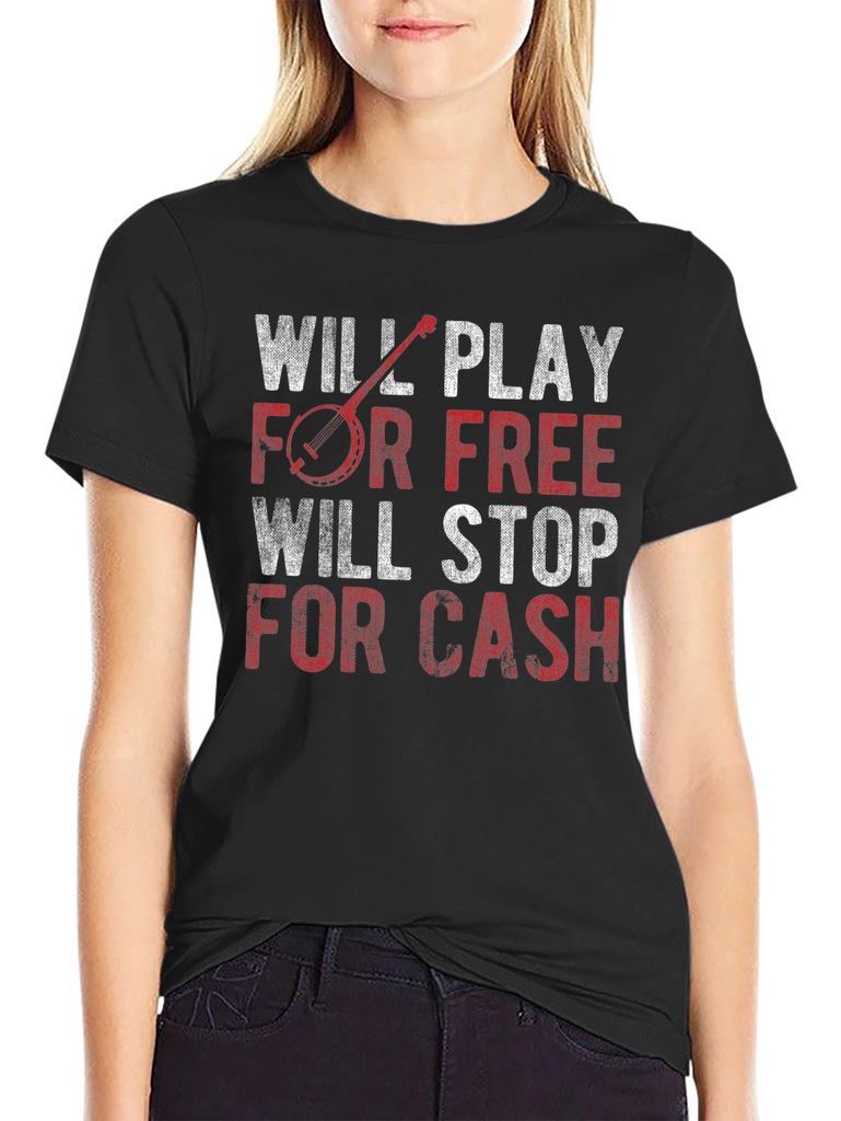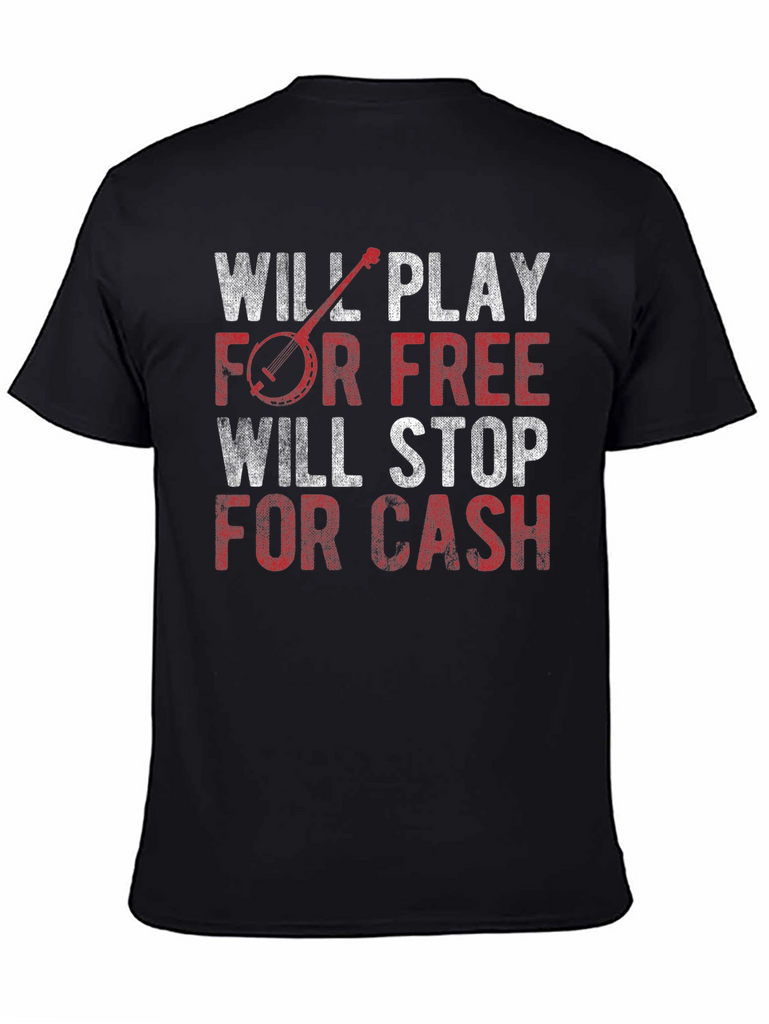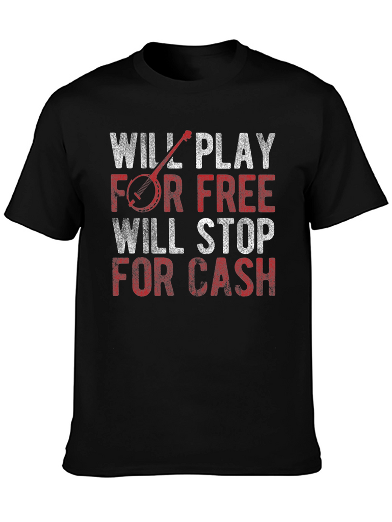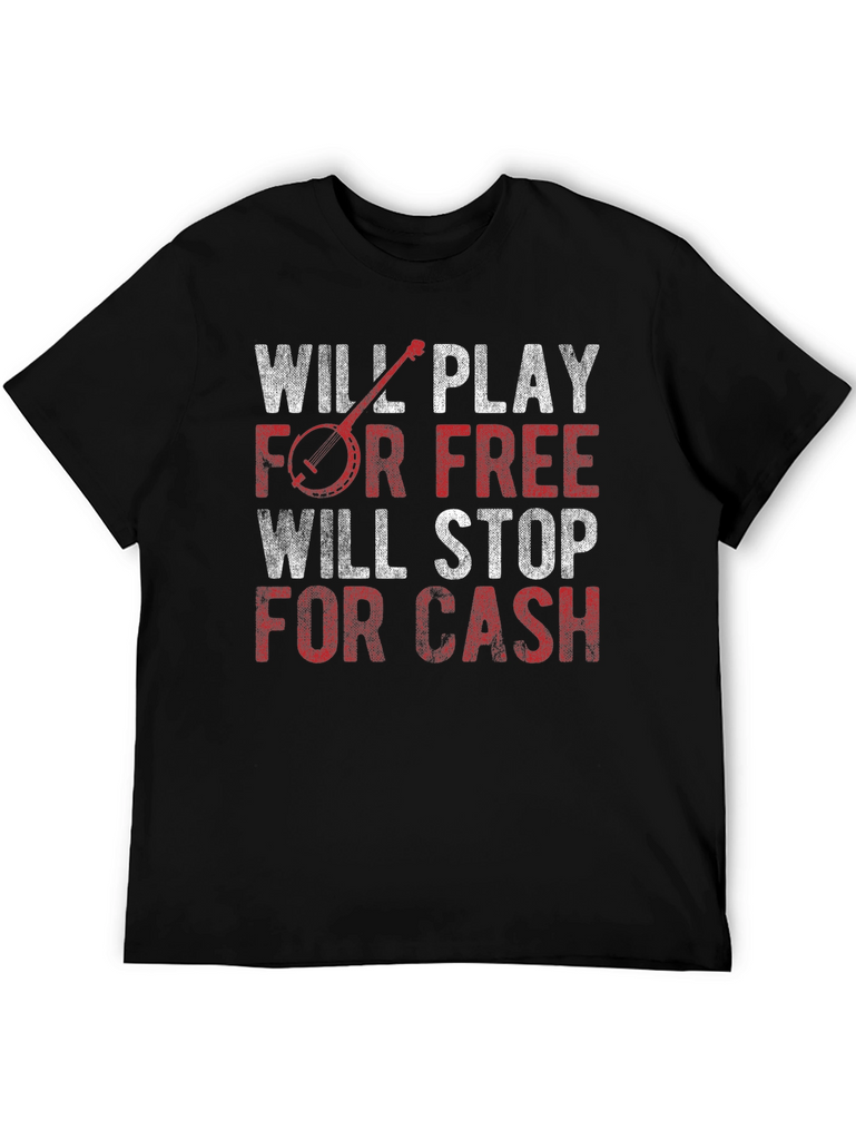 Show off your musical side with this eye-catching black t-shirt! Featuring the humorous phrase "Will Play For Free, Will Stop For Cash" in a distressed white and red print with a banjo graphic. This shirt is made from a soft, comfortable fabric, perfect for casual wear or music events. The design is unique and sure to spark conversation. Wear it while practicing, performing, or simply hanging out with fellow music lovers. Express your love for music and your playful side with this standout t-shirt!