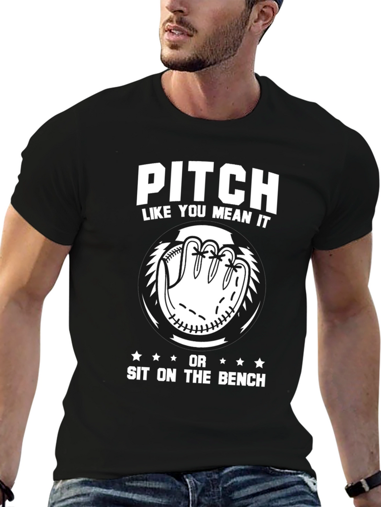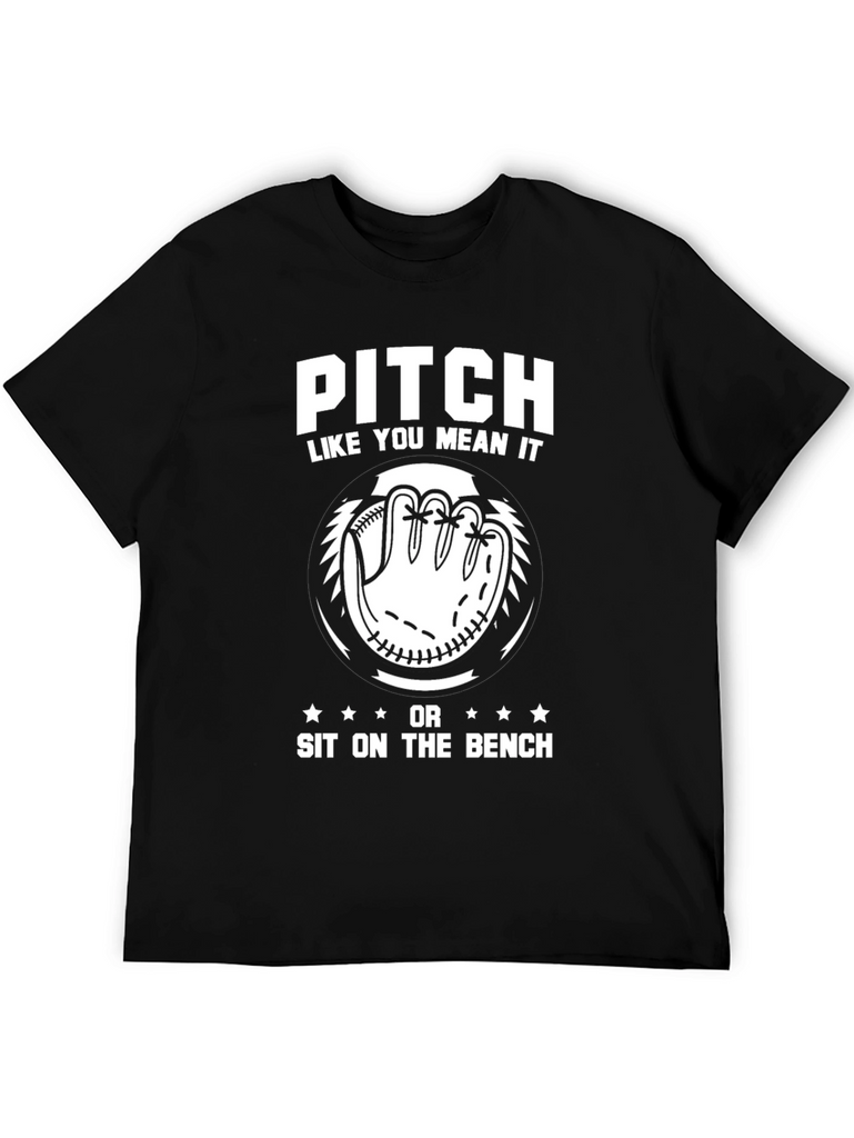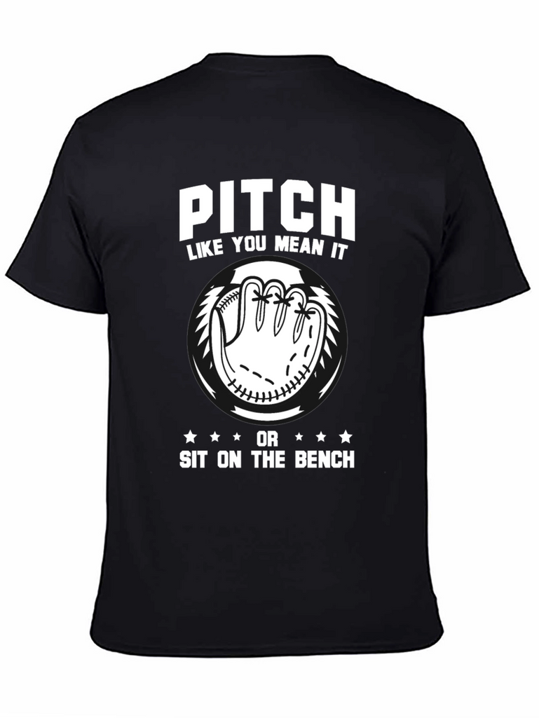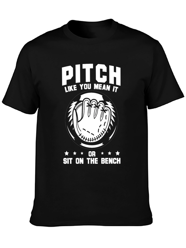 Showcase your love for baseball with this bold black t-shirt! Featuring a striking graphic design, this shirt sports the words "PITCH LIKE YOU MEAN IT" above and "OR SIT ON THE BENCH" below a vintage-style baseball glove illustration. Perfect for players and fans alike, the comfortable fit and eye-catching design make it ideal for game days, practices, or casual wear. Wear your passion and make a statement with this must-have t-shirt!