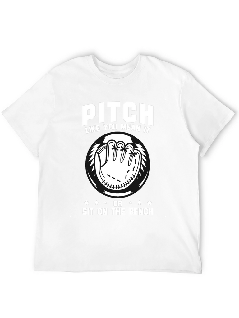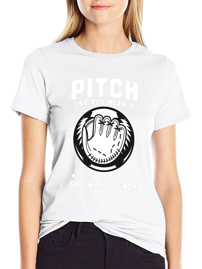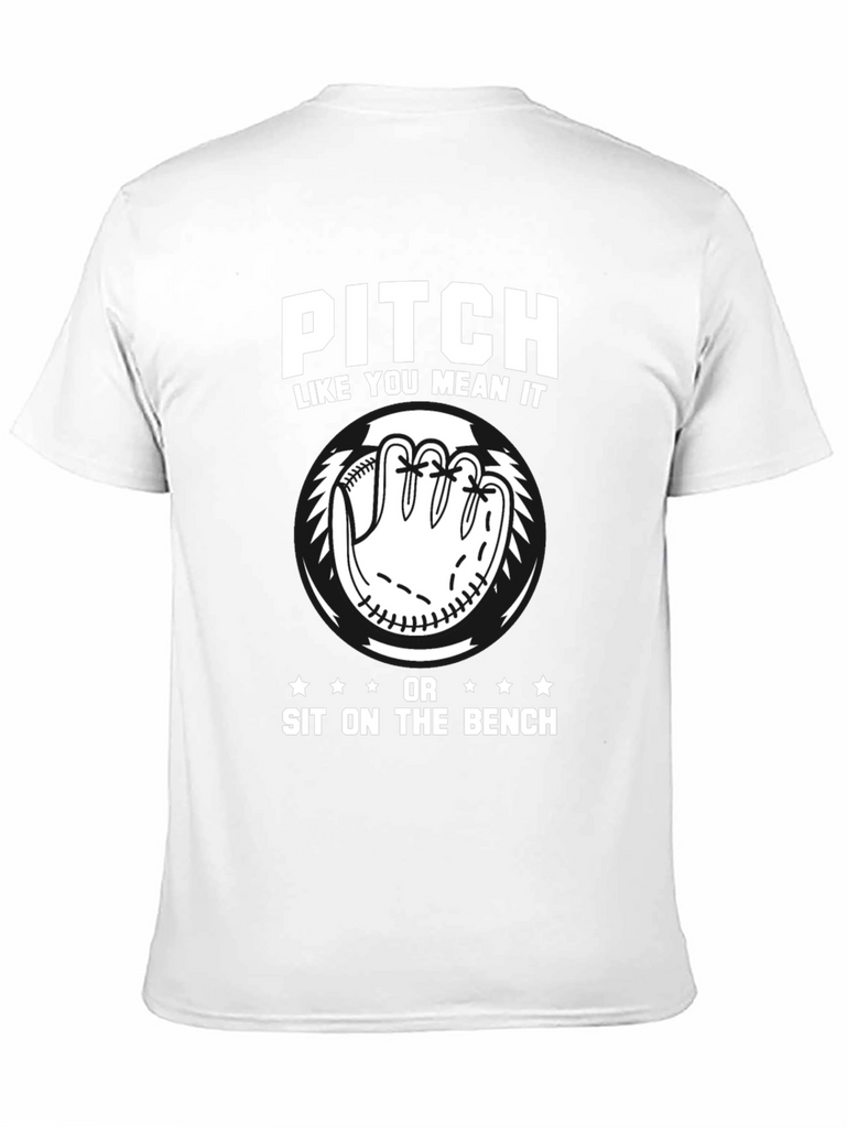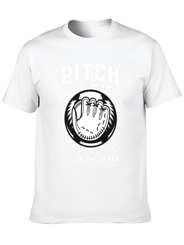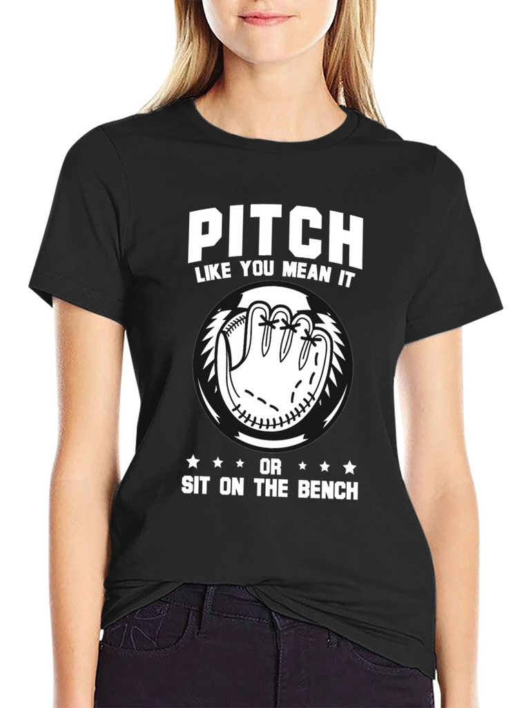 Showcase your love for baseball with this bold black t-shirt! Featuring a striking graphic design, this shirt sports the words "PITCH LIKE YOU MEAN IT" above and "OR SIT ON THE BENCH" below a vintage-style baseball glove illustration. Perfect for players and fans alike, the comfortable fit and eye-catching design make it ideal for game days, practices, or casual wear. Wear your passion and make a statement with this must-have t-shirt!