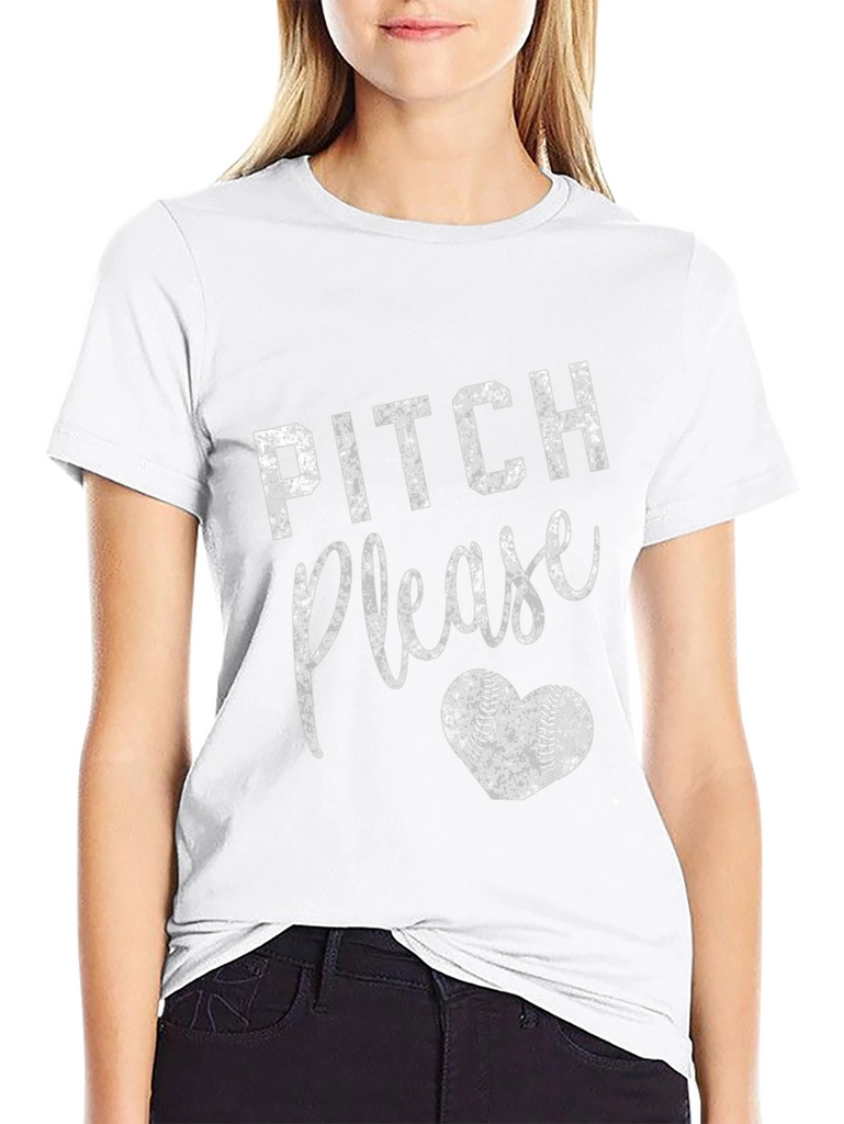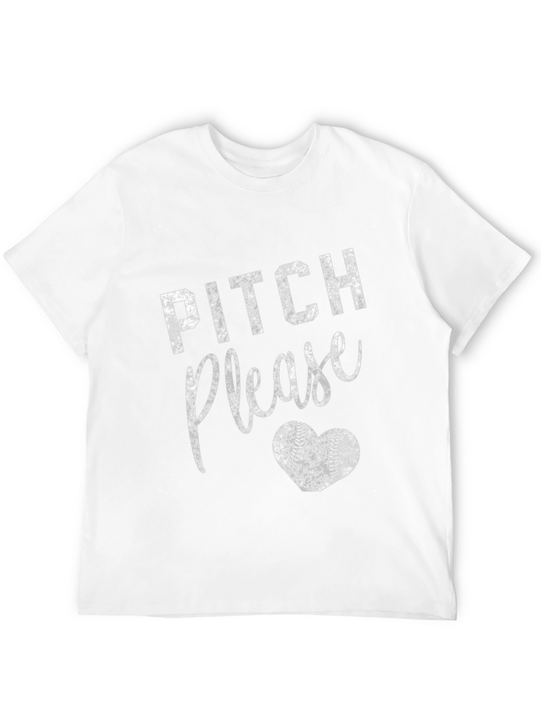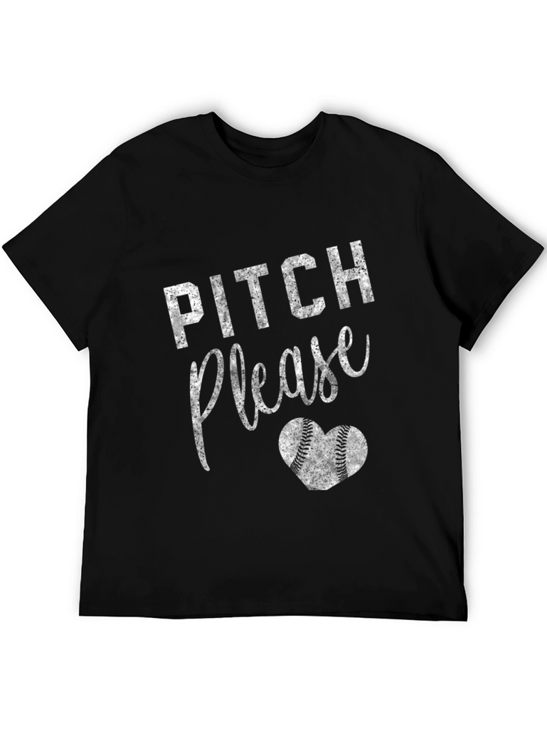 Show off your love for baseball with this stylish black graphic tee. The shirt features the phrase "Pitch Please" in a distressed white font, accompanied by a heart-shaped baseball graphic. Made from comfortable and breathable fabric, this t-shirt is perfect for casual wear, sports events, or showing your team spirit. Its unique design and eye-catching print make it a great conversation starter and a standout addition to any wardrobe. This tee is ideal for baseball fans, players, or anyone who enjoys sporty and trendy apparel. Get ready to hit a home run in style!