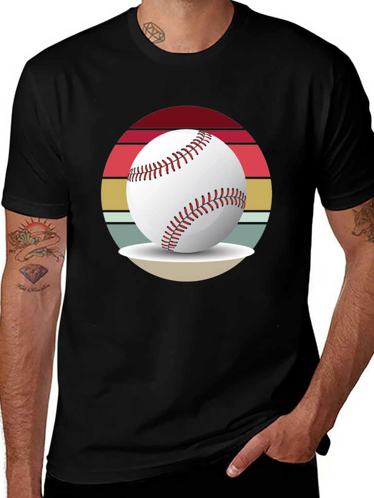 Show off your love for the game with this stylish black t-shirt. The shirt features a unique retro design with a baseball illustration set against a multi-colored, sunset-inspired backdrop. The classic crew neck and comfortable fit make it perfect for casual wear or showing team spirit at the ballpark. Made from soft, breathable fabric, this shirt will keep you comfortable all day long. Whether you're a player or a fan, this baseball tee is a must-have addition to your wardrobe. Great for any occasion.