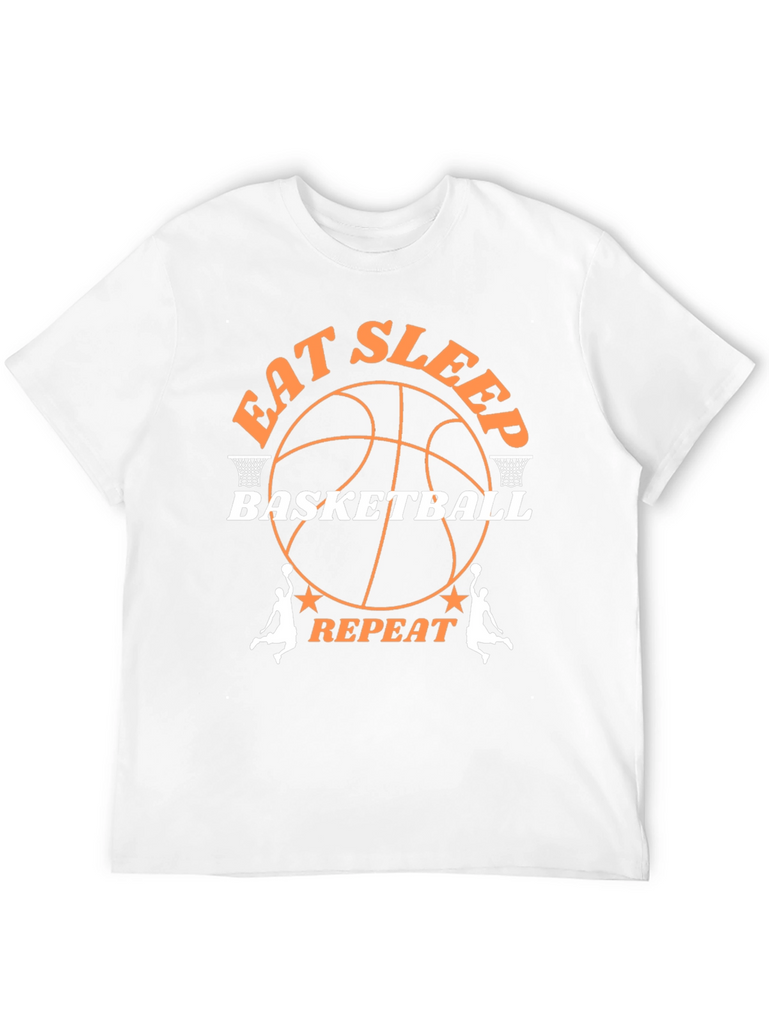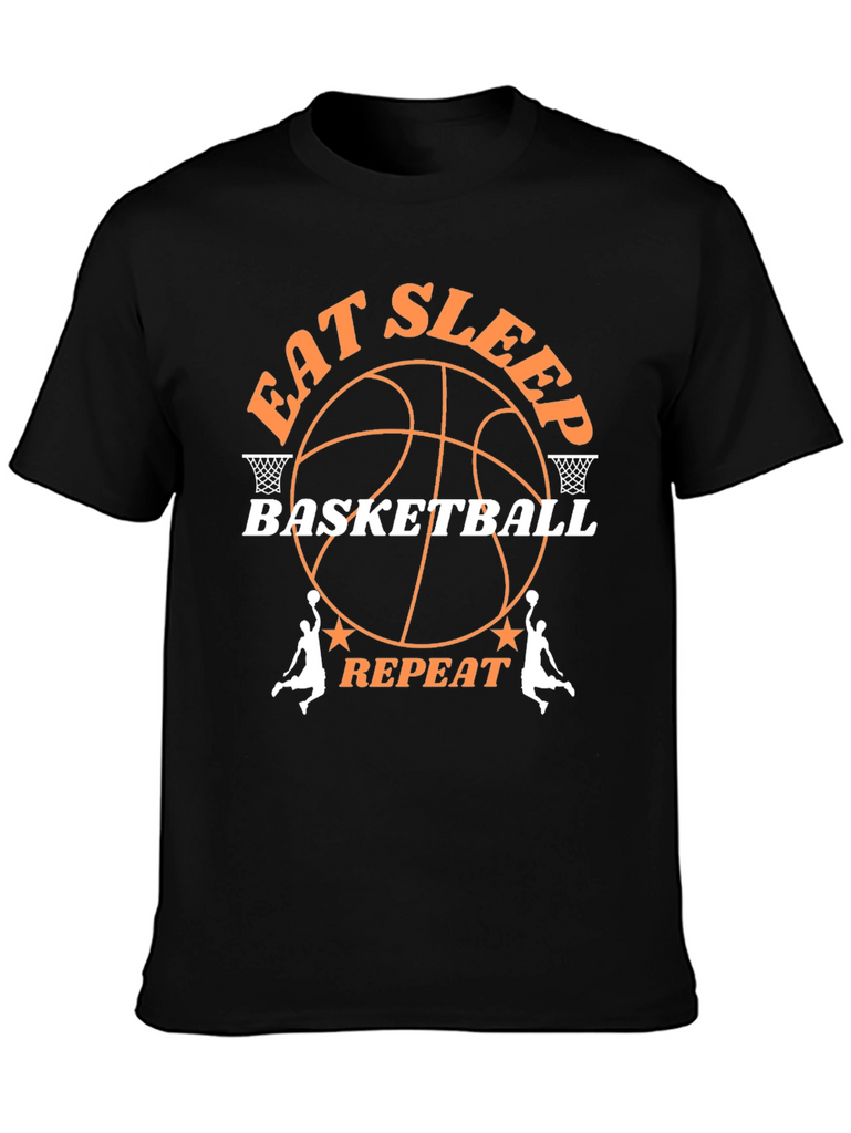 Showcase your love for basketball with this stylish graphic t-shirt. The black tee features a bold, orange and white design that reads "Eat Sleep Basketball Repeat", complete with a basketball graphic and basketball hoop accents. Made from comfortable, breathable fabric, this shirt is perfect for everyday wear, whether you're on the court, at the gym, or just hanging out. Its eye-catching design is sure to turn heads and spark conversations. Makes a great gift for basketball players, fans, and anyone who loves the game.