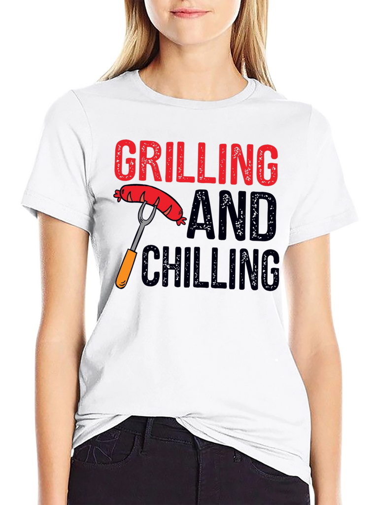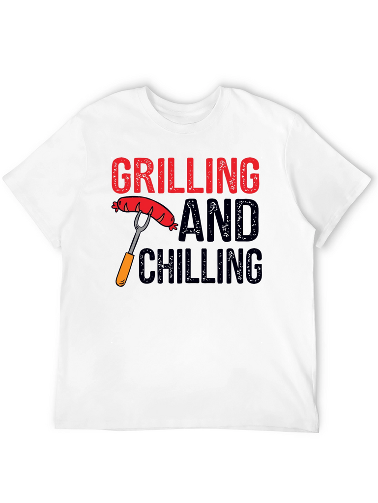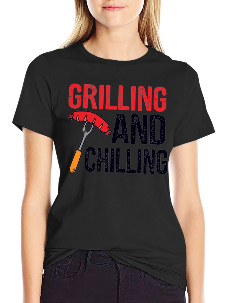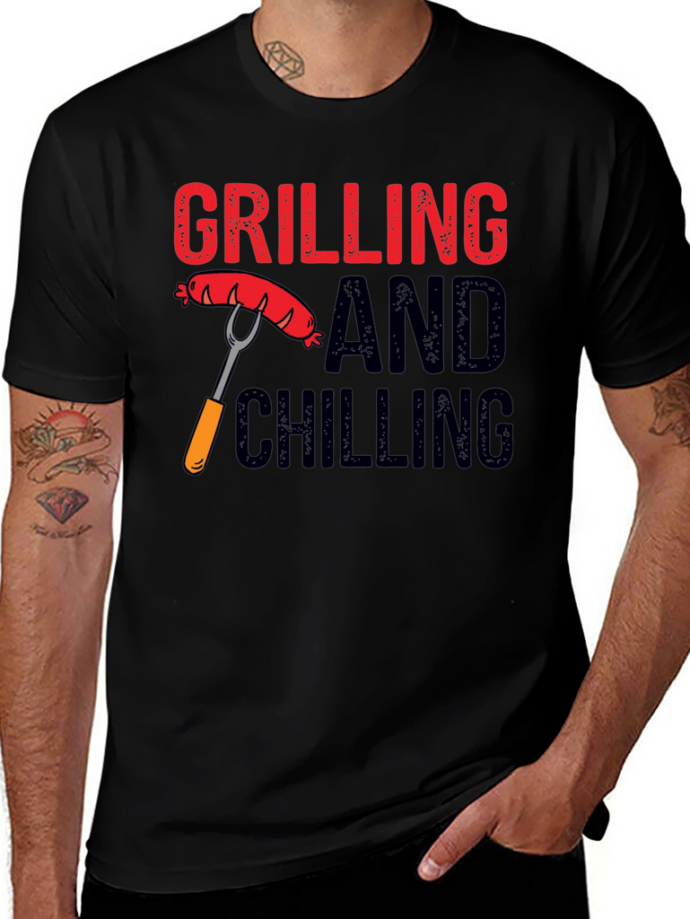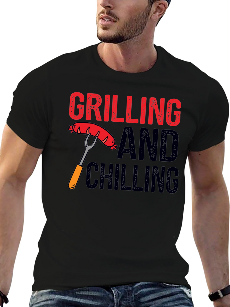 Show off your love for BBQ with this fun and stylish graphic tee. This black t-shirt features the words 'Grilling and Chilling' in a bold font, accompanied by an image of a delicious sausage on a fork. Perfect for backyard barbecues, summer cookouts, or casual everyday wear. Made from a soft, comfortable fabric, this shirt is sure to become a favorite in your wardrobe. A great gift idea for grill masters and BBQ enthusiasts alike! Get yours today and let the grilling season begin!