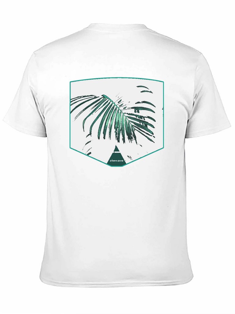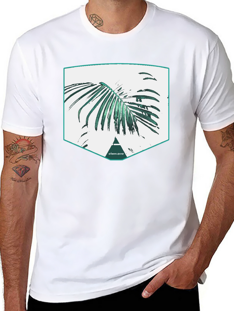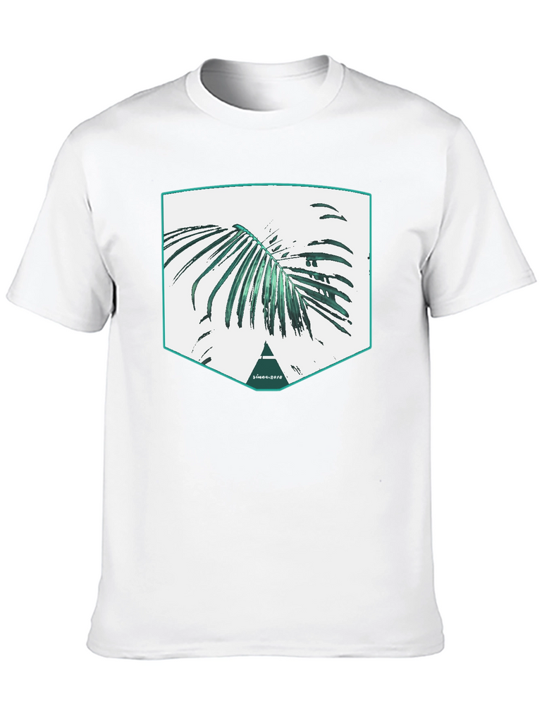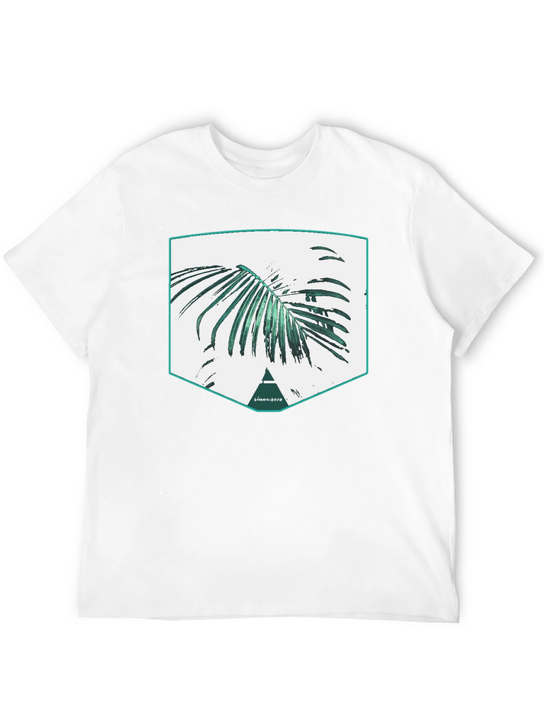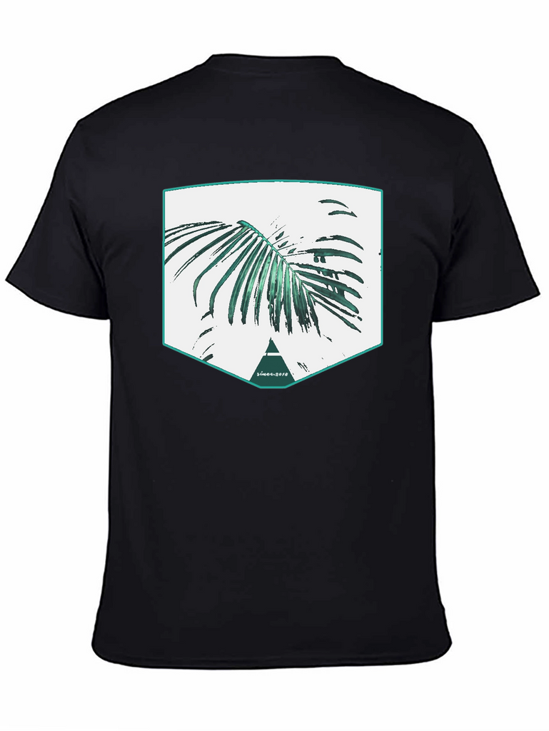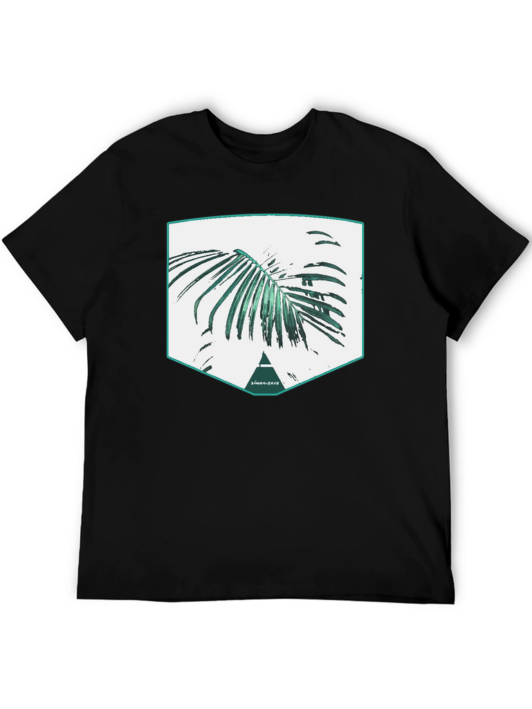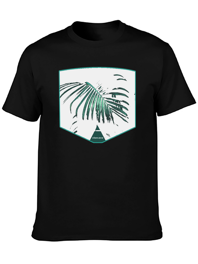Elevate your casual style with this striking black t-shirt featuring a unique palm leaf graphic print. The design showcases a vibrant green palm frond set against a crisp white backdrop, framed by a modern geometric shape with a teal border. Made from soft, breathable fabric, this tee offers all-day comfort and effortless style. The tee is perfect for making a statement whether you're heading to the beach, meeting friends, or simply relaxing at home. Pair it with jeans, shorts, or chinos for a versatile look.