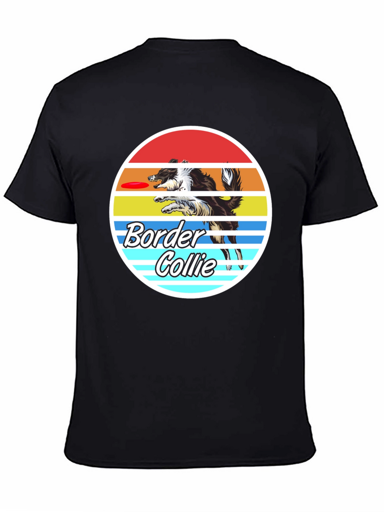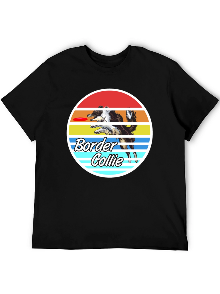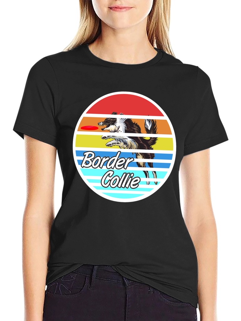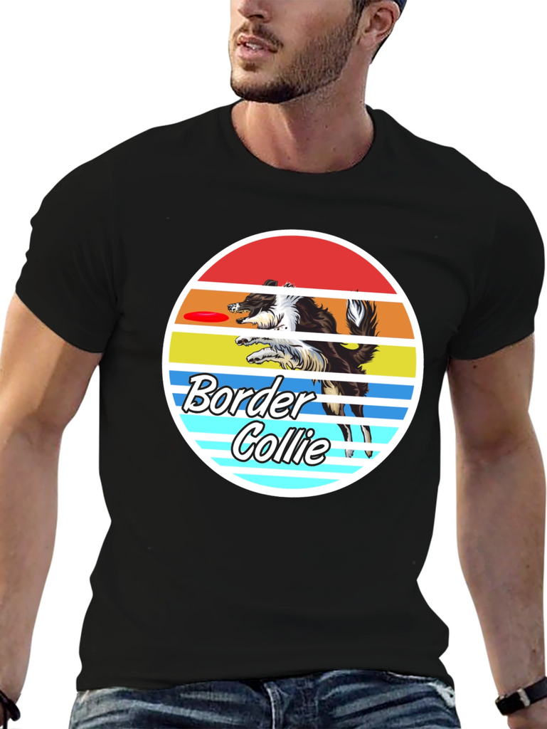 Show off your love for Border Collies with this stylish graphic tee! This black t-shirt features a vibrant retro design of a Border Collie catching a frisbee, set against a colorful striped background. The design is eye-catching, with the words "Border Collie" prominently displayed. Made from comfortable materials, this shirt is perfect for casual wear, dog walks, or simply lounging around. This unique tee is a must-have for any Border Collie enthusiast. Wear it with pride and let everyone know about your favorite breed!