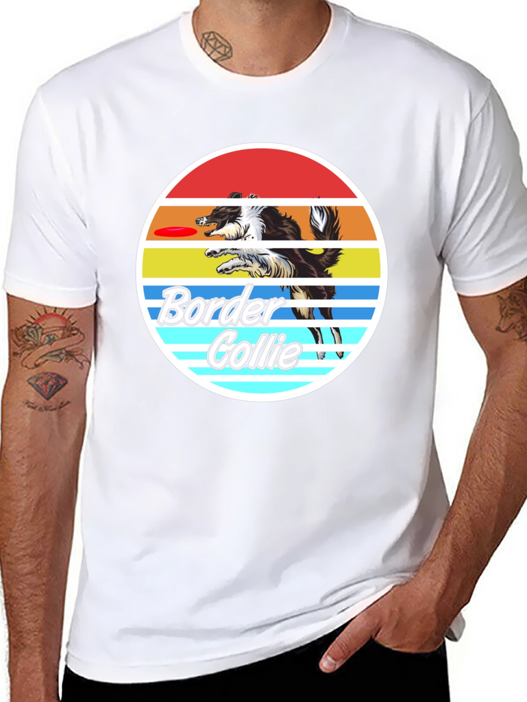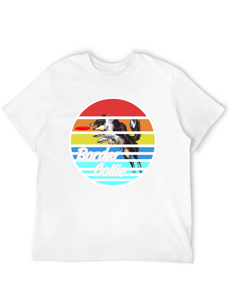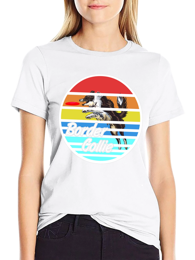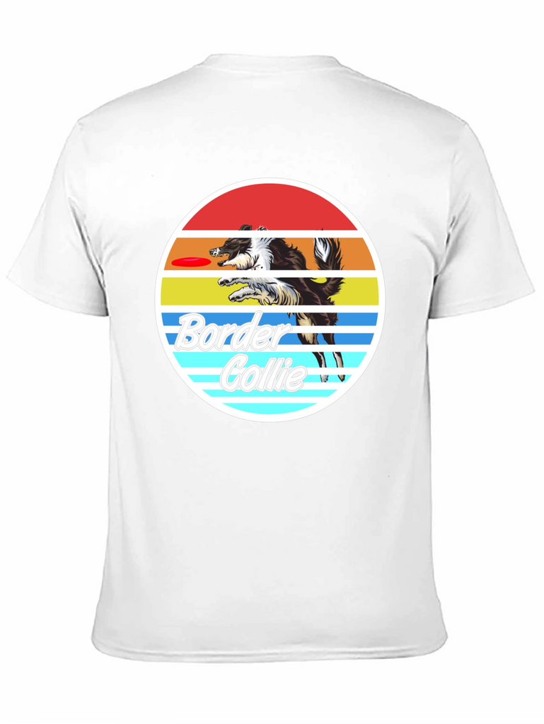 Show off your love for Border Collies with this stylish graphic tee! This black t-shirt features a vibrant retro design of a Border Collie catching a frisbee, set against a colorful striped background. The design is eye-catching, with the words "Border Collie" prominently displayed. Made from comfortable materials, this shirt is perfect for casual wear, dog walks, or simply lounging around. This unique tee is a must-have for any Border Collie enthusiast. Wear it with pride and let everyone know about your favorite breed!