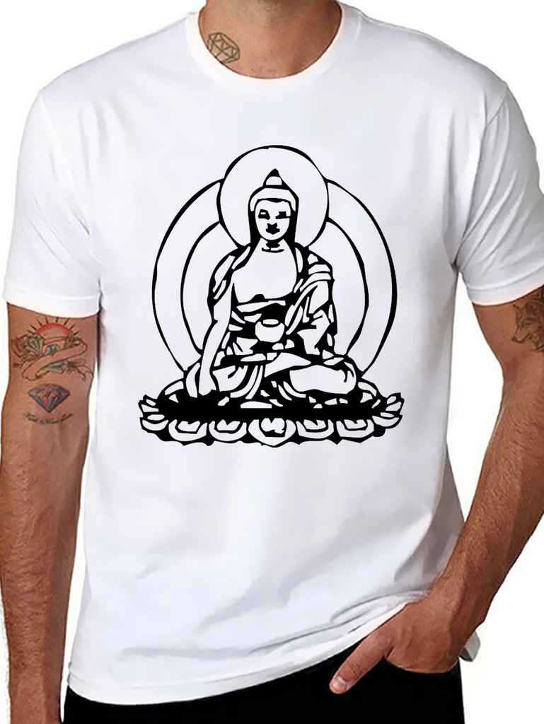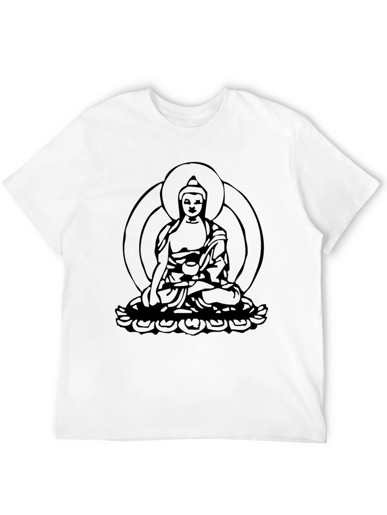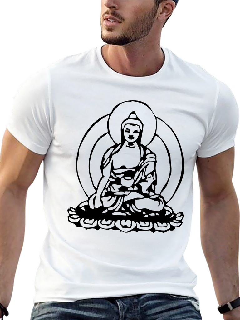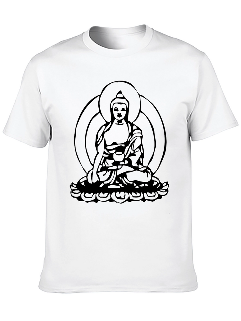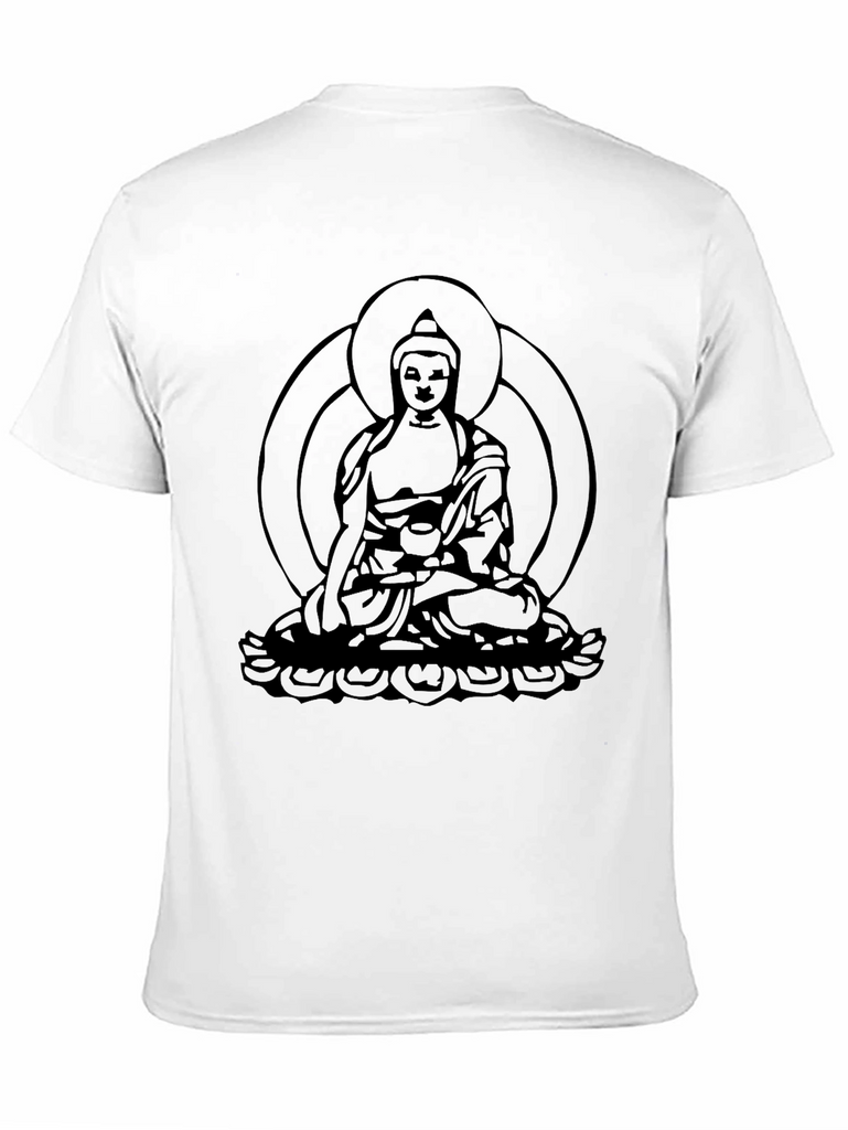 This black t-shirt features a striking graphic print of Buddha in a meditative pose, making it a perfect choice for those seeking a blend of style and serenity. The solid black backdrop emphasizes the detailed black Buddha design, creating a visually appealing contrast. Made from comfortable, breathable fabric, this tee is suitable for everyday wear, yoga sessions, or casual outings. Its classic fit ensures a relaxed and comfortable feel. Embrace tranquility with this unique and meaningful t-shirt that adds a touch of mindfulness to your wardrobe. Wear your inner peace!