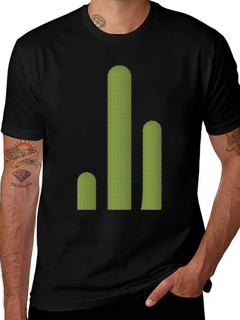Show off your love for the desert with this stylish black t-shirt. The shirt features a minimalist design of three saguaro cacti in a vibrant shade of green. Made from comfortable, breathable cotton, this tee is perfect for everyday wear. The simple yet eye-catching design makes it a great conversation starter. Whether you're hitting the trails or just hanging out, this cactus tee will add a touch of Southwestern charm to your look. Dress it up or down for a versatile addition to your wardrobe. A must-have for plant lovers!