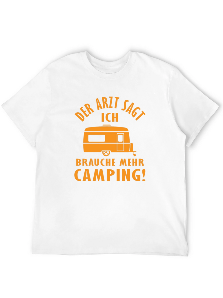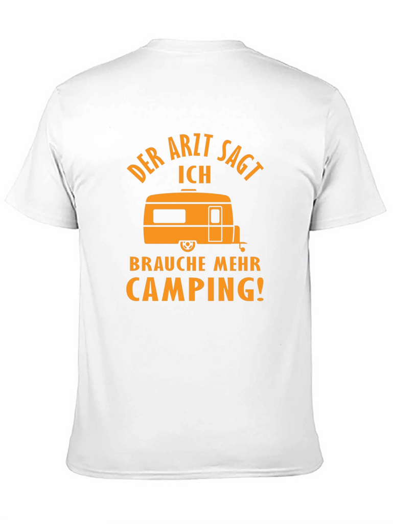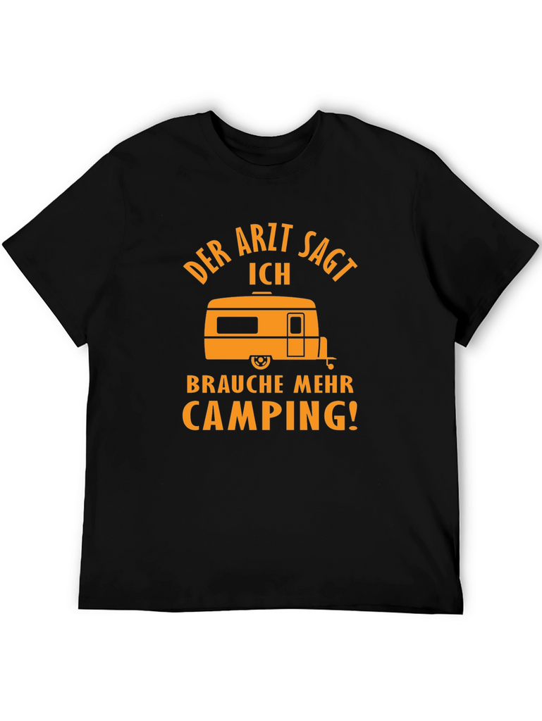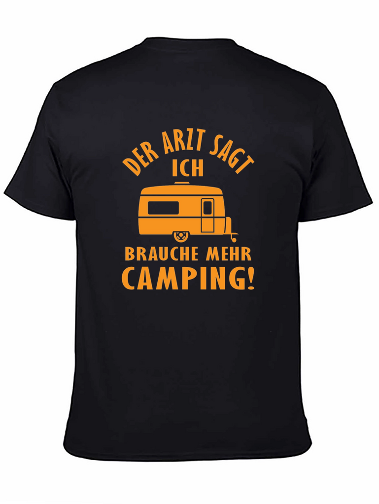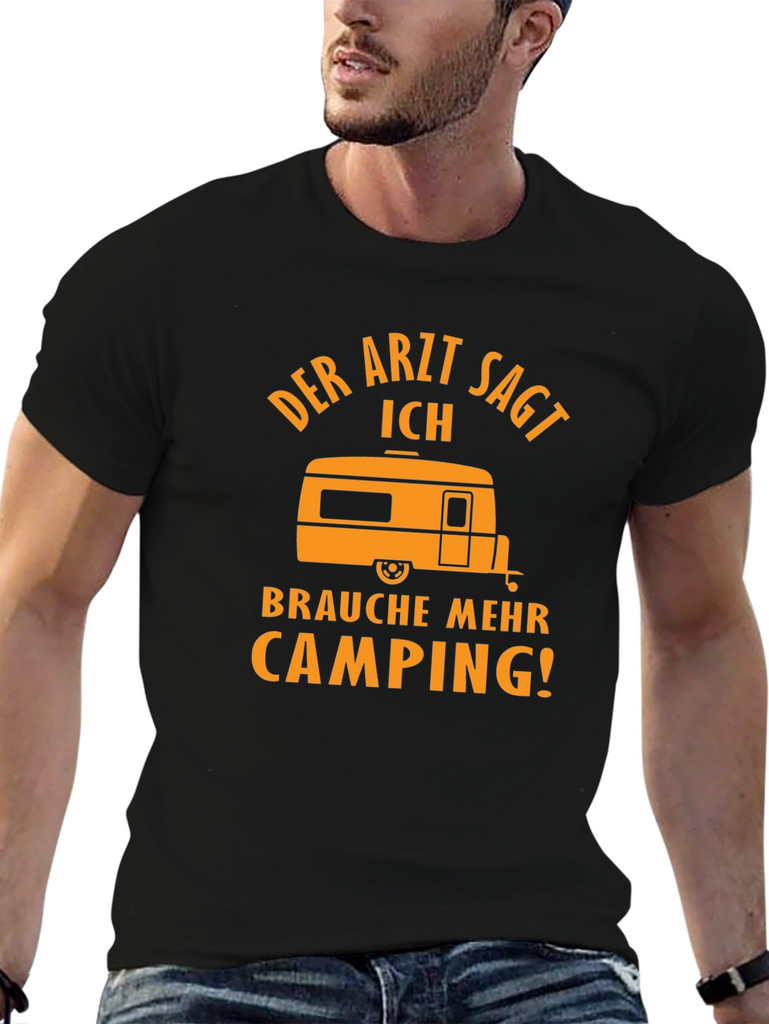 Show off your love for camping with this unique graphic t-shirt. The black tee features a humorous design in orange, with the text "DER ARZT SAGT ICH BRAUCHE MEHR CAMPING!" displayed above a caravan image. Made from comfortable materials, this shirt is ideal for casual wear, camping trips, or as a fun gift for camping enthusiasts. The classic fit makes it a great addition to any wardrobe. Get yours today and let everyone know you need more camping!
