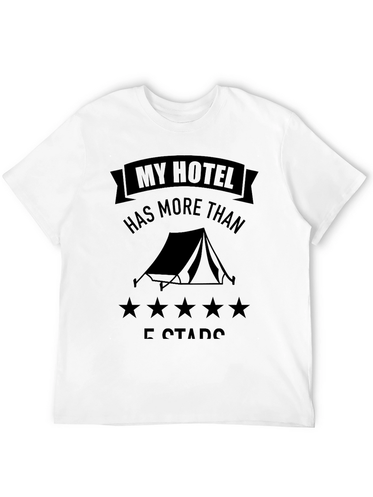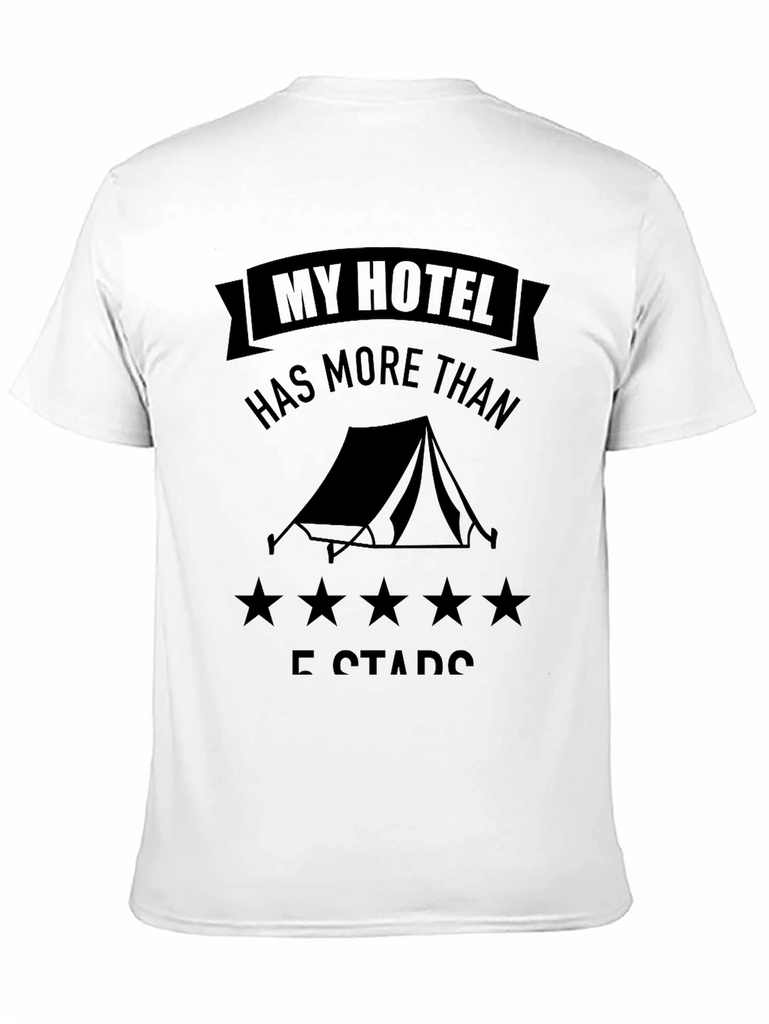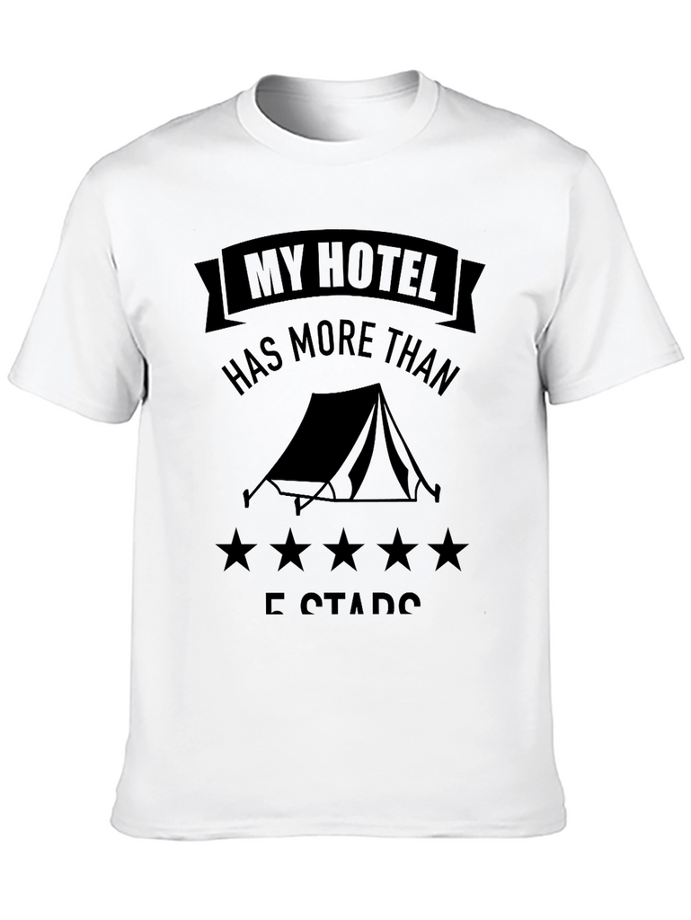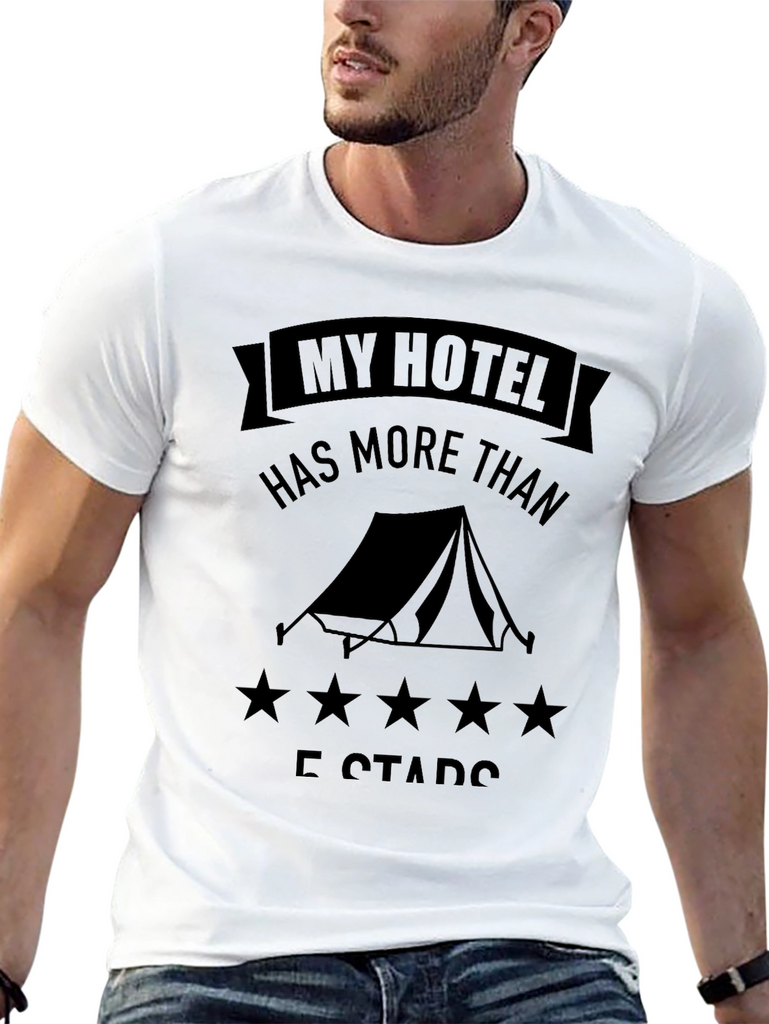 This black t-shirt features a unique design for camping enthusiasts. It boldly declares 'My Hotel Has More Than 5 Stars', along with a tent graphic. Ideal for casual wear, camping trips, or outdoor events, this shirt is a fun way to express your love for nature. The dark color makes it a versatile addition to any wardrobe. Show off your adventurous side with this must-have tee.
