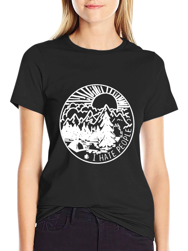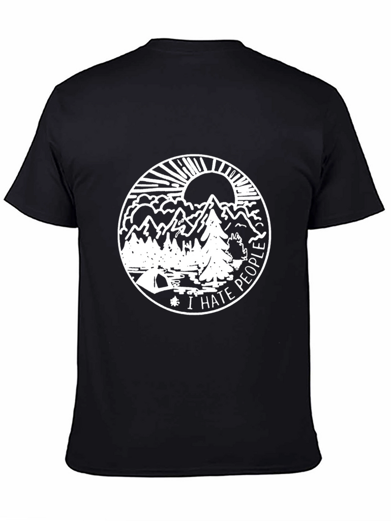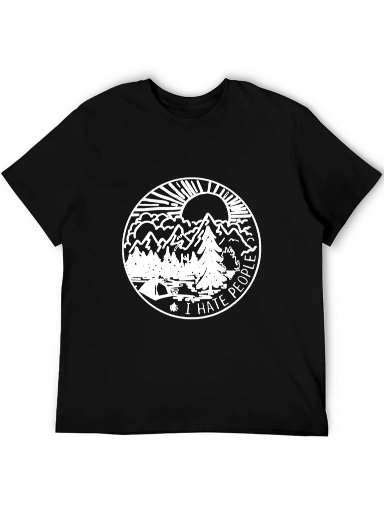 Show off your love for the outdoors and your disdain for crowded spaces with this unique graphic T-shirt. The shirt features a striking white design depicting a serene camping scene, complete with mountains, trees, a tent, and a rising sun, all encircled with the phrase "I HATE PEOPLE". Made from a comfortable, breathable fabric, this black tee is perfect for casual wear, outdoor adventures, or simply lounging around the campfire. It's a great way to express your introverted side while enjoying nature's beauty. Whether you're hiking a trail or just running errands, this eye-catching T-shirt is sure to spark conversation and showcase your individuality.