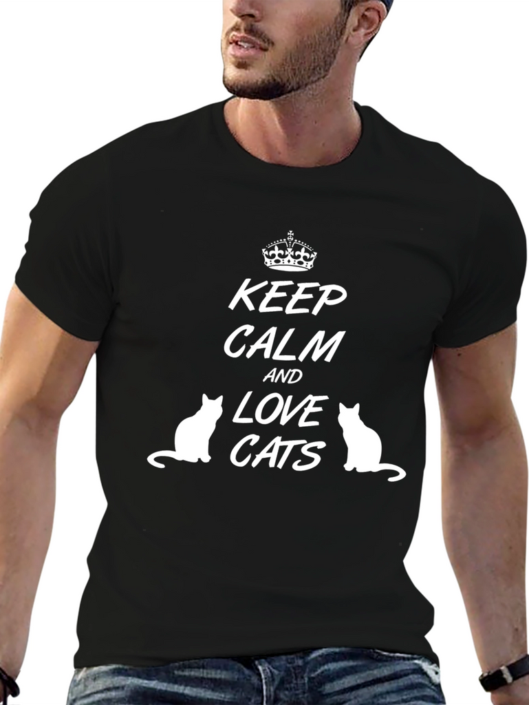 Show off your love for cats with this stylish black t-shirt. The shirt features a playful graphic of a crown, the words "Keep Calm and Love Cats", and two adorable cat silhouettes. Made from a comfortable material, this tee is perfect for everyday wear. Whether you're lounging at home, running errands, or meeting friends, this t-shirt is a fun way to express your personality and feline affection. A must-have for any cat lover's wardrobe!