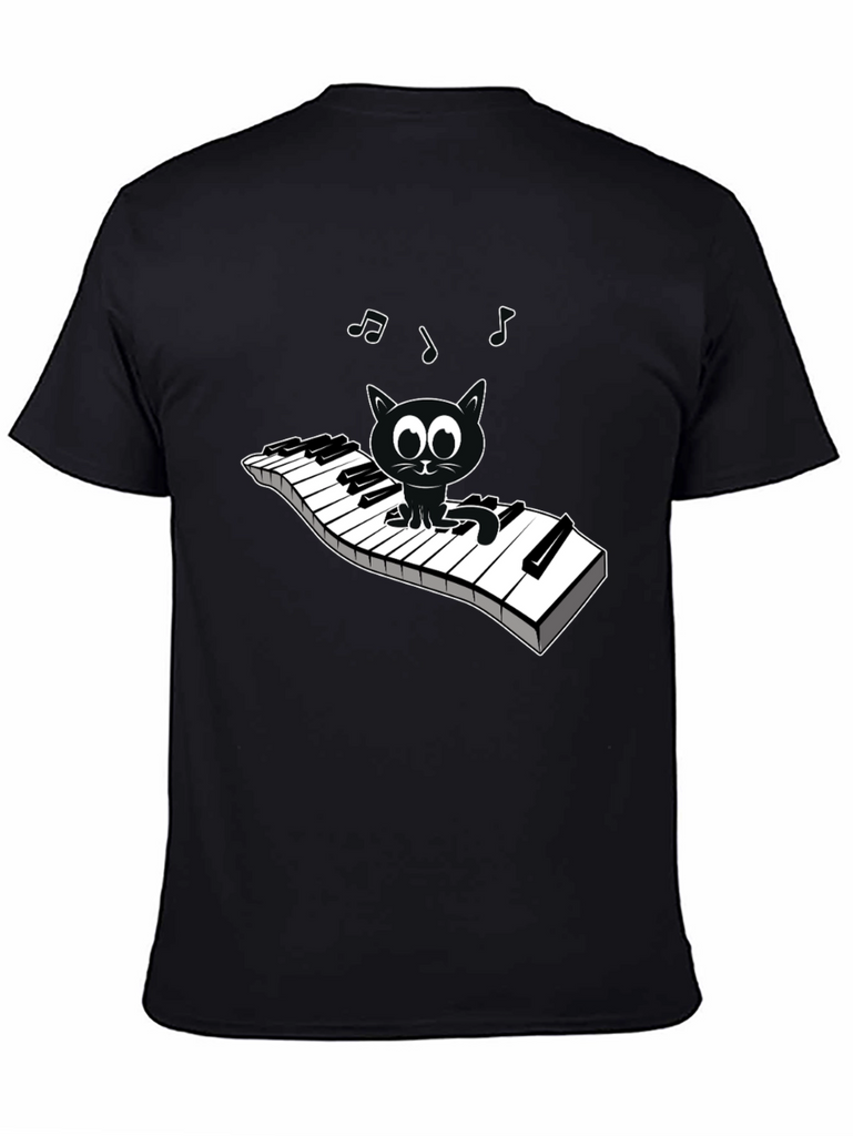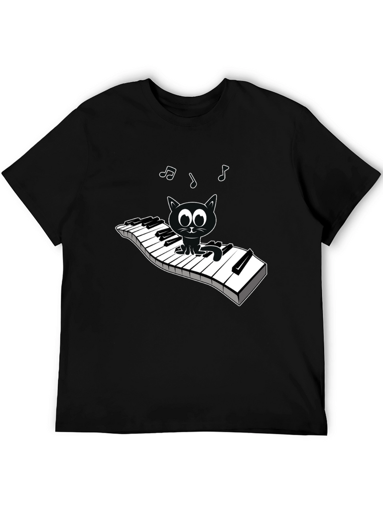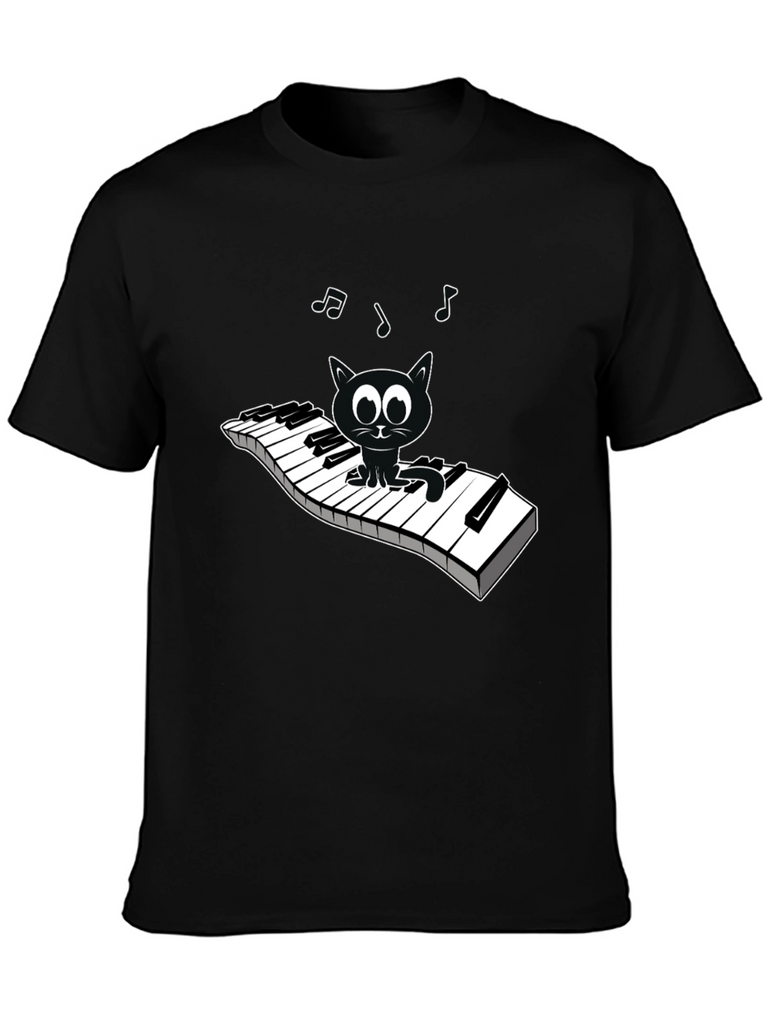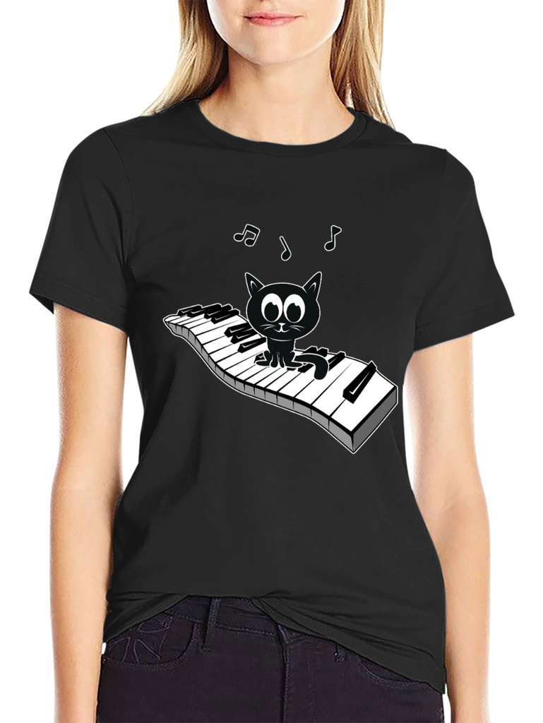 This fun black t-shirt features a playful graphic design of a black cat sitting and playing a piano keyboard with musical notes floating above. It's made from a comfortable-looking fabric, perfect for casual wear. The shirt's design combines musical and feline themes, appealing to cat lovers and musicians alike. It is an ideal choice for anyone who enjoys novelty apparel and wants to showcase their unique style with a creative and eye-catching design. Wear it to music events, casual outings, or simply as a fun everyday shirt.