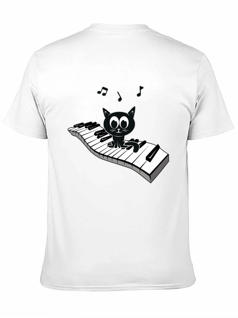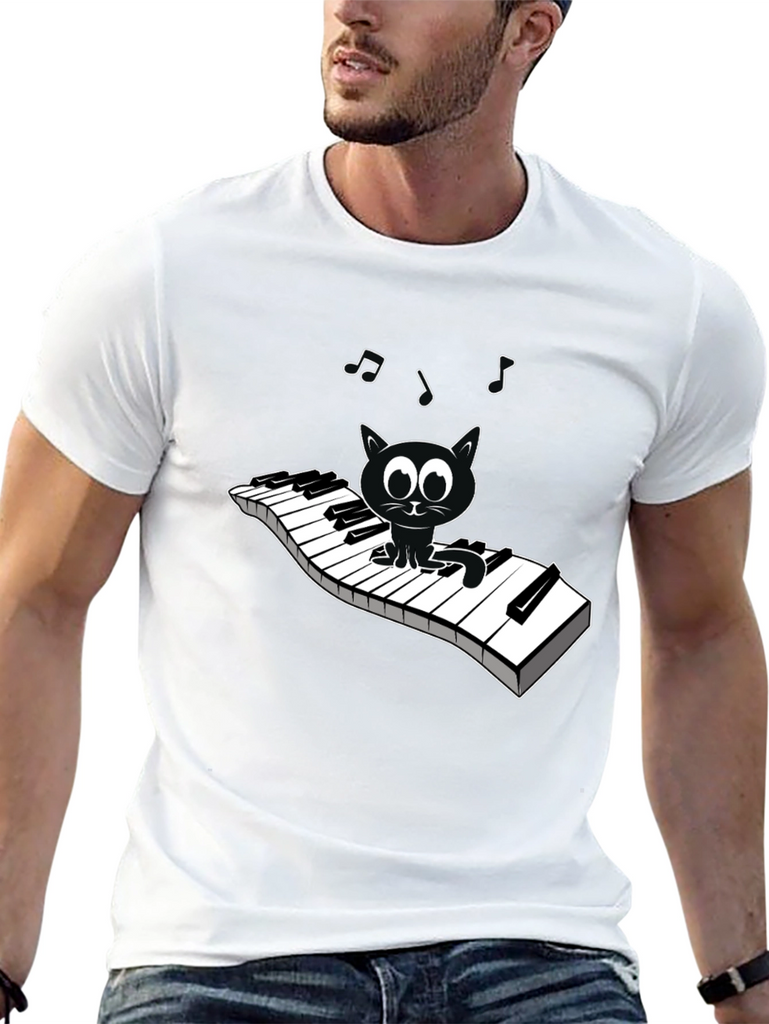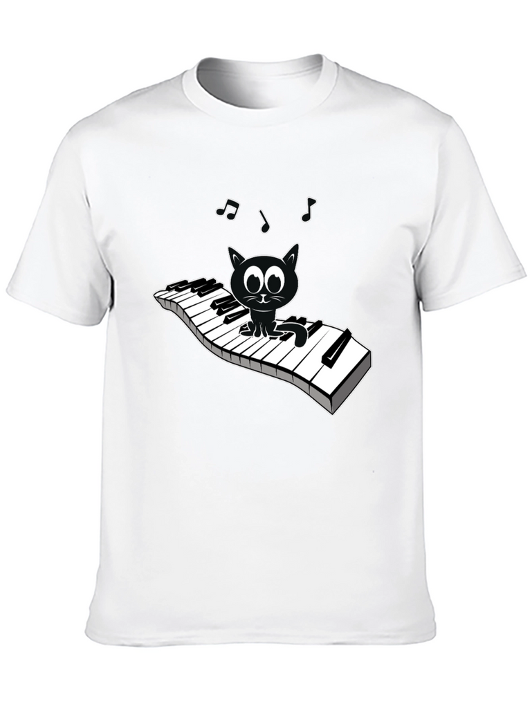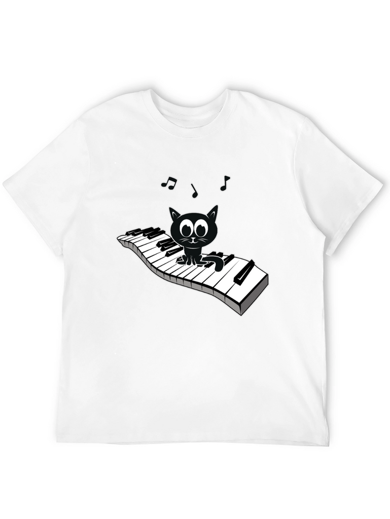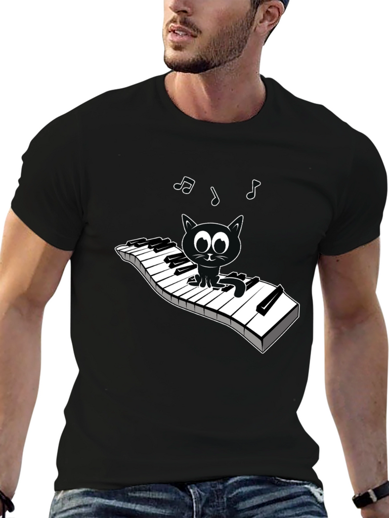 This fun black t-shirt features a playful graphic design of a black cat sitting and playing a piano keyboard with musical notes floating above. It's made from a comfortable-looking fabric, perfect for casual wear. The shirt's design combines musical and feline themes, appealing to cat lovers and musicians alike. It is an ideal choice for anyone who enjoys novelty apparel and wants to showcase their unique style with a creative and eye-catching design. Wear it to music events, casual outings, or simply as a fun everyday shirt.