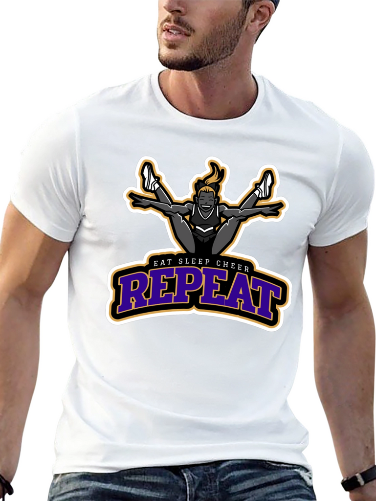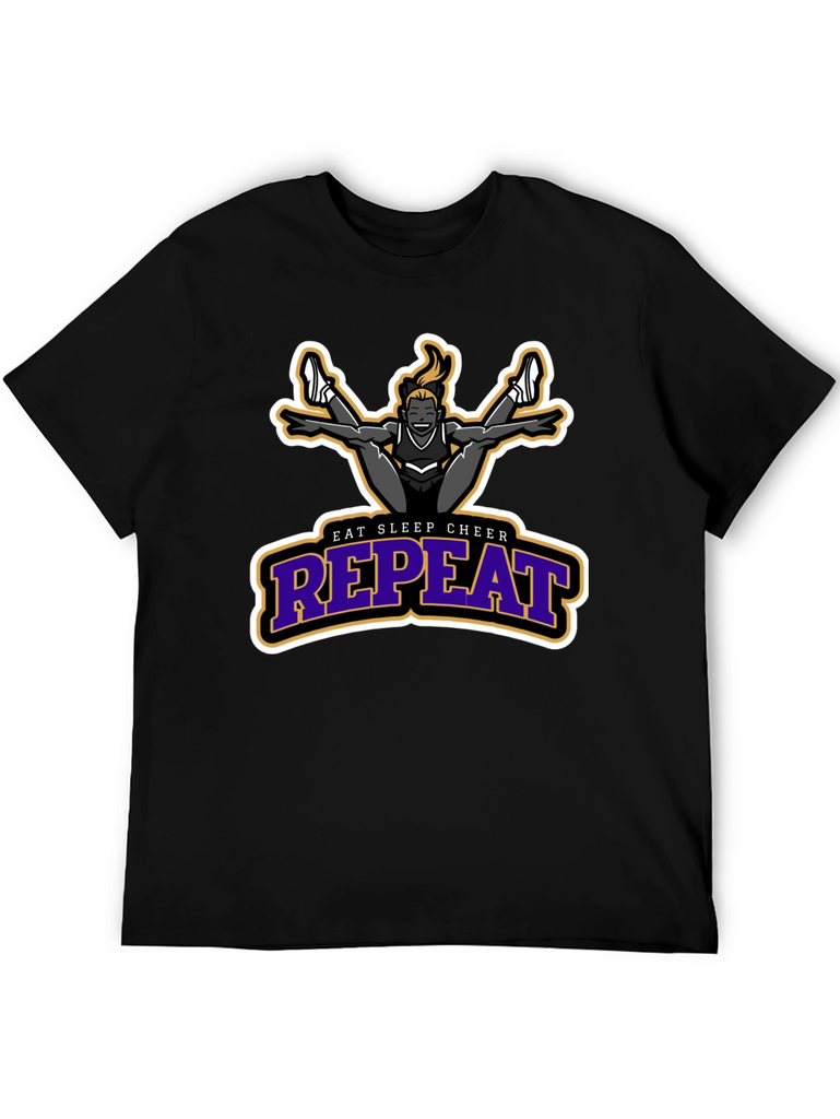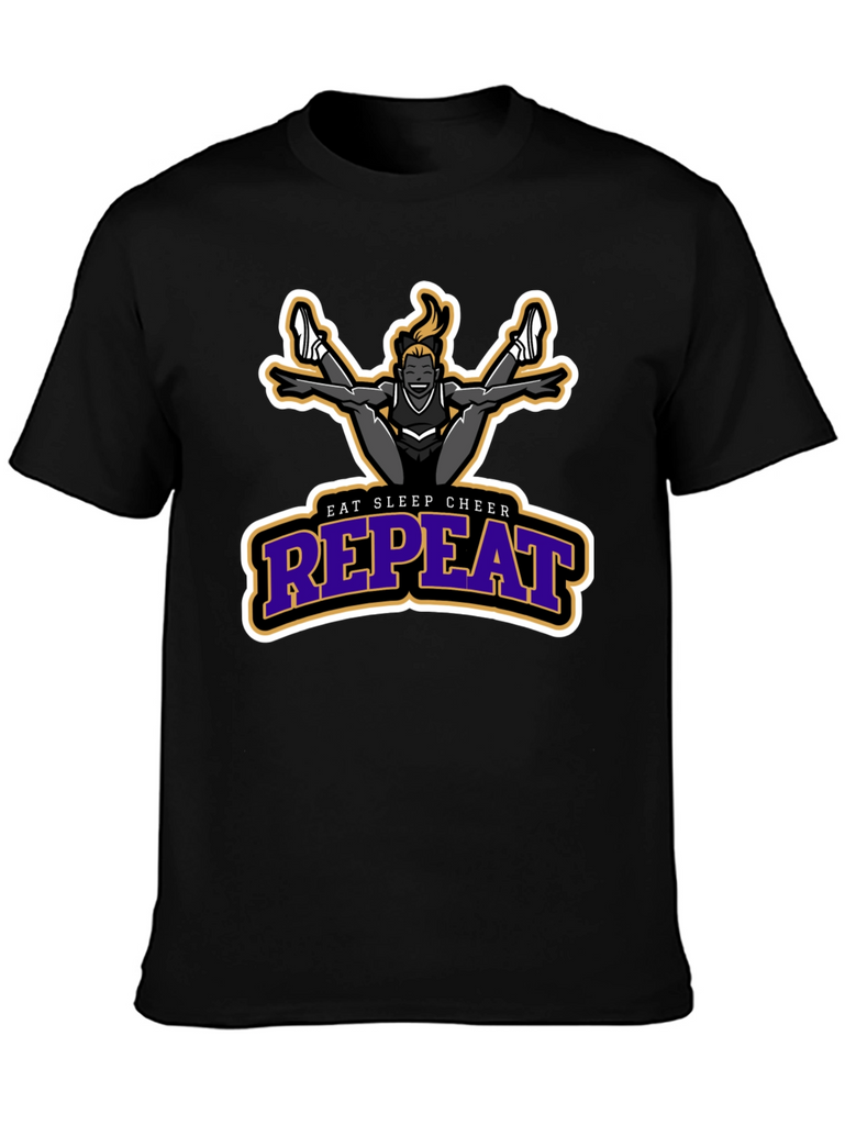 Show off your cheer spirit with this unique black t-shirt! The design features a cartoon cheerleader in action with the saying "Eat Sleep Cheer Repeat" in bold purple and white lettering. This shirt is perfect for cheerleaders, coaches, or anyone who loves to support their favorite squad. Comfortable and stylish, it's great for practice, games, or everyday wear. Express your passion for cheerleading with this eye-catching tee!