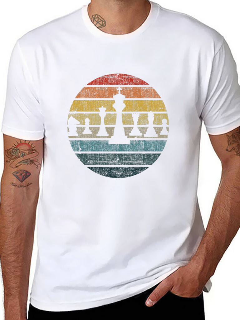 Capture a vintage vibe with this eye-catching black t-shirt featuring a retro-style chess piece design. The circular graphic showcases iconic chess pieces silhouetted against a distressed sunset background, blending warm orange and yellow tones with cool teal shades. Made from comfortable, breathable fabric, this tee is perfect for casual wear and makes a statement for chess enthusiasts and vintage lovers alike. Wear it to your next chess club meeting, a casual outing, or simply to express your unique style. This classic crewneck t-shirt offers a relaxed fit and is a great conversation starter.