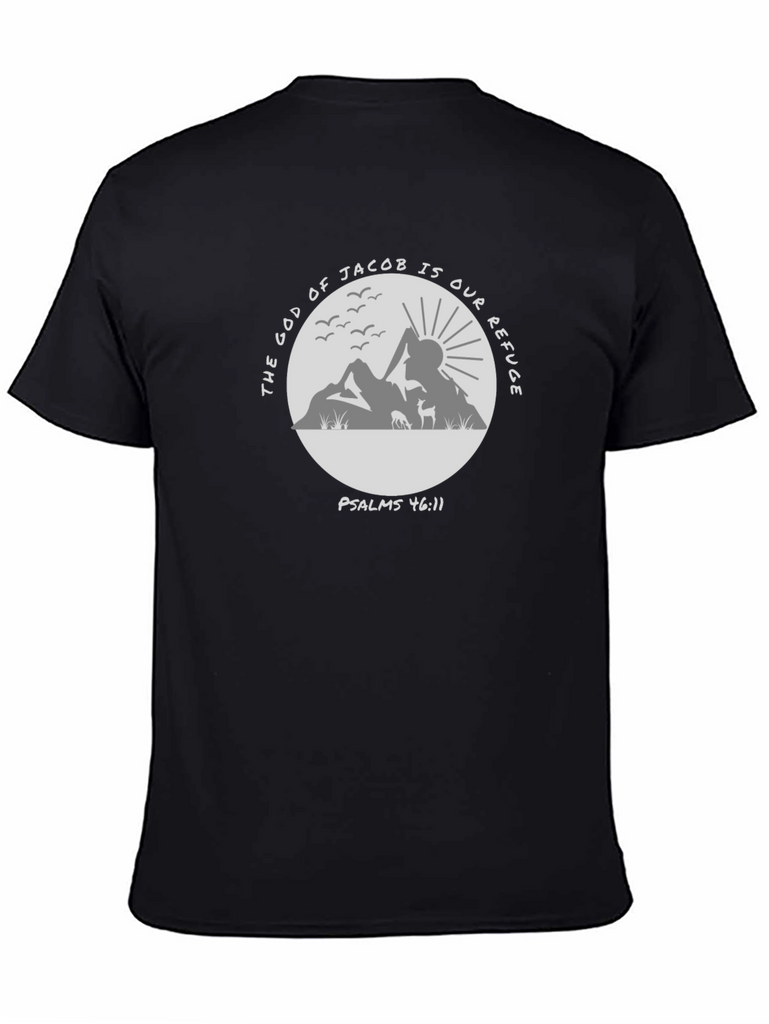 Embrace faith and style with this unique t-shirt. It features a round graphic design with 'The God of Jacob is Our Refuge' encircling a serene mountain scene. Complete with the text "Psalms 46:11", this shirt is made from a soft, comfortable fabric, perfect for everyday wear. It's a wearable expression of faith and peace. This t-shirt will make a meaningful addition to your wardrobe. Wear it to church, casual outings, or as a reminder of strength and hope.