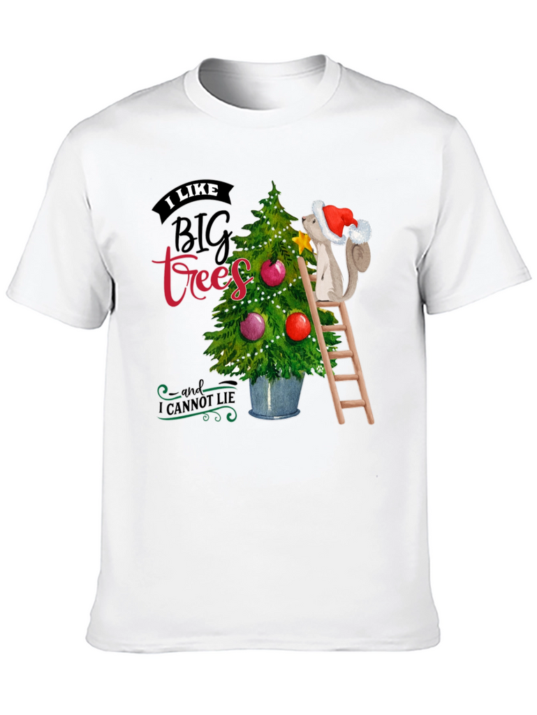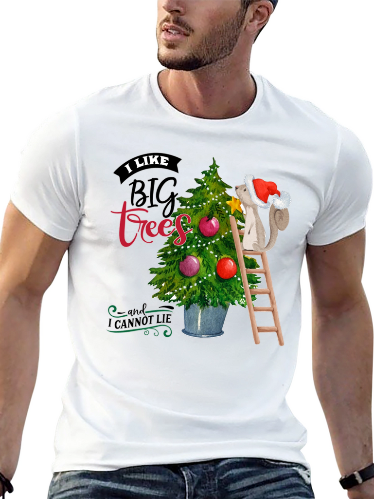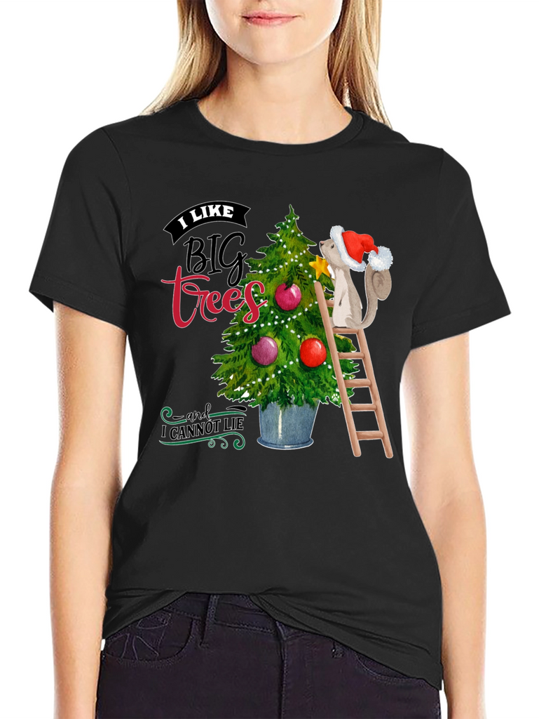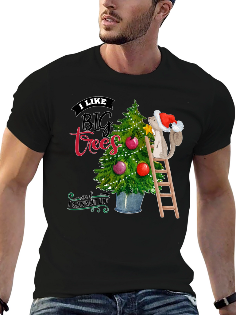 This unique black t-shirt features a humorous Christmas-themed design. A whimsical squirrel wearing a Santa hat adorns a decorated Christmas tree, complete with ornaments and a star on top. The tree is placed in a rustic bucket. Above the tree, the text "I LIKE BIG Trees" is displayed in an eye-catching font, while below, "and I CANNOT LIE" completes the playful message. Made from a comfortable-looking fabric, this shirt is perfect for adding a touch of festive fun to your wardrobe or for gifting to someone with a sense of humor during the holiday season. Wear it to Christmas parties, casual gatherings, or while decorating your own big tree!