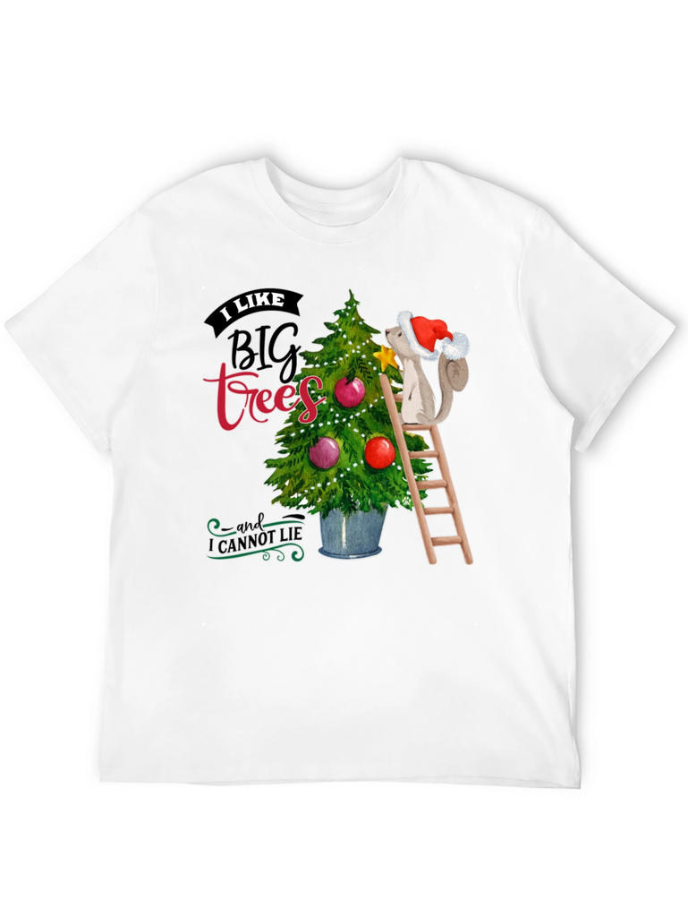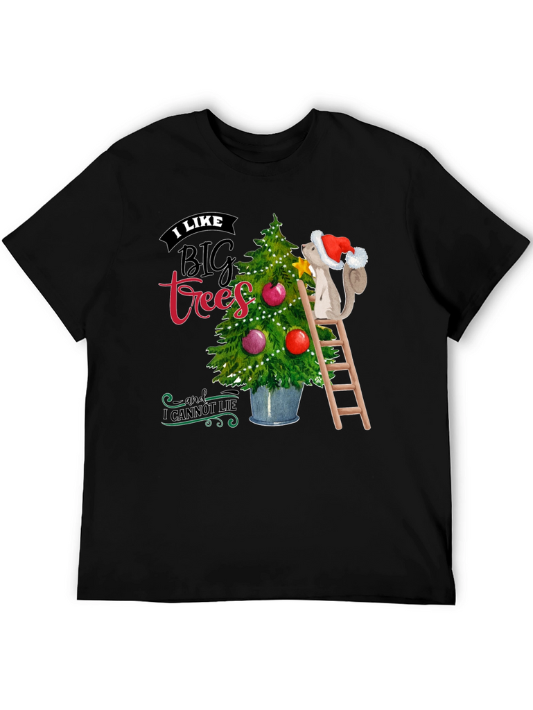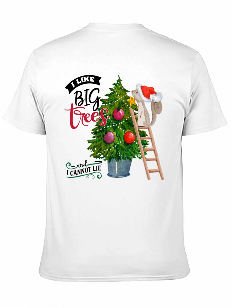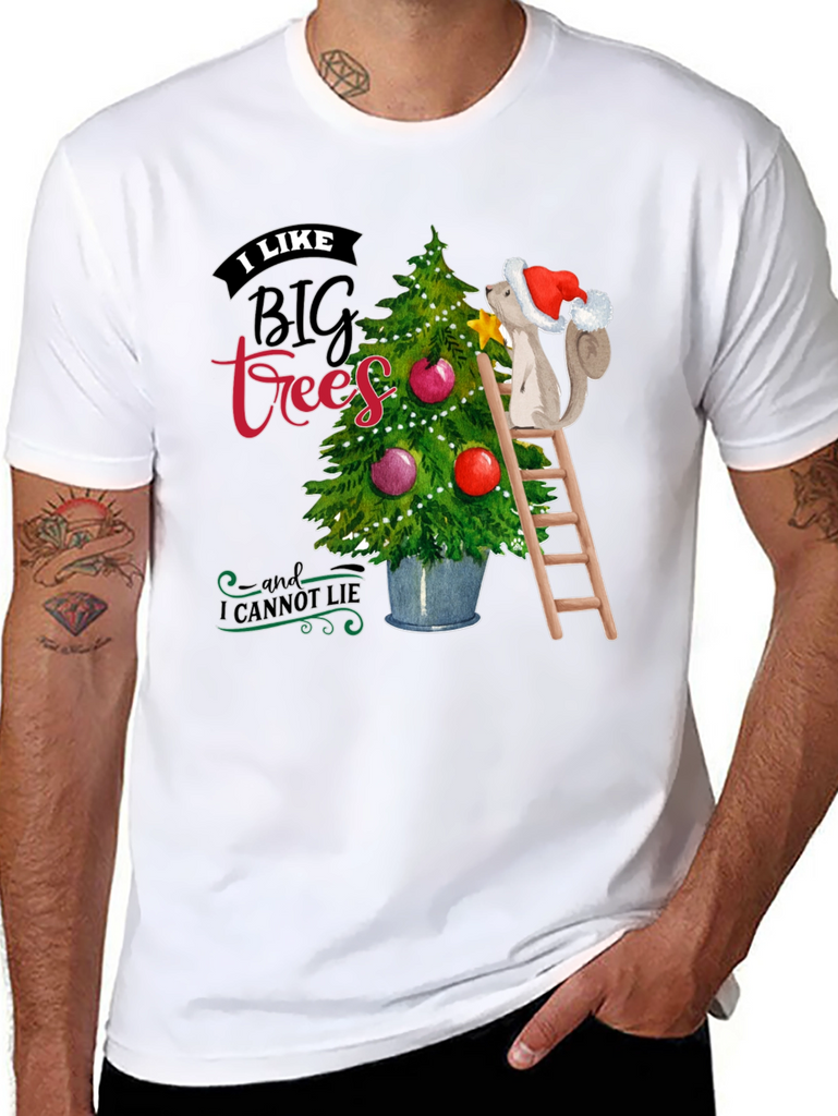 This unique black t-shirt features a humorous Christmas-themed design. A whimsical squirrel wearing a Santa hat adorns a decorated Christmas tree, complete with ornaments and a star on top. The tree is placed in a rustic bucket. Above the tree, the text "I LIKE BIG Trees" is displayed in an eye-catching font, while below, "and I CANNOT LIE" completes the playful message. Made from a comfortable-looking fabric, this shirt is perfect for adding a touch of festive fun to your wardrobe or for gifting to someone with a sense of humor during the holiday season. Wear it to Christmas parties, casual gatherings, or while decorating your own big tree!