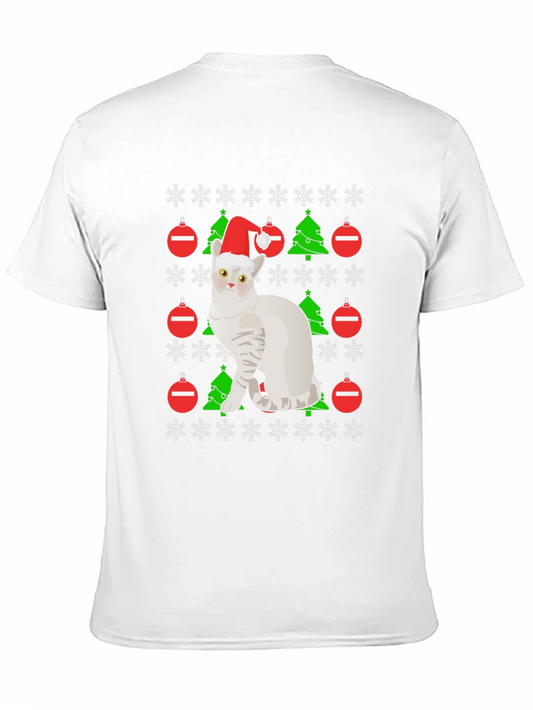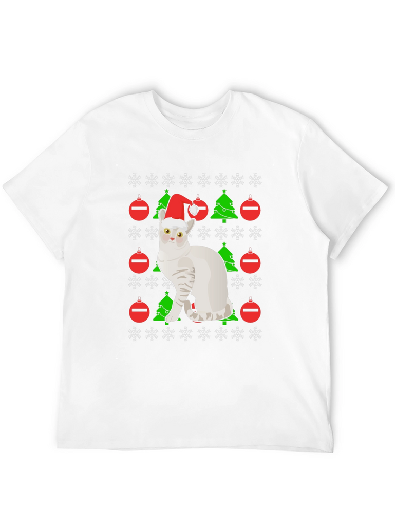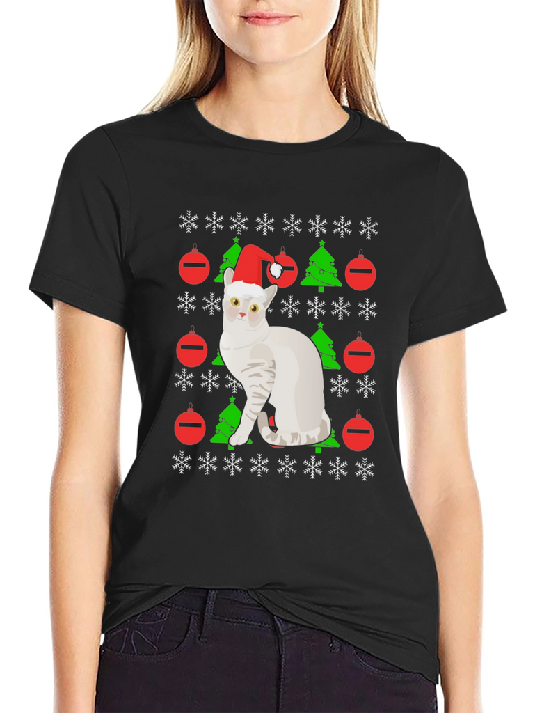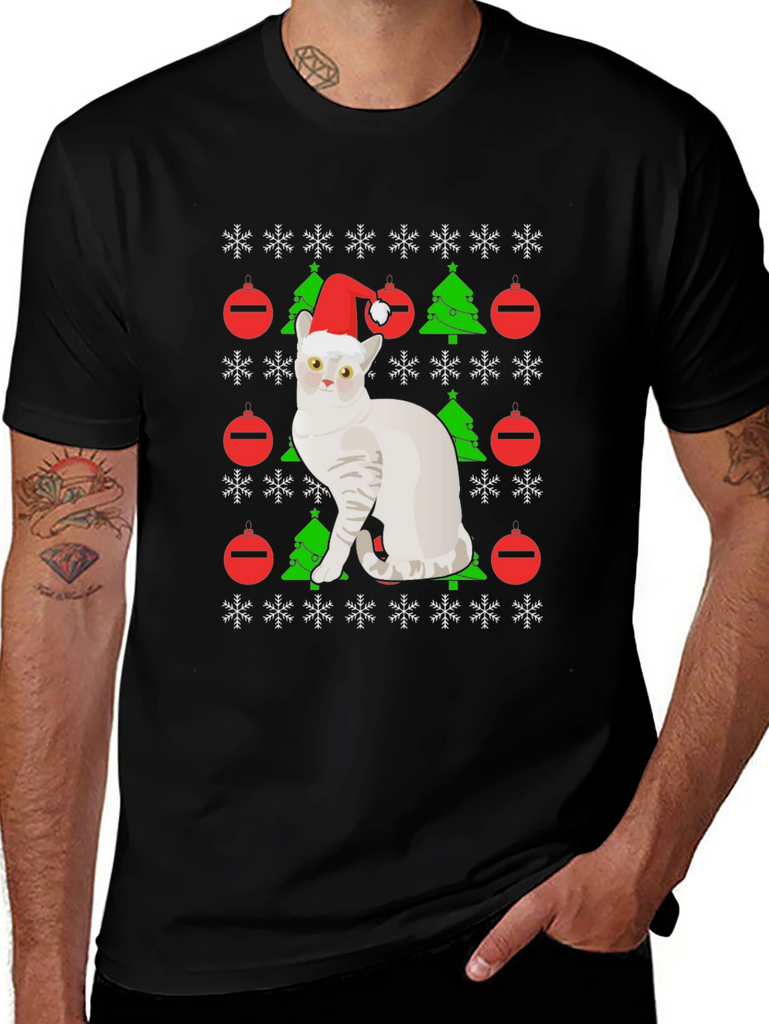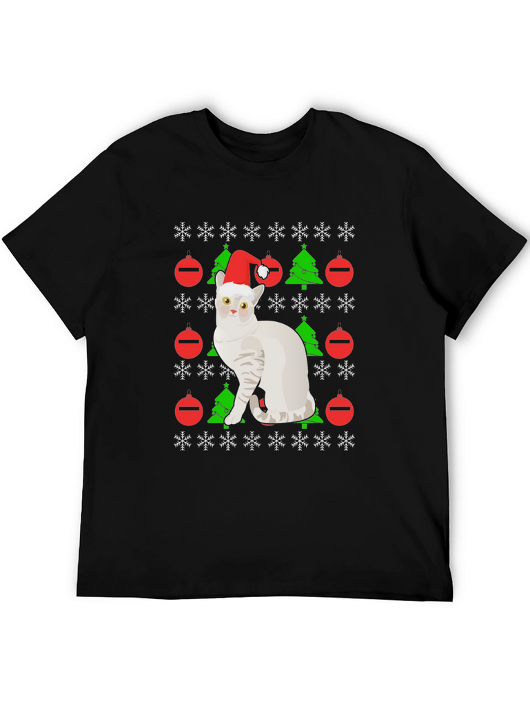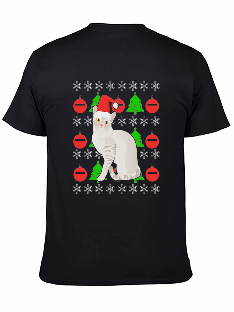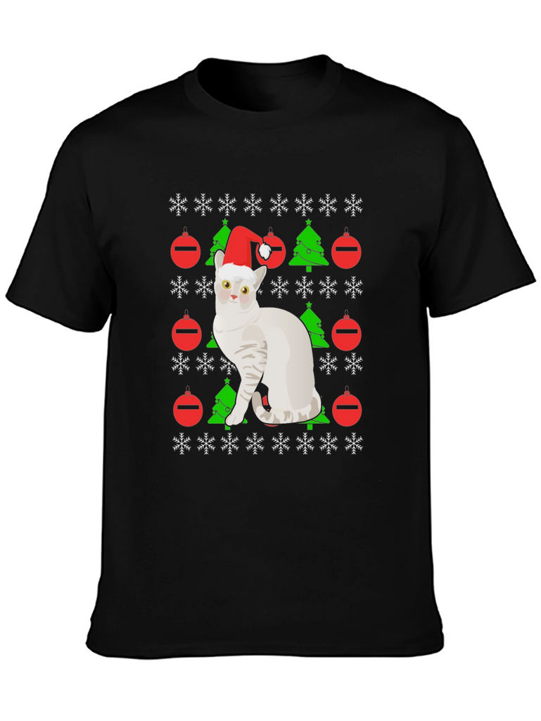 Get festive with this fun t-shirt! This black short-sleeved tee features a unique holiday-themed design. A white cat wearing a Santa hat is front and center, surrounded by snowflakes, Christmas trees, and ornaments. The design offers a playful take on the classic ugly Christmas sweater. Made from a comfortable-looking material, this shirt is perfect for holiday parties, casual gatherings, or just showing off your Christmas spirit. A fun and unique piece to add to your wardrobe!
