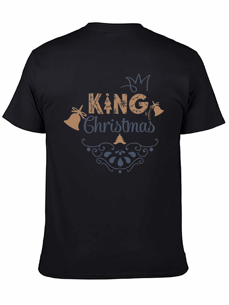 Celebrate the holiday season in style with this festive black t-shirt. The shirt features a unique "King Christmas" design, complete with a crown, Christmas trees, jingle bells, and decorative flourishes. The playful typography and holiday-themed graphics make it perfect for spreading Christmas cheer. Constructed from comfortable, breathable fabric, this tee is ideal for holiday gatherings, parties, or casual everyday wear. Show off your holiday spirit with this cheerful and stylish t-shirt!