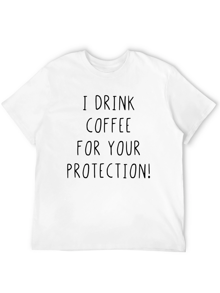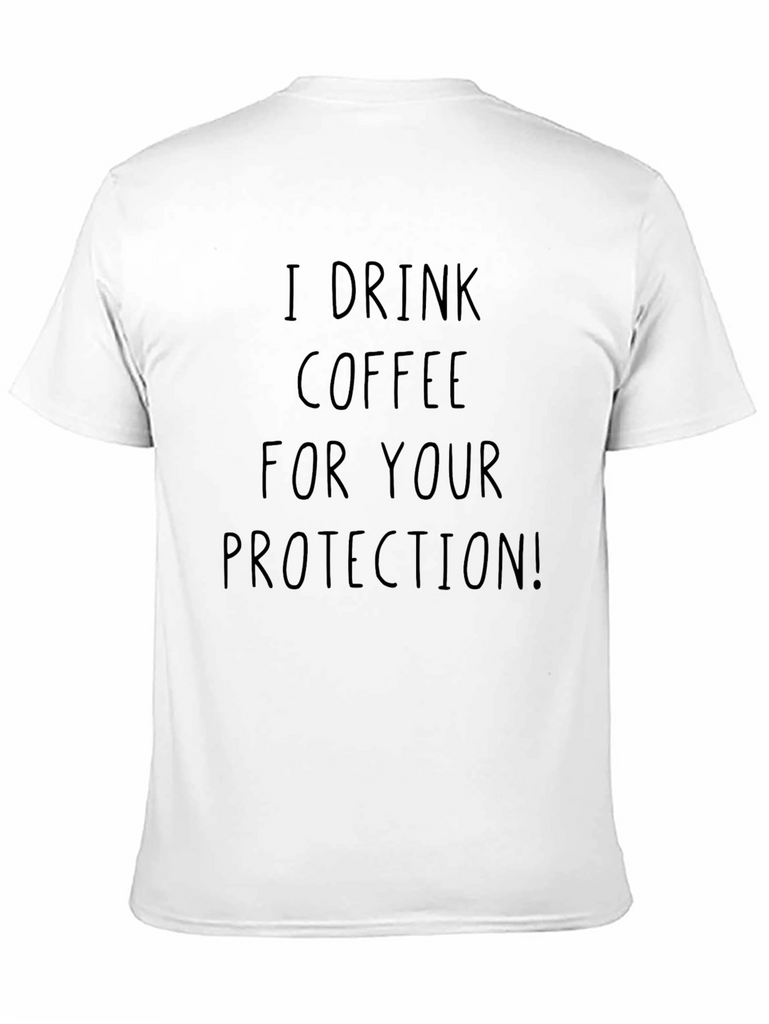 This classic black t-shirt features a bold, humorous statement: "I DRINK COFFEE FOR YOUR PROTECTION!" The text is displayed in a clean, easily readable font, adding a touch of wit to your wardrobe. Made from a soft and comfortable fabric, this tee is perfect for casual wear, whether you're lounging at home, running errands, or meeting friends for a coffee. The shirt's design makes it an excellent conversation starter and a fun gift for coffee lovers with a sense of humor. Wear it to the office, weekend outings, or any place where a bit of caffeine-fueled humor is appreciated. Show the world your dedication to alertness and protection, all thanks to the power of coffee!