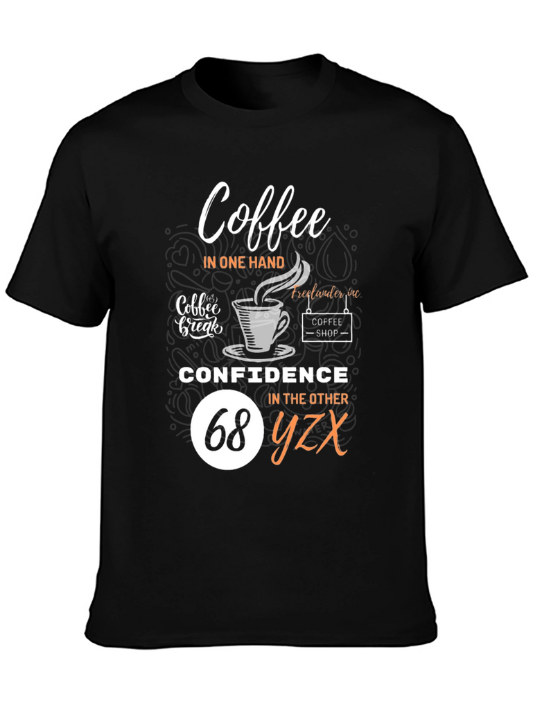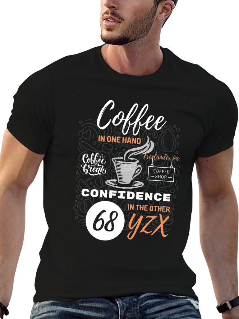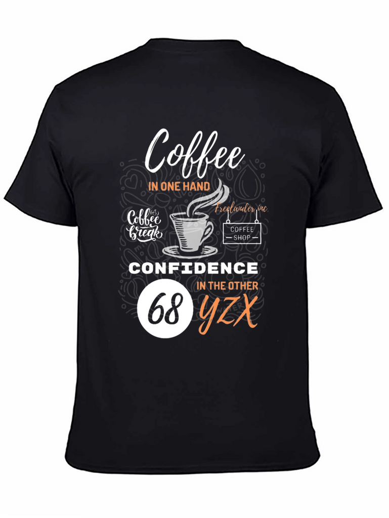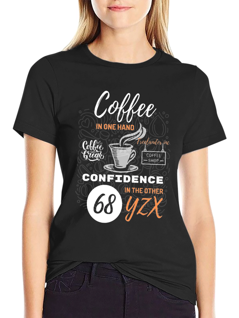 Embrace your dual loves with this fun and stylish black t-shirt! Featuring a clever design that reads "Coffee in one hand, Confidence in the other", it's perfect for coffee lovers who tackle their day with assurance. The graphic includes coffee cup imagery and 'coffee shop' detailing for added charm. Comfortable and eye-catching, this tee is ideal for casual outings, coffee dates, or simply expressing your personality. Show off your unique style and positive attitude with this must-have wardrobe addition!