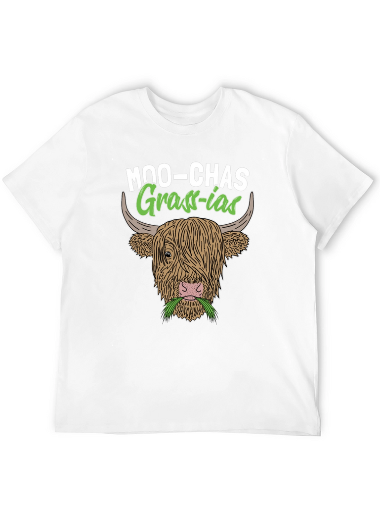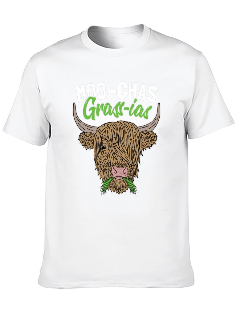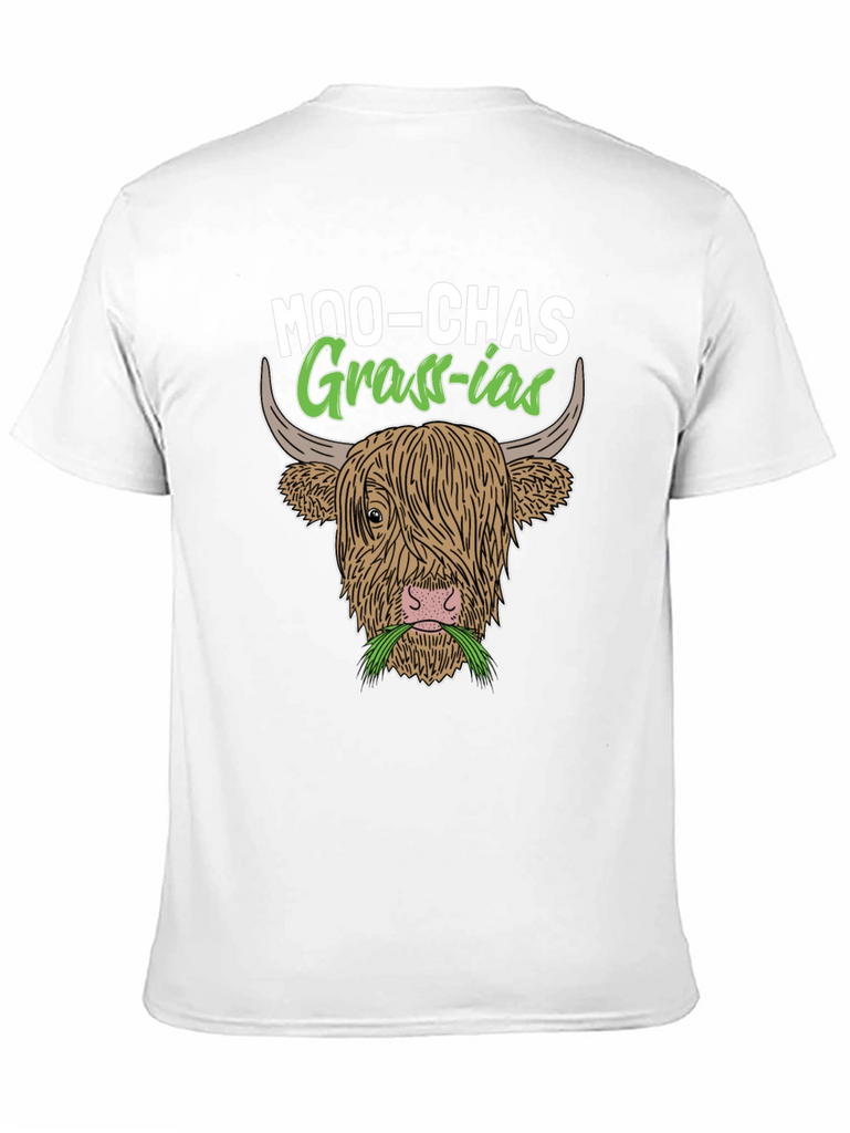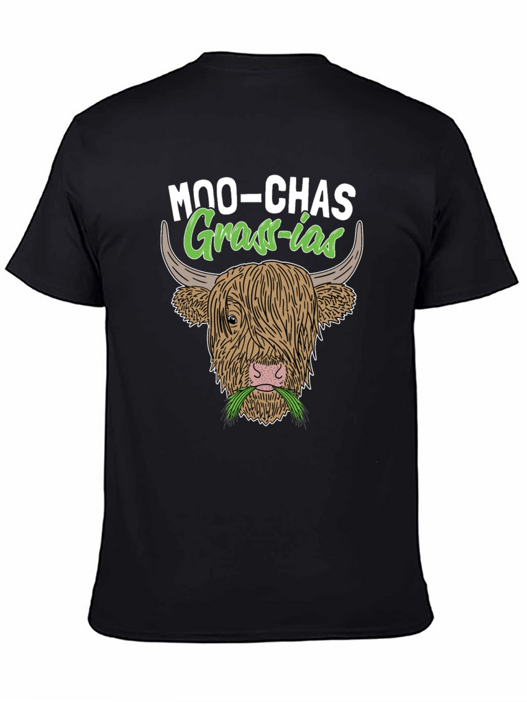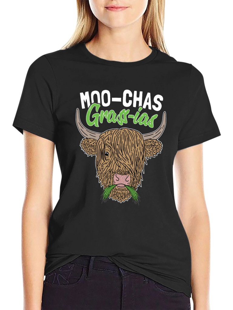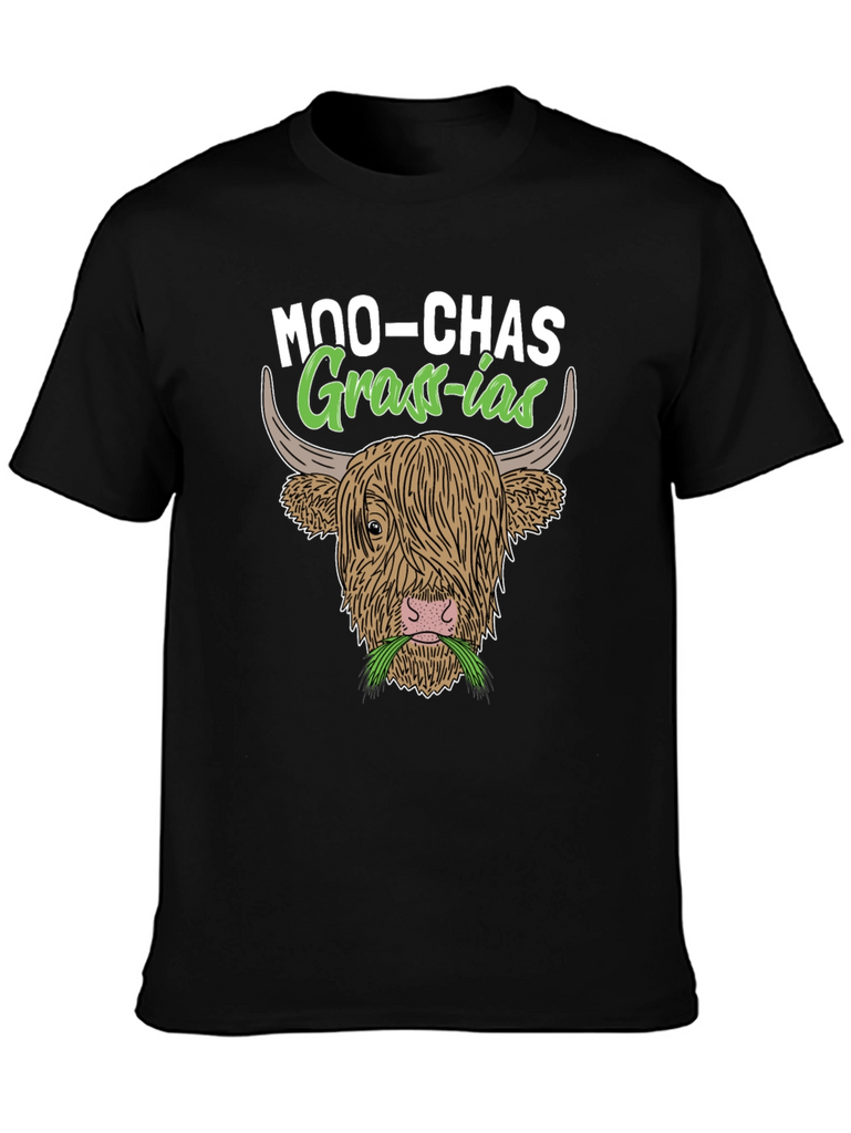 Express your love for cows and humor with this unique graphic t-shirt. This black tee features a playful design of a highland cow, complete with grassy details in its mouth. Above the cow, the words "Moo-chas Grass-ias" are printed, cleverly combining "muchas gracias" with a farm animal twist. Made from what appears to be a comfortable cotton blend, this tee is perfect for casual wear. Show off your fun-loving personality and bovine appreciation with this eye-catching and conversation-starting t-shirt. Great for everyday wear, animal lovers, or anyone who enjoys a good pun!