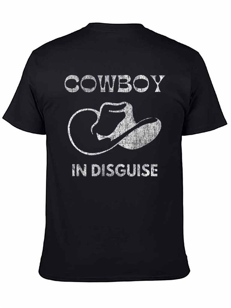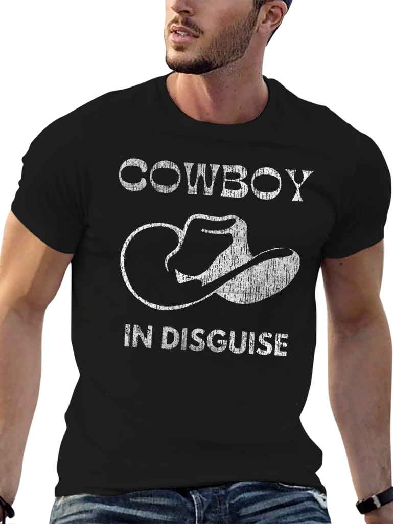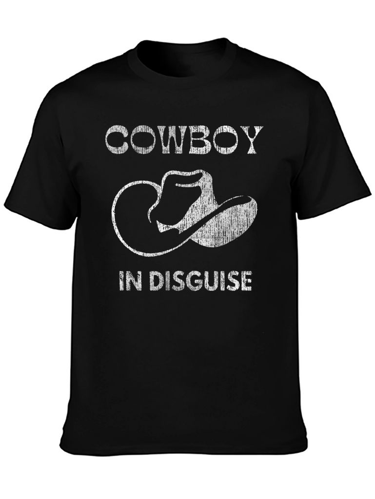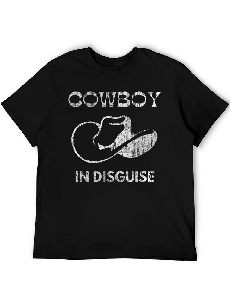 Show off your inner cowboy with this stylish "Cowboy in Disguise" graphic tee. This black t-shirt features a distressed white print with the words "COWBOY" and "IN DISGUISE" flanking a cowboy hat graphic. The distressed print gives it a vintage, worn-in feel. Made from soft, breathable fabric, this shirt is comfortable enough for all-day wear. It's perfect for casual outings, rodeos, or just expressing your love for the Wild West. Let everyone know you're a cowboy at heart with this fun and unique t-shirt.