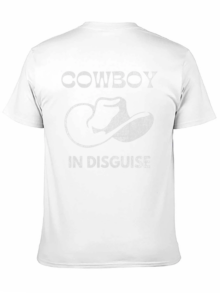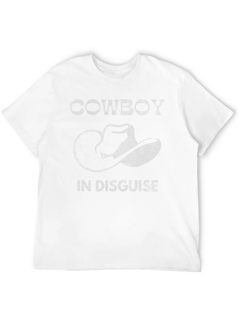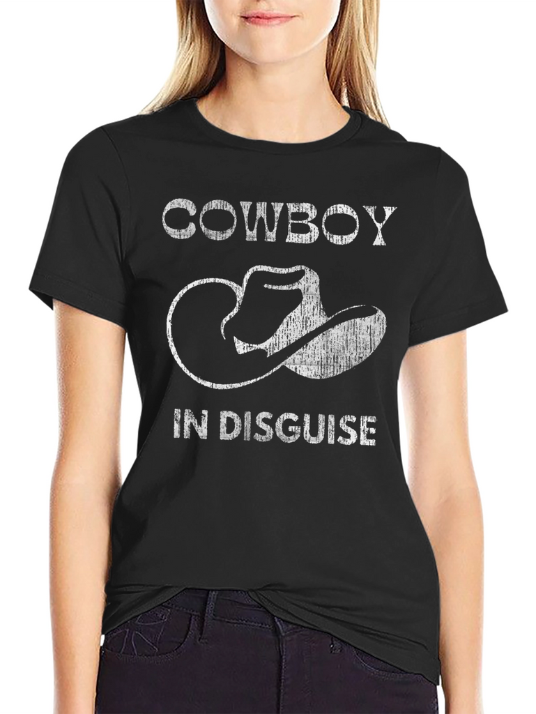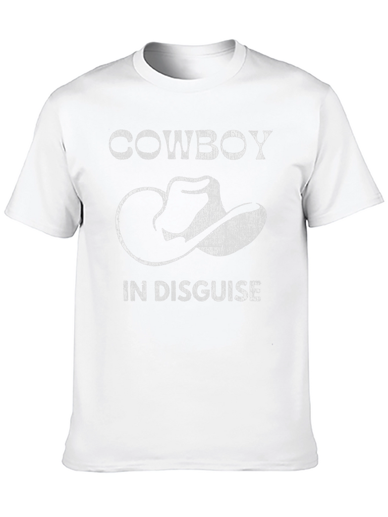 Show off your inner cowboy with this stylish "Cowboy in Disguise" graphic tee. This black t-shirt features a distressed white print with the words "COWBOY" and "IN DISGUISE" flanking a cowboy hat graphic. The distressed print gives it a vintage, worn-in feel. Made from soft, breathable fabric, this shirt is comfortable enough for all-day wear. It's perfect for casual outings, rodeos, or just expressing your love for the Wild West. Let everyone know you're a cowboy at heart with this fun and unique t-shirt.