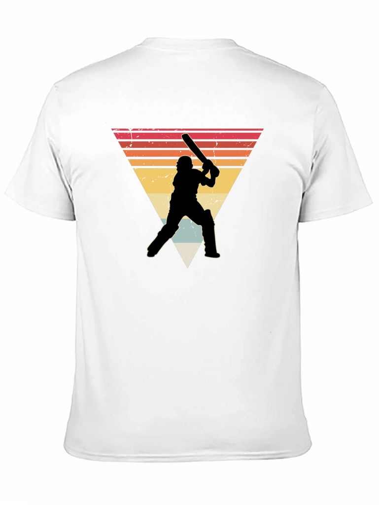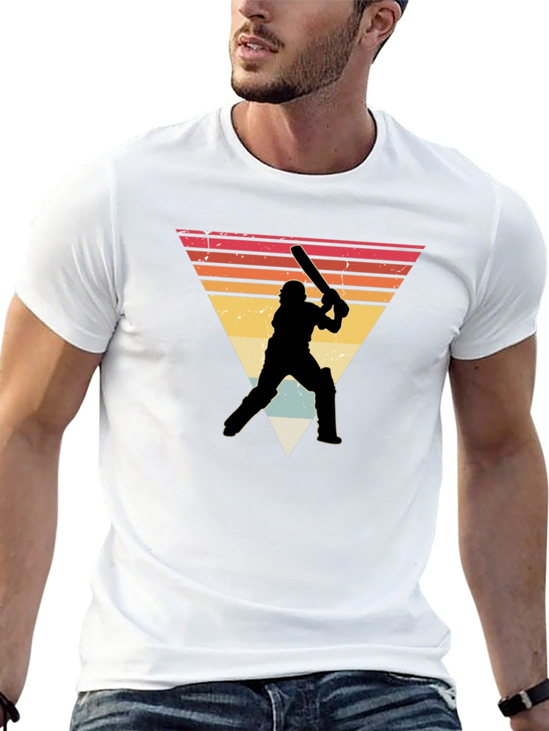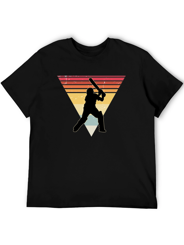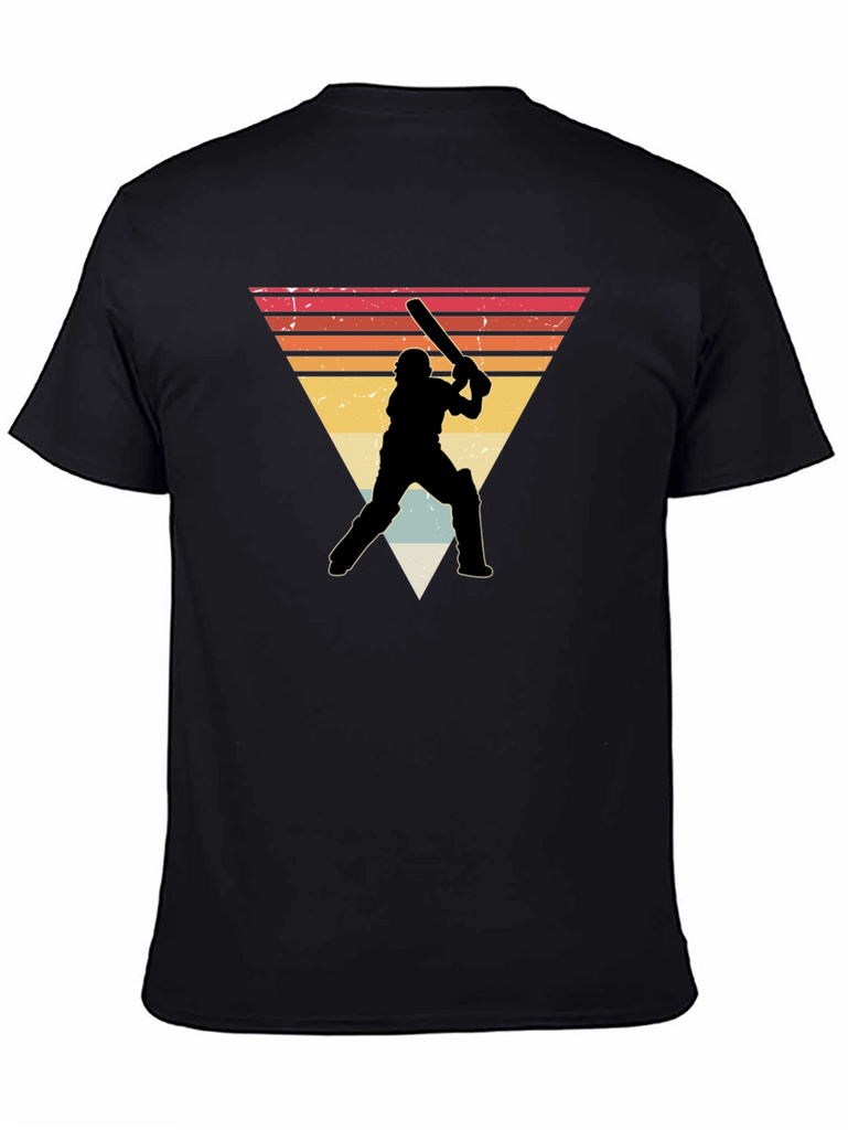 Show off your love for cricket with this stylish black t-shirt. It features a retro-inspired design with a silhouetted cricket player against a vintage triangle sunset backdrop. Made from a soft, comfortable fabric, this tee is perfect for everyday wear. The unique graphic adds a touch of vintage charm, making it a great conversation starter. Wear it to your next cricket match, casual outing, or simply to express your passion for the sport. It's a must-have for any cricket enthusiast's wardrobe!