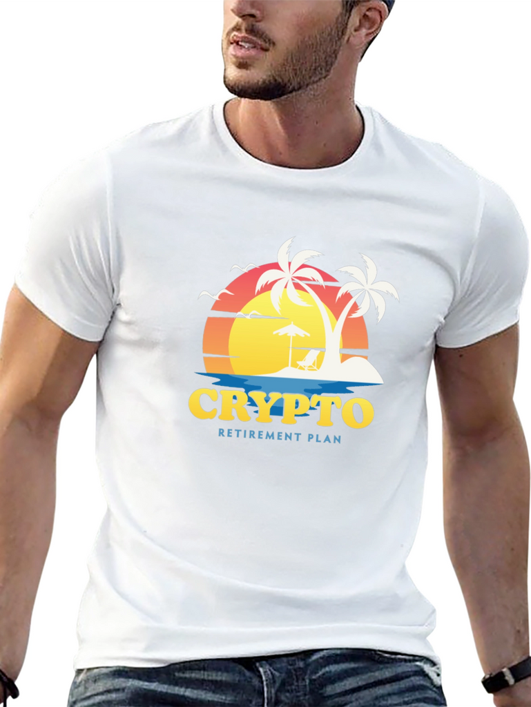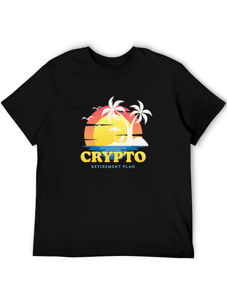 Embrace your future retirement goals with this unique Crypto Retirement Plan T-Shirt. Featuring a vibrant design of a tropical beach, sunset, and palm trees, this tee embodies the dream of financial freedom and relaxation. The bold 'CRYPTO' text in a bright yellow hue makes a statement while the subtle 'RETIREMENT PLAN' below reinforces the message. Made from a comfortable, breathable fabric, this shirt is perfect for casual wear. Whether you're a cryptocurrency enthusiast, a beach lover, or just someone who appreciates clever design, this t-shirt is sure to turn heads and spark conversations. Wear it to your next crypto meetup, on vacation, or just around town to show your support for the future of finance. Invest in style and comfort with this must-have t-shirt.