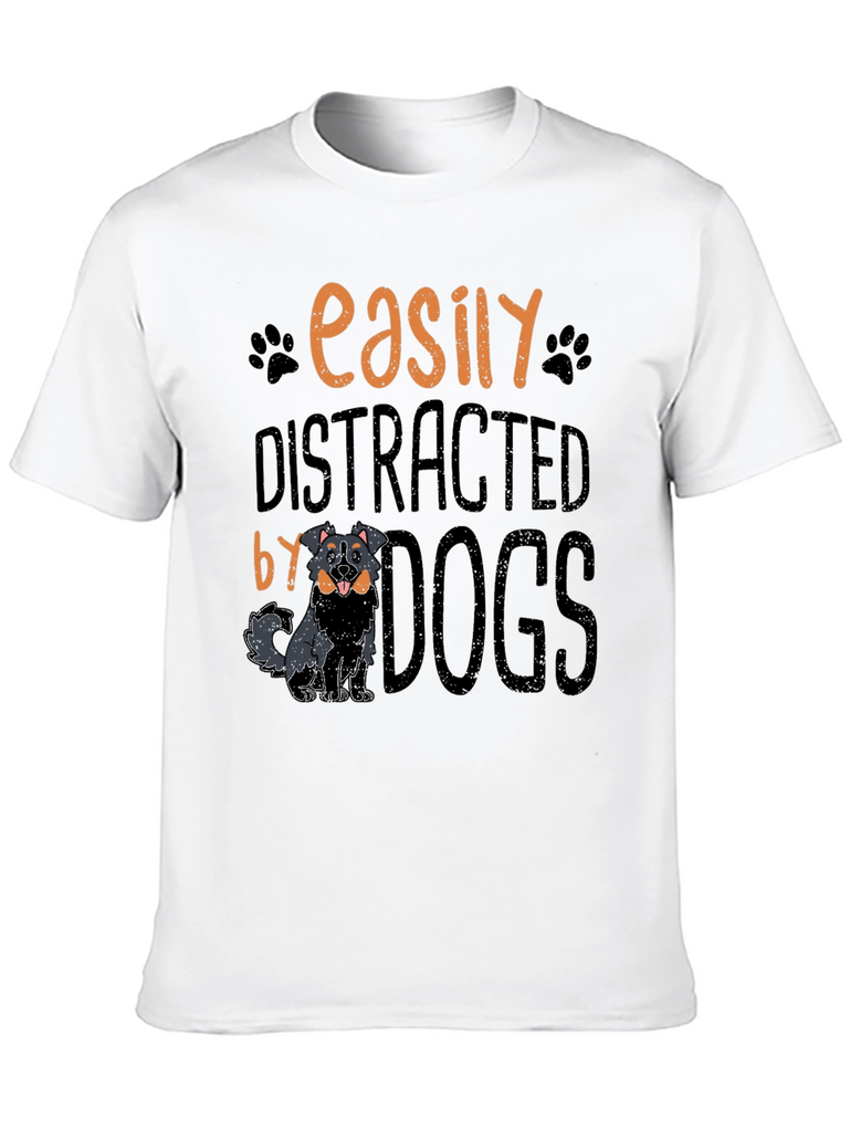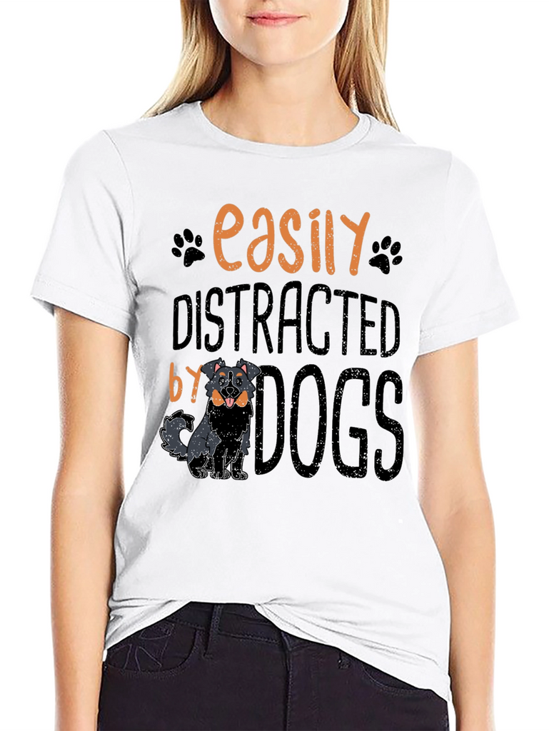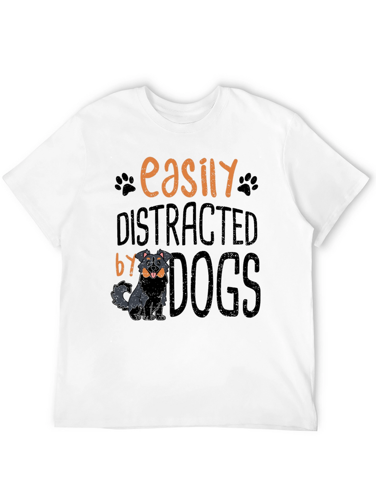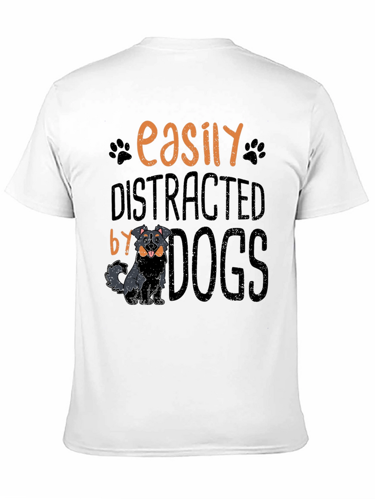 Show off your love for dogs with this unique black T-shirt. The shirt features the phrase "easily distracted by DOGS" in a fun, playful font, perfect for dog lovers. A cartoon dog sits to the left of the word "DOGS". Made from a soft, comfortable fabric, this T-shirt is ideal for casual wear, dog walks, or lounging at home. It is a great conversation starter and a must-have for any dog enthusiast's wardrobe. The simple design makes it versatile and easy to pair with jeans, shorts, or leggings. Get yours today and let everyone know where your heart truly lies!