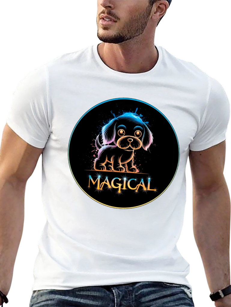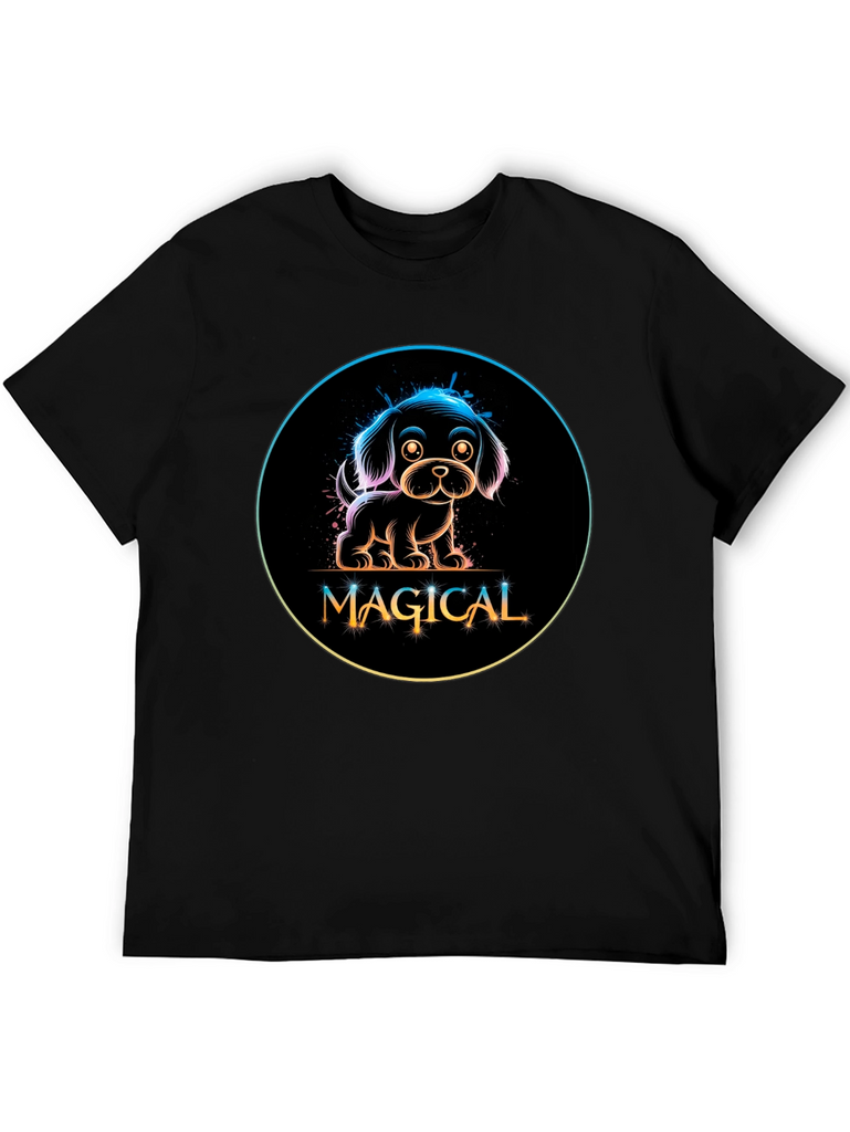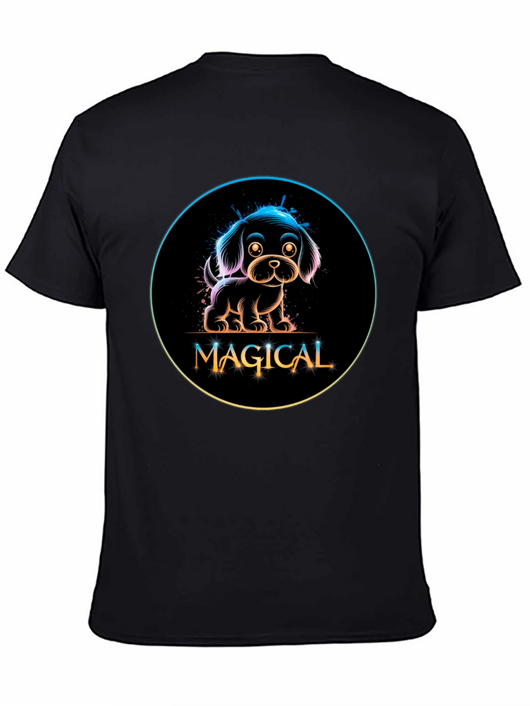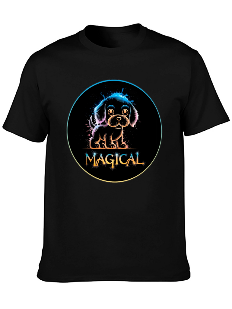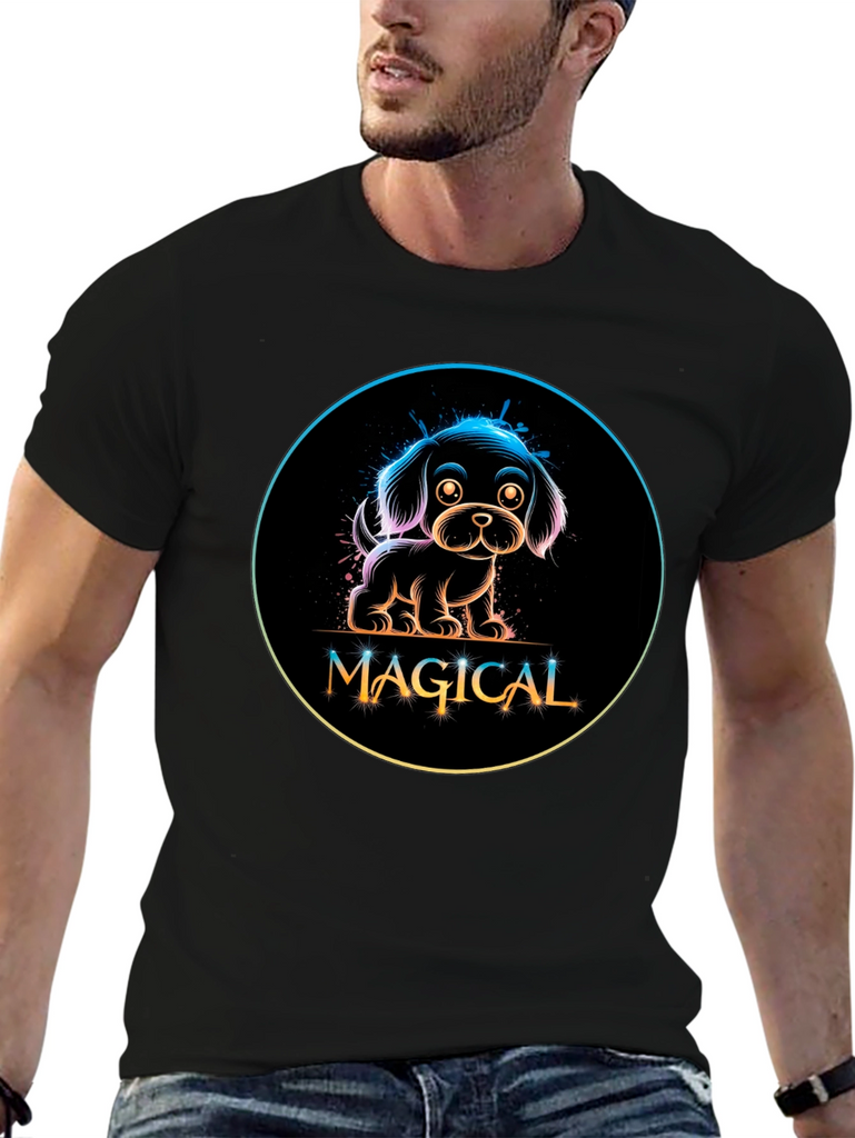 Show off your love for dogs with this adorable black t-shirt featuring a neon-style graphic. The design showcases a charming puppy encircled with a rainbow gradient glow, above the word 'MAGICAL' in a stylish, playful font. Made from a comfortable material, this tee is perfect for casual wear, dog walks, or as a fun conversation starter. Its unique design makes it a standout piece, ideal for dog lovers and those who appreciate whimsical, eye-catching fashion. Add a touch of magic to your wardrobe today!