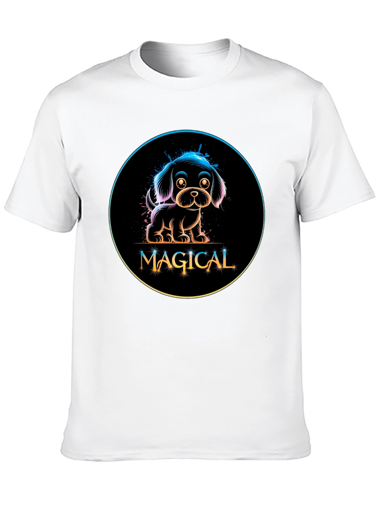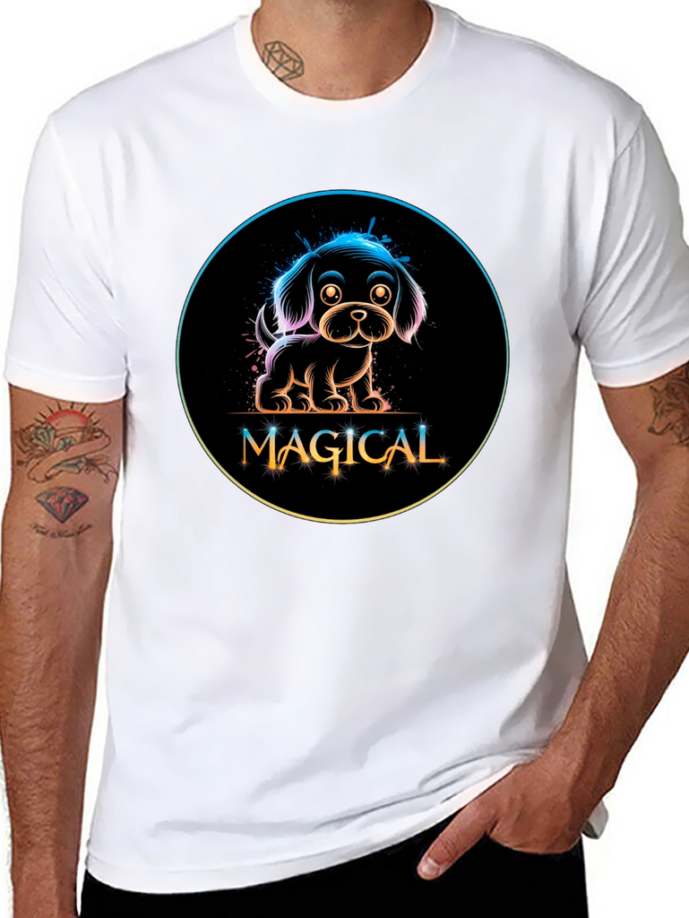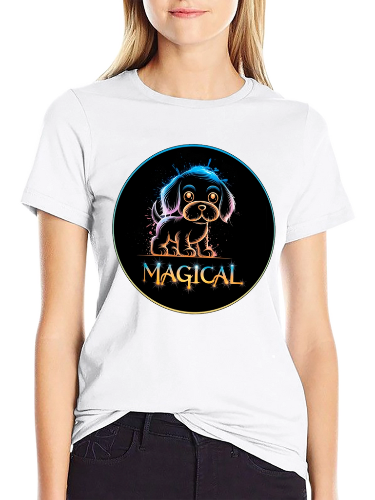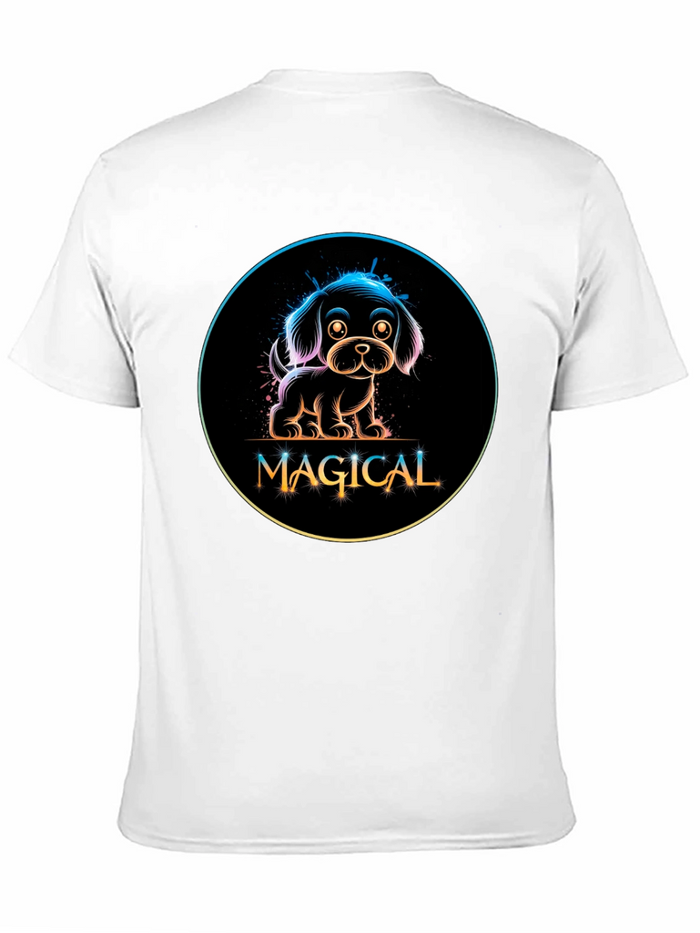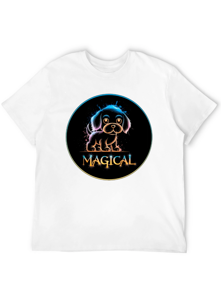 Show off your love for dogs with this adorable black t-shirt featuring a neon-style graphic. The design showcases a charming puppy encircled with a rainbow gradient glow, above the word 'MAGICAL' in a stylish, playful font. Made from a comfortable material, this tee is perfect for casual wear, dog walks, or as a fun conversation starter. Its unique design makes it a standout piece, ideal for dog lovers and those who appreciate whimsical, eye-catching fashion. Add a touch of magic to your wardrobe today!