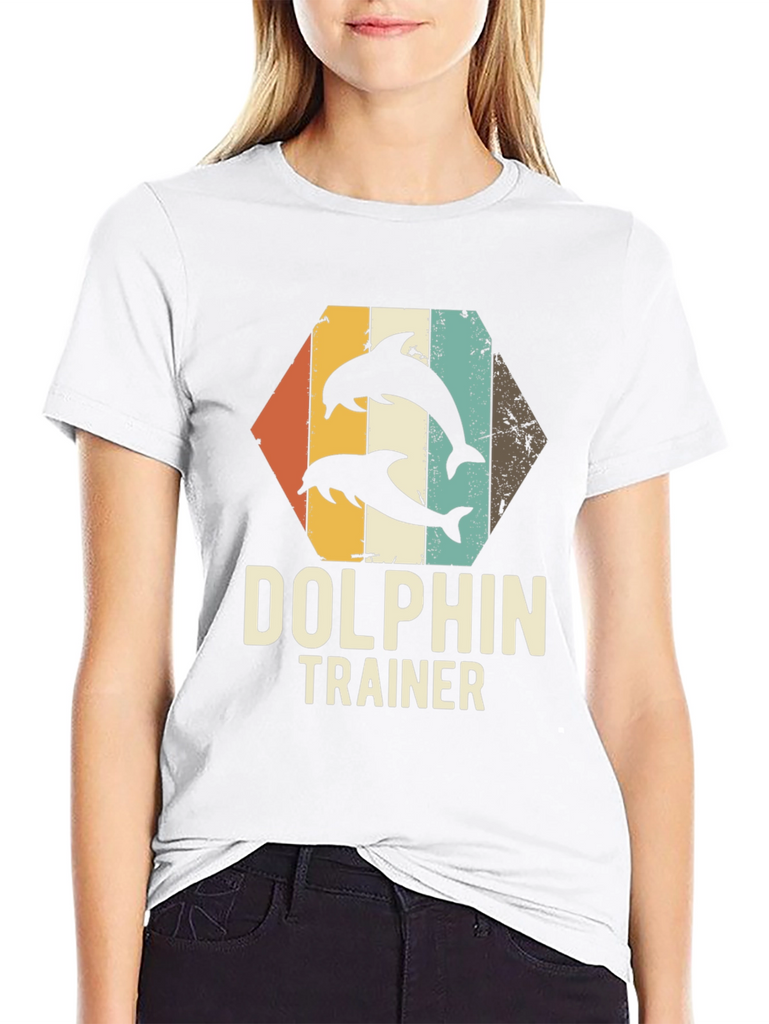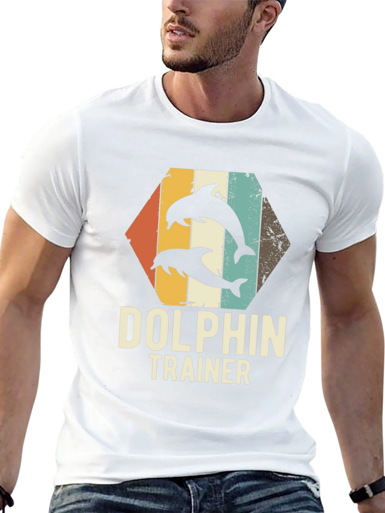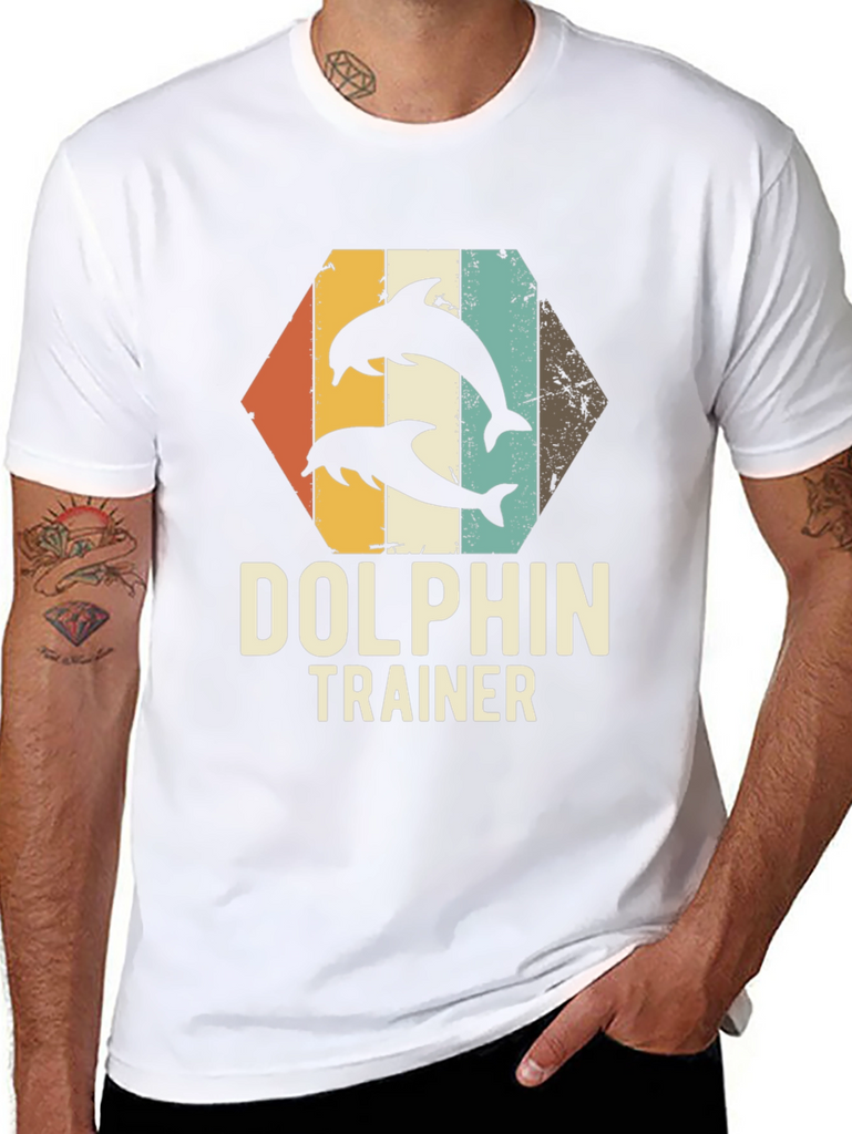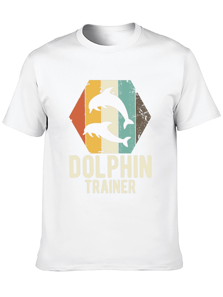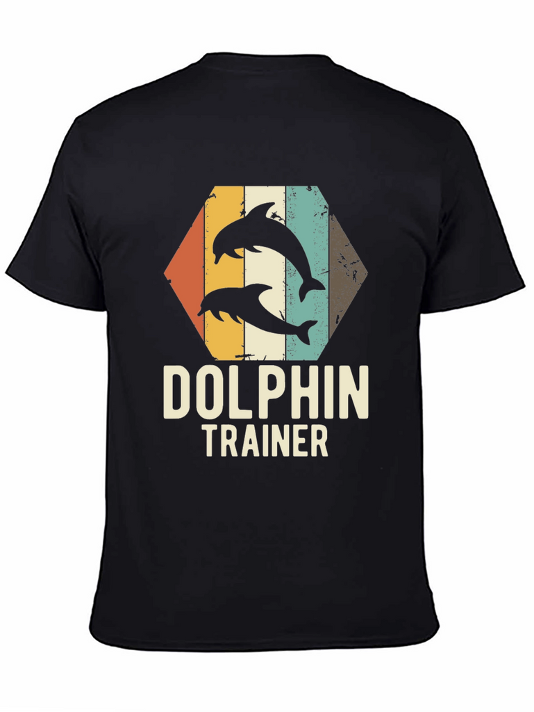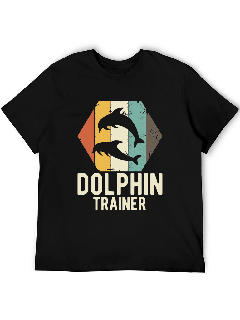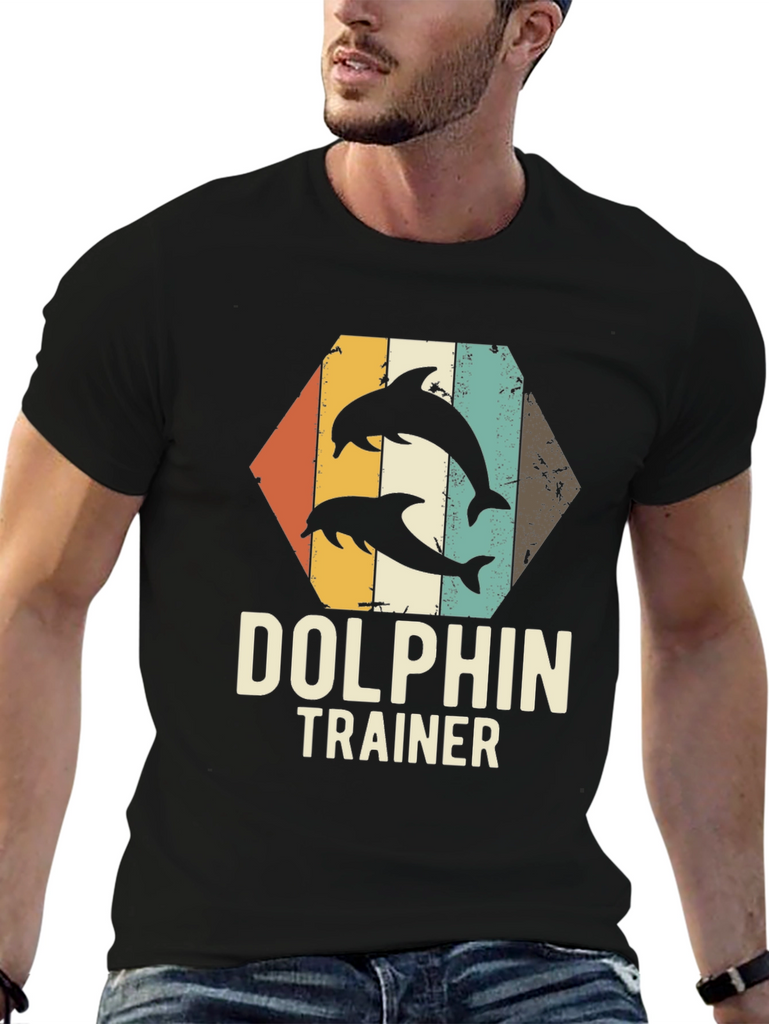 Showcase your love for marine life with this unique 'Dolphin Trainer' graphic t-shirt. Made from a comfortable, dark fabric, this tee features a retro-style hexagonal design with silhouettes of two playful dolphins. The distressed texture adds a vintage appeal. Ideal for casual wear, marine enthusiasts, or anyone who appreciates a cool, statement piece. Wear it to the aquarium, beach, or just around town to express your passion for dolphins.