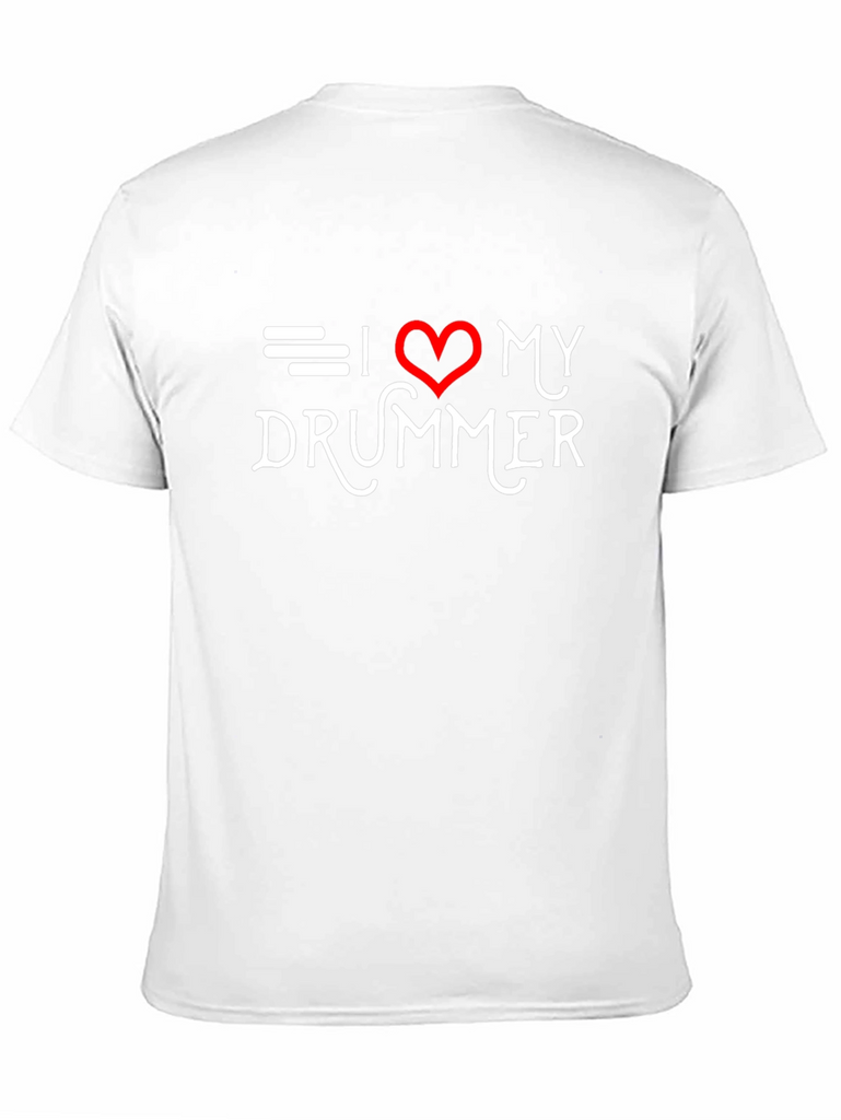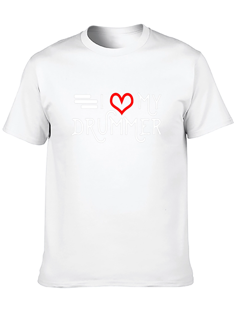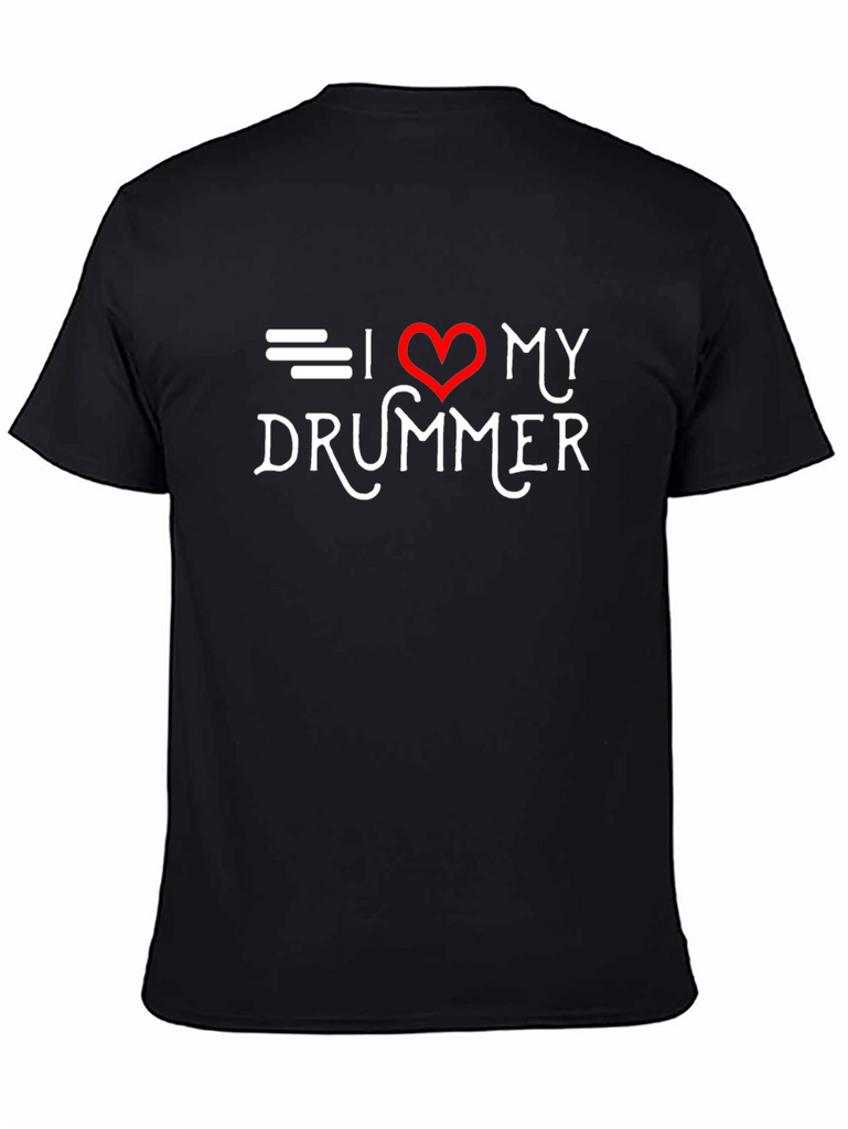 Show your love for your favorite drummer with this stylish black t-shirt. The shirt features a playful design with the phrase "I (Heart) My Drummer" in a combination of white and red fonts. The heart replaces the word "love," adding a touch of personality to the design. Made from comfortable material, this shirt is perfect for casual wear, concerts, band practices, or just lounging around. It’s a great gift idea for drummers' significant others, friends, or family members who support their musical passion. Grab this unique t-shirt and wear your support proudly!
