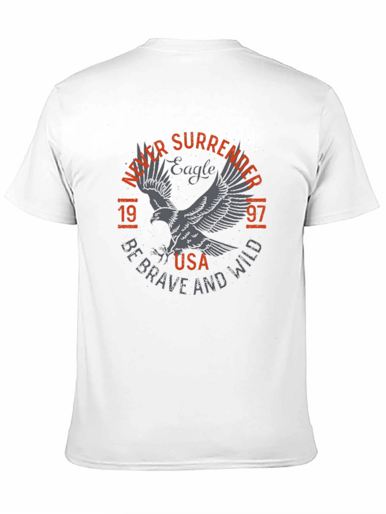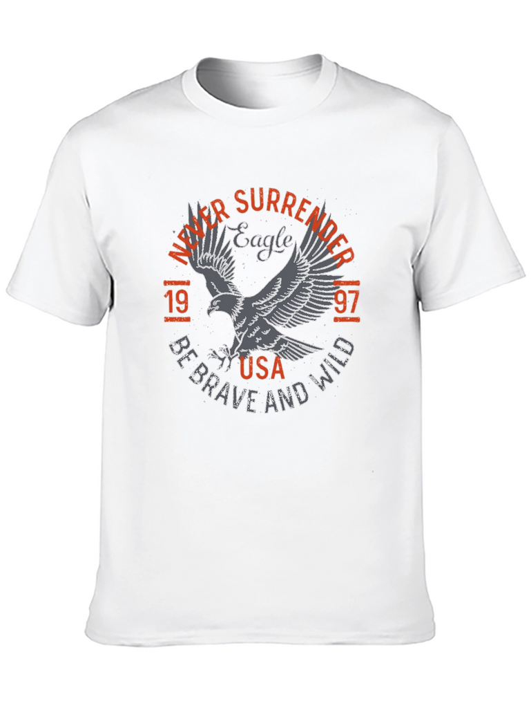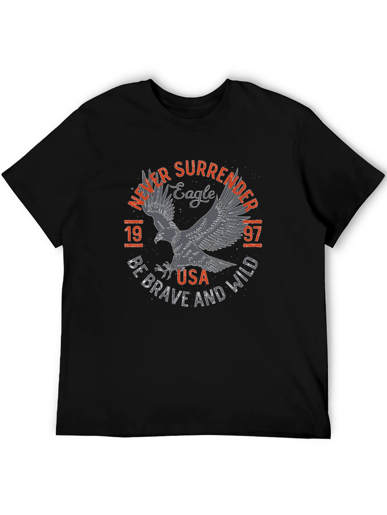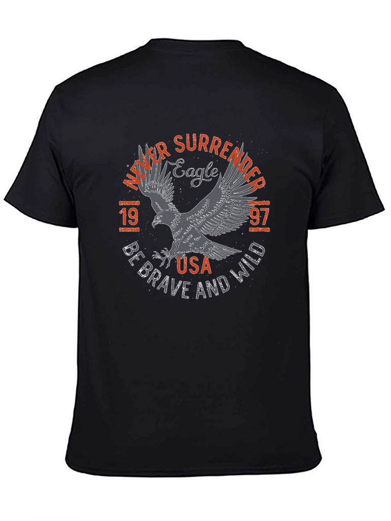 Show your American pride with this bold graphic tee. The shirt features a striking eagle design with the inspiring phrase "Never Surrender" alongside "Be Brave and Wild". Numbers "19" and "97" also add to the design. Made from soft, breathable black fabric, this tee is comfortable for all-day wear. The design is eye-catching and makes a great statement. Perfect for casual outings, patriotic events, or everyday wear. This durable t-shirt will quickly become a favorite in your wardrobe. Show off your love for your country and embrace the spirit of freedom with this unique t-shirt!
